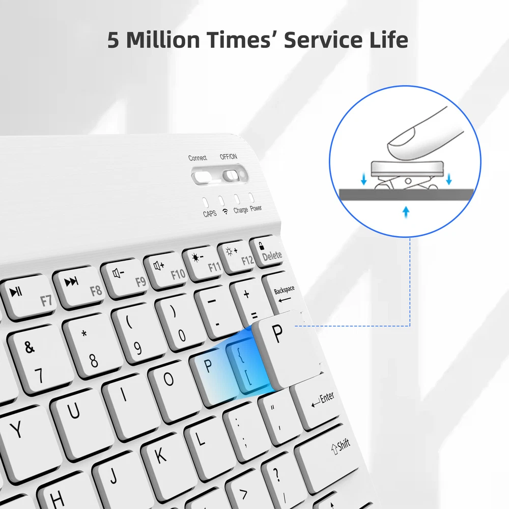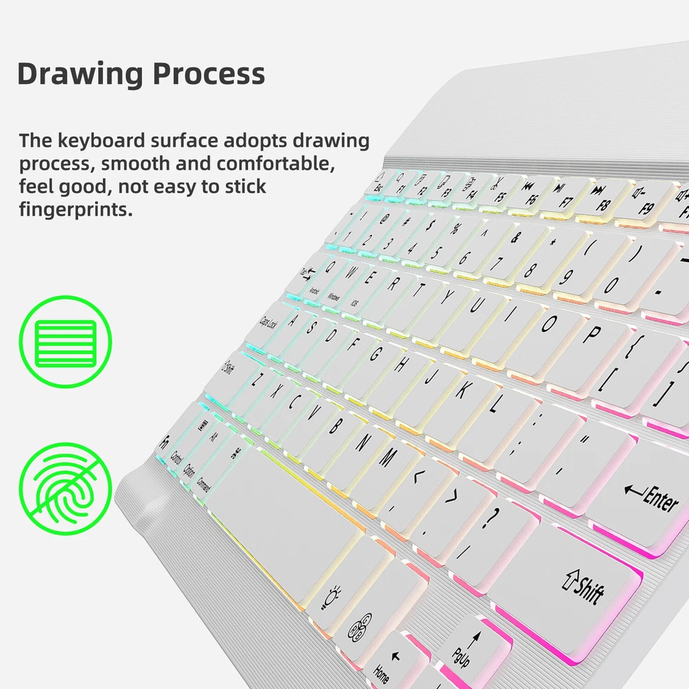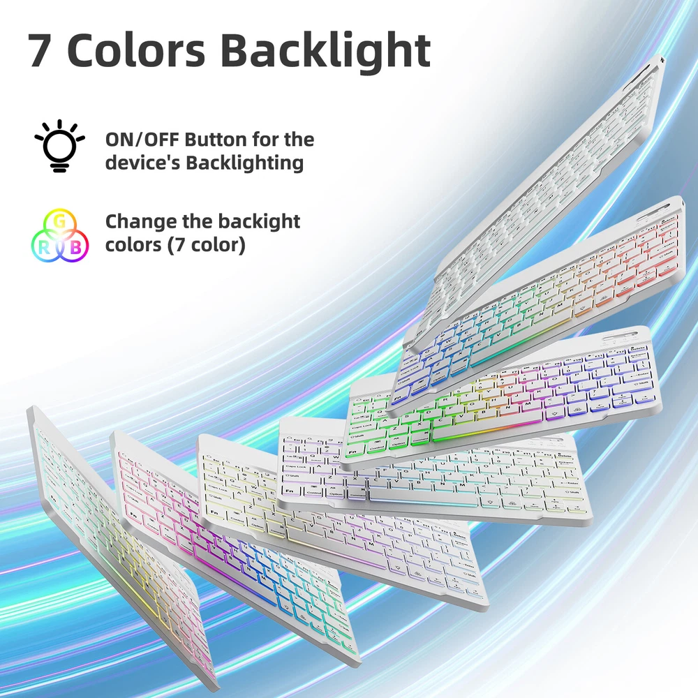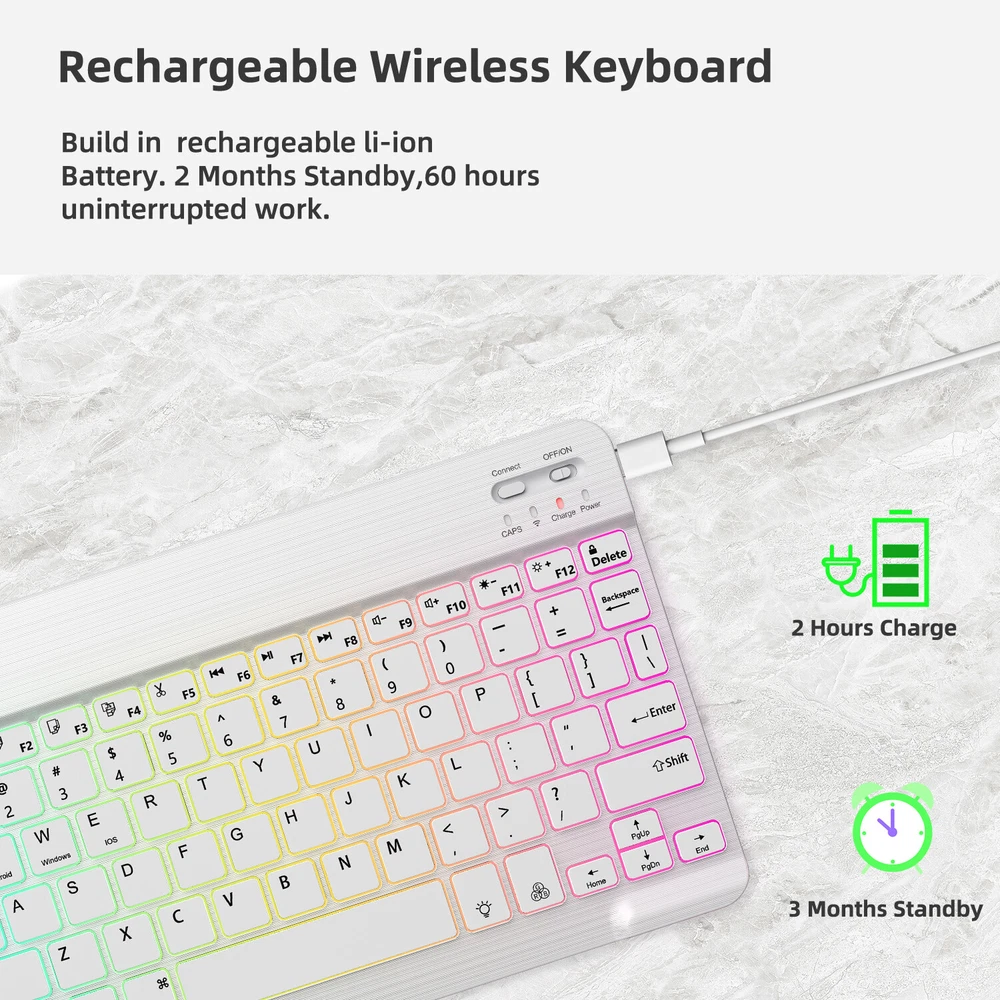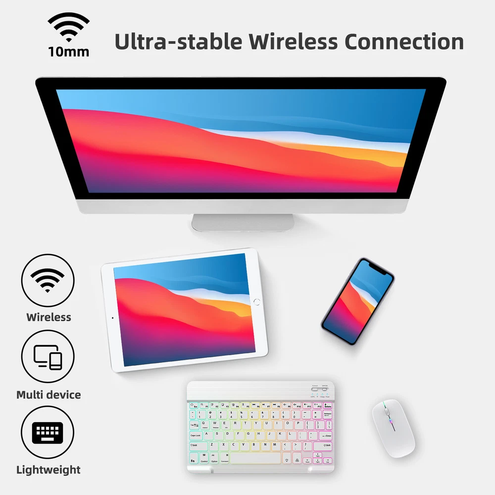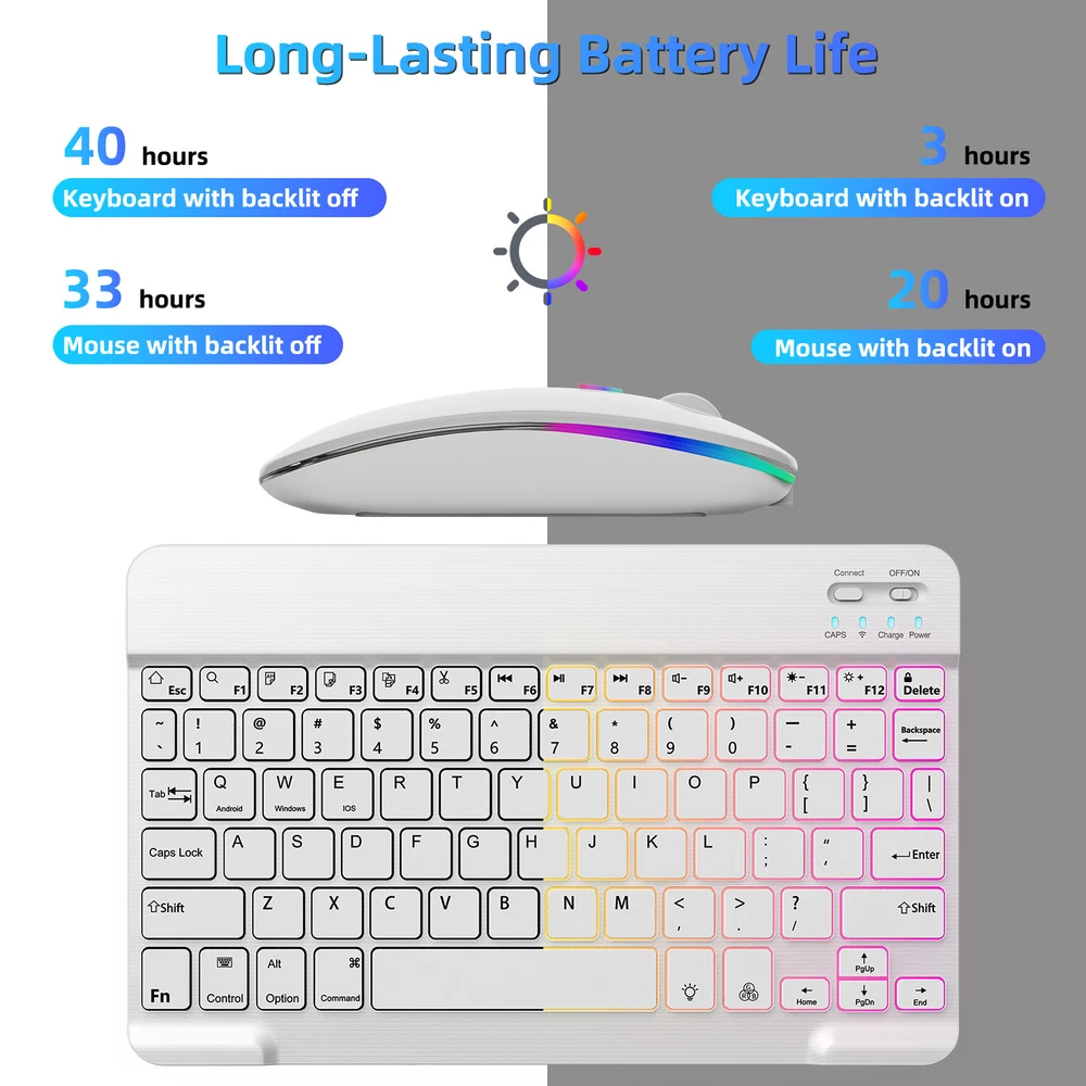 Bluetooth Keyboard and Mouse Combo for iPad - Rechargeable Wireless Keyboard Feature (Keyboard & Mouse): 【 Premium Durable Quality 】ABS plastic material with Keystrokes life up to 10 million times. 【 Rainbow Color Keyboard & Mouse 】This backlit bluetooth keyboard has 7 switchable backlight colors, It helps you to type easily in the absence of light. 【 Built-in Rechargeable Battery 】Power consumption is very small, with a long battery life. 【 Stable Connection 】Advanced Bluetooth-compatible technology provides a cable-free connection within a 10-meter (33ft) working range. 【 Intelligent power management system 】multi-mode power saving function, support PC standby wakeup, connectionless auto sleep without action. 【 Ultra-thin and Lightweight Design 】Ultra-thin wireless keyboard and mouse combo, you can put the keyboard and mouse in your briefcase, handbag or backpack at will. 【 Silent keyboard and silent mouse 】The small light weight keyboard is designed with scissors switch, which allows you to have a comfortable and quiet typing experience. 【 Dual Mode: BT 5.0 + 2.4GHz 】The cordless mouse allow to switch between two devices. Note: Bluetooth mode and 2.4G mode can not be used at the same time. 【 Wide Compatibility 】The Bluetooth keyboard and mice support iPad OS, iOS, Android and Windows operating systems. And compatible with apple iPad 10th 9th 8th 7th generation 10.9/ 10.2 inch, iPad Air 5th 4th gen 10.9", iPad Pro 12.9 inch 6th 5th 4th gen, iPad Pro 11 inch 4th 3rd 2nd gen, iPad 6th 5th 9.7 inch, iPad mini 6 5, iPhone 14 13 12 11 Pro Max, Samsung galaxy tab tablet smartphone cell phone Google Pixel Surface and other Bluetooth enabled mobile device. Product Specification: Materia: ABS Dual Mode: Bluetooth 5.0 + 2.4GHz (USB) Wireless Distance: 10 Meters/33ft Tracing System: Optical Operating System: Windows, MAC OS and Linux ect. Built-in Rechargeable Battery: 500mAh Operating Voltage: 3.7VDC (Built-in lithium polymer battery) Operating Current: <5mA Standby Current: 1.0mA Sleep Current: <0.25mA Package Included: $23.95 For 1 x Wireless Keyboard & Mouse $6.95 For 1 x Mouse Pad