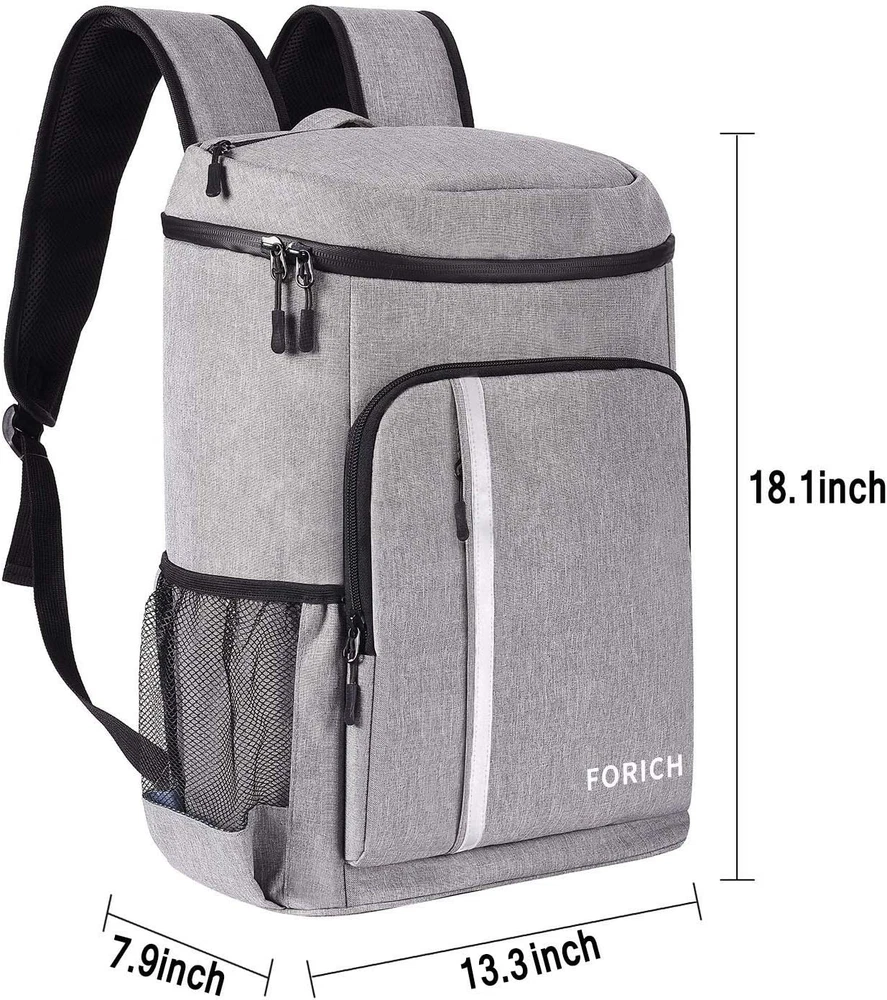 LARGE CAPACITY: 30 Cans/30L, Measures: 18.1”x13.3”x7.9”. FORICH insulated cooler backpack has enough space for all your necessities. LEAKPROOF COOLER BACKPACK: Upgraded inner insulated thicken material and leak proof liner retains drinks/food cold or hot for many hours and anti-leaking. The interior lining is made of excellent upgrade material and easy to clean. LIGHTWEIGHT & DURABLE: FORICH large backpack coolers made of heavy duty durable fabric, never rip, tear or scratch but also lightweight. High quality zipper is easy to pull smoothly. Adjustable shoulder straps and ergonomic design with padded sections on the back for comfortable and soft. MULTI PURPOSE: FORICH soft cooler bag waterproof is a great partner for outdoor activities. It is not only can be a insulated picnic backpack, but also beach cooler backpack, hiking backpack, camping backpack, fishing bag, travel backpack and so on. MULTIPLE POCKETS: 1 main large soft coolers insulated leak proof storage compartment for drinks or food, 2 large zipper pocket in front for your dry items, and 1 zipper pocket on the lid used to organize small items, 2 plus large mesh side pockets which are perfect space for tall beverages or water bottle. 1 beer opener and 1 mesh pocket for phone on the strap. Perfect awesome cooler backpack! FORICH Cooler Backpack Insulated Cooler Backpack Bag Lightweight Soft Beach Cooler Backpack for Men Women to Work Picnics Camping Hiking Park Day Trips, 30 Cans Essential companion for your outdoor activities! Forich backpack cooler backpack is a perfect partner for you to enjoy a outdoor picnic with your family, or attend a party with friends. Roomy enough to organizer things: This cooler backpack large enough to provide roomy capacity keep all your things organized. Capaticy: 30 cans/30L, Measures: 17.7”x13.3”x7.9”. Durable & Lightweight & Comfortable : Forich lightweight insulated backpack cooler made of heavy duty durable fabric, also inner thicken foam insulation and high quality heat-sealed leak proof lining work together to make the large backpack cooler anti-leaking and cool/hot fresh. 100% resistant. The stylish soft cooler bag designed with adjustable shoulder straps and breathable mesh back pads, which make sure comfortable and ergonomic. The insulated cooler backpack is convenient to carry with top handle. Multi Purpose insulated backpack: This backpack with cooler is a multi purpose backpack. The soft backpack cooler is a good choice to be beach cooler backpack, picnic backpack, hiking backpack, camping backpack, fishing bag, travel backpack and you can also used to work, weekend or park day trip.