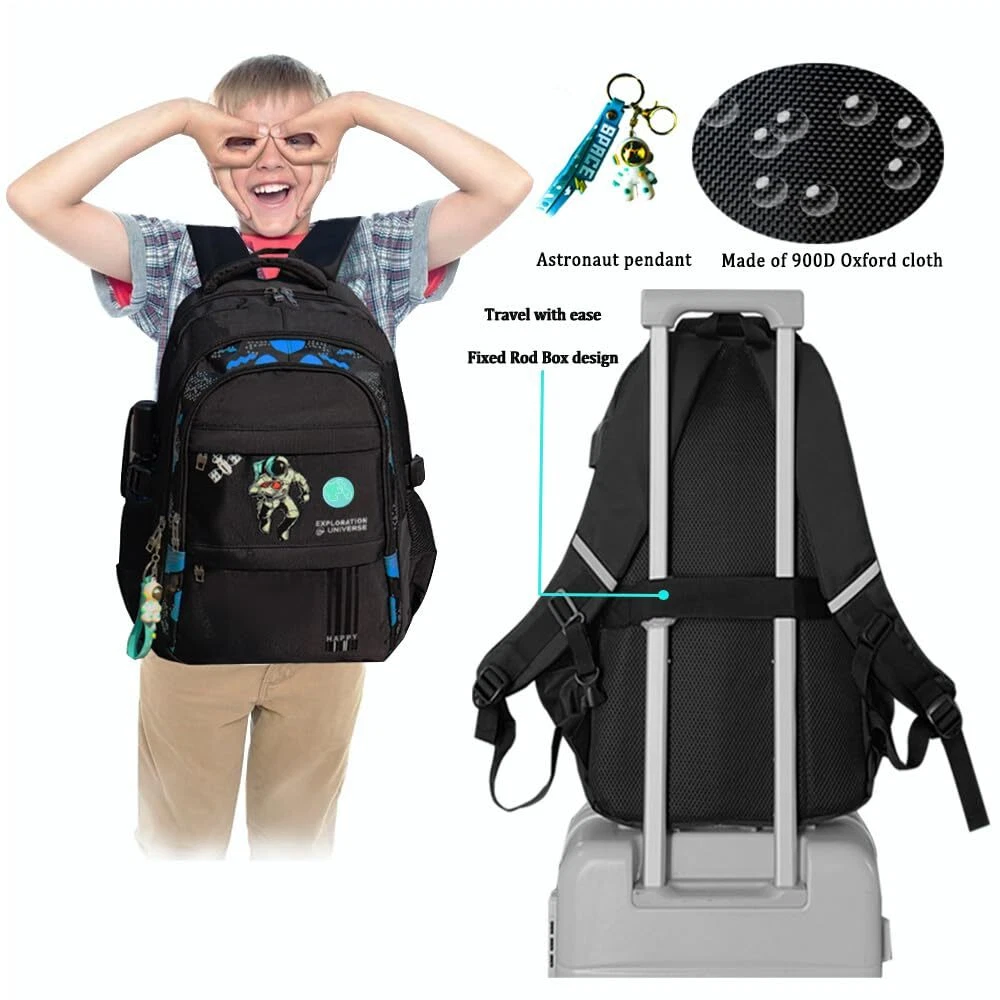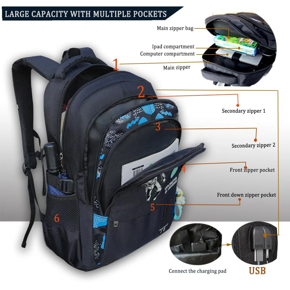 Description Space Backpack.Anime Cartoon Luminous Backpack with USB Charging Port, Headphone port.Water Resistant.Large Capacity Laptop Back Pack,Glow-In-The-Dark Backpack.With Anti-Theft Lock.Astronaut Pendant Astronaut Pendant 1.LUMINOUS BACKPACK:Boys backpacks for elementary school with High quality oxford fabric water repellent fabric; does not fade, odorless, environmentally friendly and healthy. this can protect your inner things from drizzling.,backpacks teens The best part of this anime backpack is after absorbing light in the day about 10-20 minutes, you can see the fluorescent effect in the dark and it can keep about 4-6 hours.boy backpack it is safer to walk at night 2.ERGONOMIC DESIGN: school backpack boys Meet the ergonomic design widened s-shaped cellular mesh adjustable shoulder strap you can adjust its length to suit your height and body construction. ease the pressure on the shoulder, thickened back pad high breathable mesh design, backpack school effective protection of the spine, not stuffy, back more comfortable 3.LARGE CAPACITY ;this back-to-school set there are 3 large capacity main bags and 2 front pocket and 1 ipad compartments ,anti theft backpack 1 the large main compartment fits a 15.6inch laptop ,2 front pocket which can hold pens, keys, small notebooks and other small items, 2 Side pockets, can hold any size of cup, space Backpack compartment that is great to put your folder ,Camouflage pattern is sutable for boys.fashion and personality make you stand out from the crowd 4.USB DESIGN: Astronaut backpack built-in USB port is convenient to charge your electronic devices with ease while on the go. There is not only a USB port, but also a headphone port. Put the charging pad in the bag to connect the data cable to charge your electronic device or mobile phone anytime and anywhere. Free Hands, listen to music anytime and anywhere, especially suitable for cycling, trains, hiking, camping, commuting by subway, It's also the perfect birthday present, Christmas present 6.SECURITY PROTECTION: Double-end zipper anti-theft lock combination no more worrying about someone opening your bag while you wait in line valuables were stolen OUR SERVICE GURANTEE FOR YOU:Everything I do is based on customer satisfaction. If you are not comletely satisfied with the purchased product or the product is damaged or broken in transit, please contact us in time. We will solve your problem as quickly as possible!