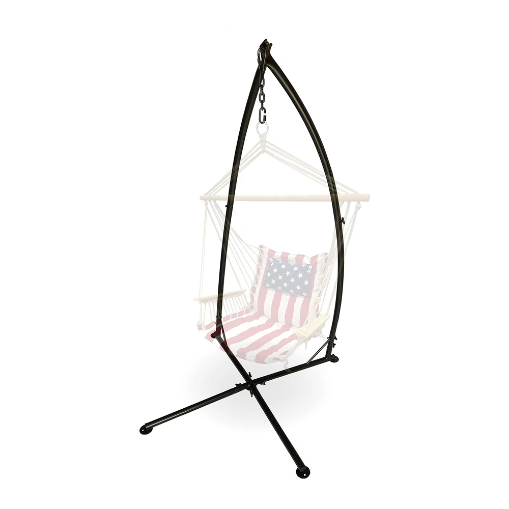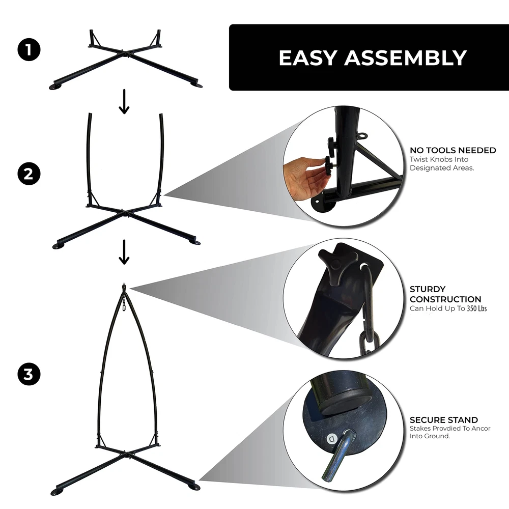 The Backyard Expressions X Base Hanging Chair Frame is a perfect match for Backyard Expressions Hammock Chairs or almost any other kind of suspended seating product. The X shaped base increases the stability of the stand and the 5/8 inch ground stakes easily and safely secure the stand in your yard. This stand now features no hardware assembly, meaning you can leave your tools in the shed. This product can be assembled in a matter of minutes without the use of any tools! Make your patio furniture exciting again with a Backyard Expressions Hanging Chair and Frame. DURABLE STEEL CONSTRUCTION - Rust-resistant coated steel is strong and long lasting both indoors and out. INNOVATIVE STURDY DESIGN - The "X" shaped base is a special design formulated through trial and error to find the sturdiest design to prevent tipping over. 350 LB WEIGHT CAPACITY - Our design offers a higher weight capacity than the industry standard VERSATILE FRAME - The Backyard Expressions hanging chair frame can be used for a variety of different hammock chairs, wicker hanging chairs and egg chairs. If it hangs this will work as the perfect stand for you! EASY ASSEMBLY: Assembly should take less than 10 minutes and take down is even easier. No tools are needed at all. DIMENSIONS: 42" W x 42" D x 82" H WEIGHT CAPACITY: 350 Lbs - The inner tag is labeled 250, but this is a misprint. Actual capacity is 350lbs.