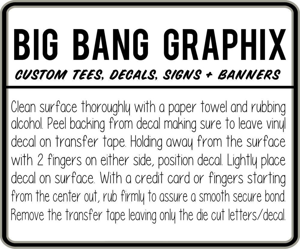 Decals made in & shipped USA: Long lasting Sign Vinyl - 7 yrs Outdoor Rating! Country/Region of Manufacture: United States Type: Decal Suitable For: Car, Caravan, Motorcycle, Trailer, Van, Vehicle Windows Attachment Type: Adhesive Features: Custom Image Theme: Custom Brand: Big Bang Graphix Manufacturer Part Number: Does Not Apply, Not Applicable Finish: Glossy OE/OEM Part Number: Not Applicable Placement on Vehicle: Left, Right, Front, Rear, Upper, Lower, Bumper, Front Door Glass, Front Quarter Glass, Fuel Tank, Hood, Rear Door Glass, Rear Quarter Glass, Rear Window, Side, Tailgate, Windshield Material: Vinyl