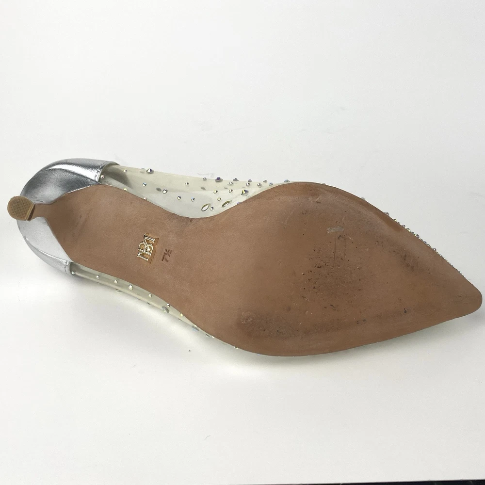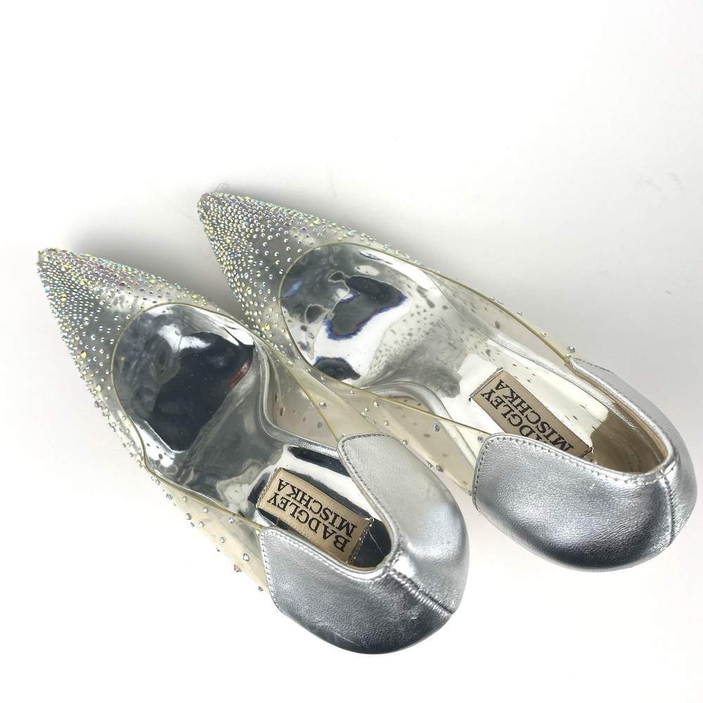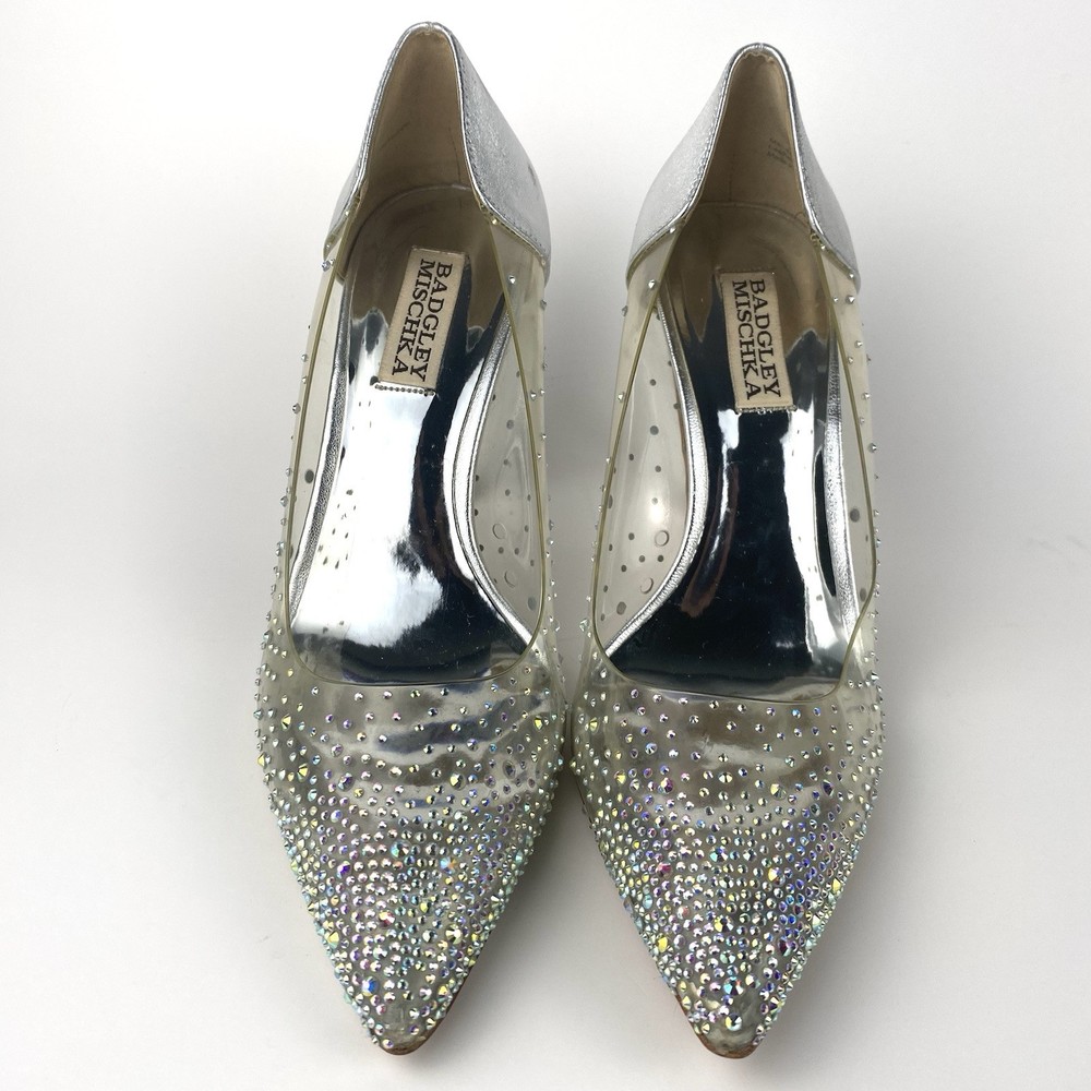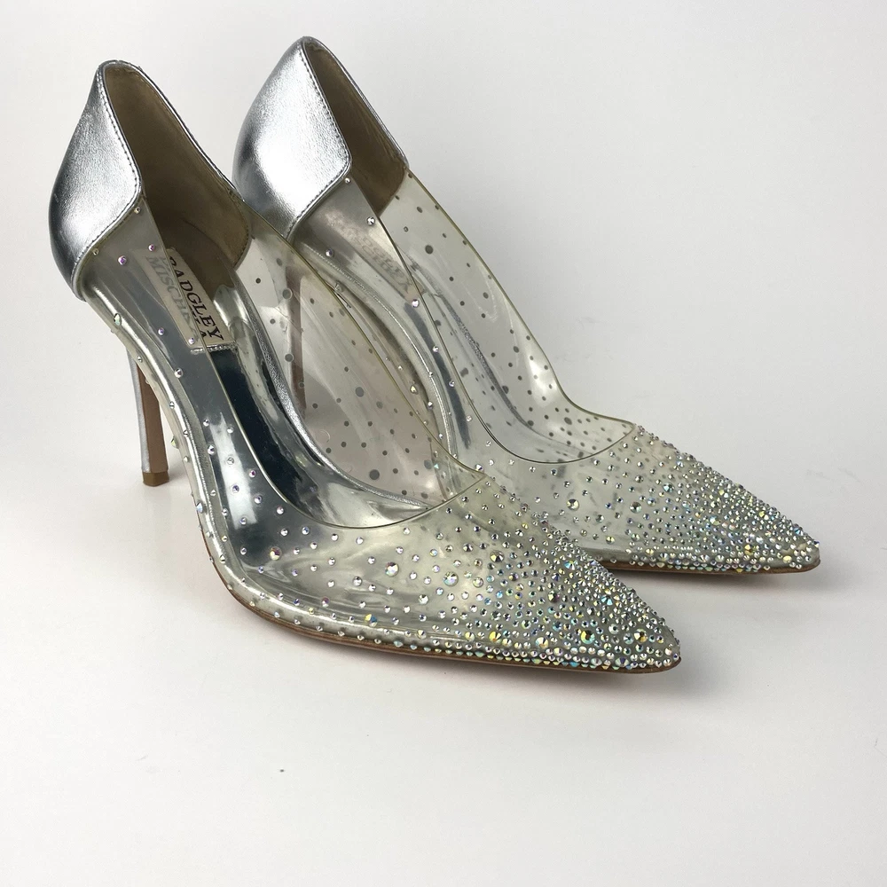 Hollywood glamour.!! Women's size 7 1/2 heels designed by Badgley Mischka, an American fashion label founded in 1988 by Mark Badgley and James Mischka. The brand is known for designs influenced by 1940s Hollywood glamour, with simple and streamlined aesthetics. These heels showcase a pointed-toe silhouette, transparent vamps, and embellishments of rhinestones, evoking a glamorous and elegant style suitable for evening wear or special occasions. Preowned so wear on both back heels and bottoms as shown in pictures.