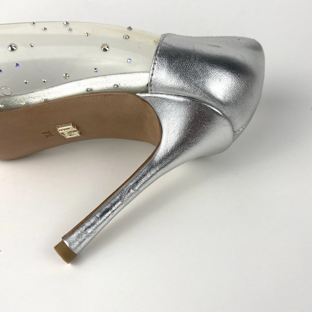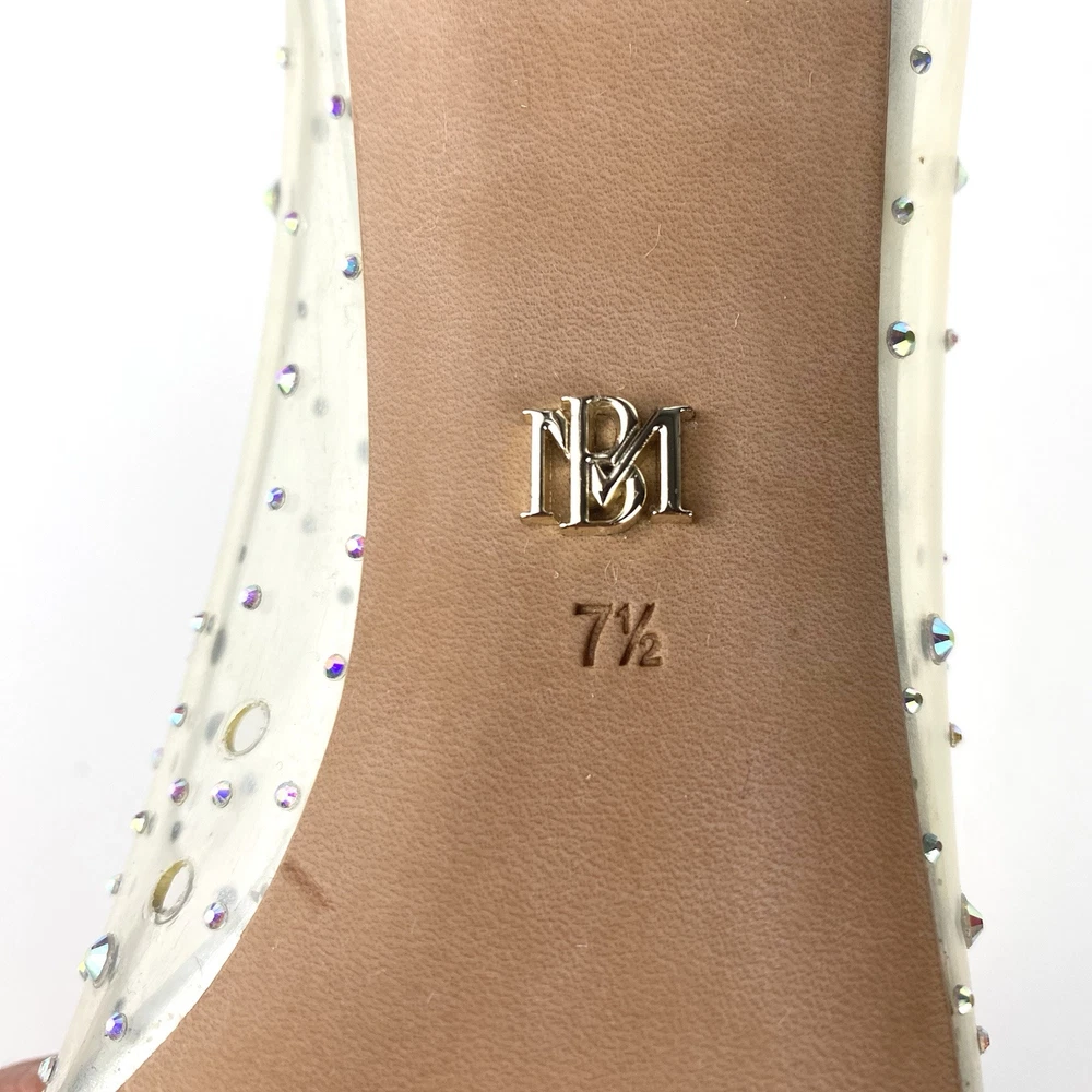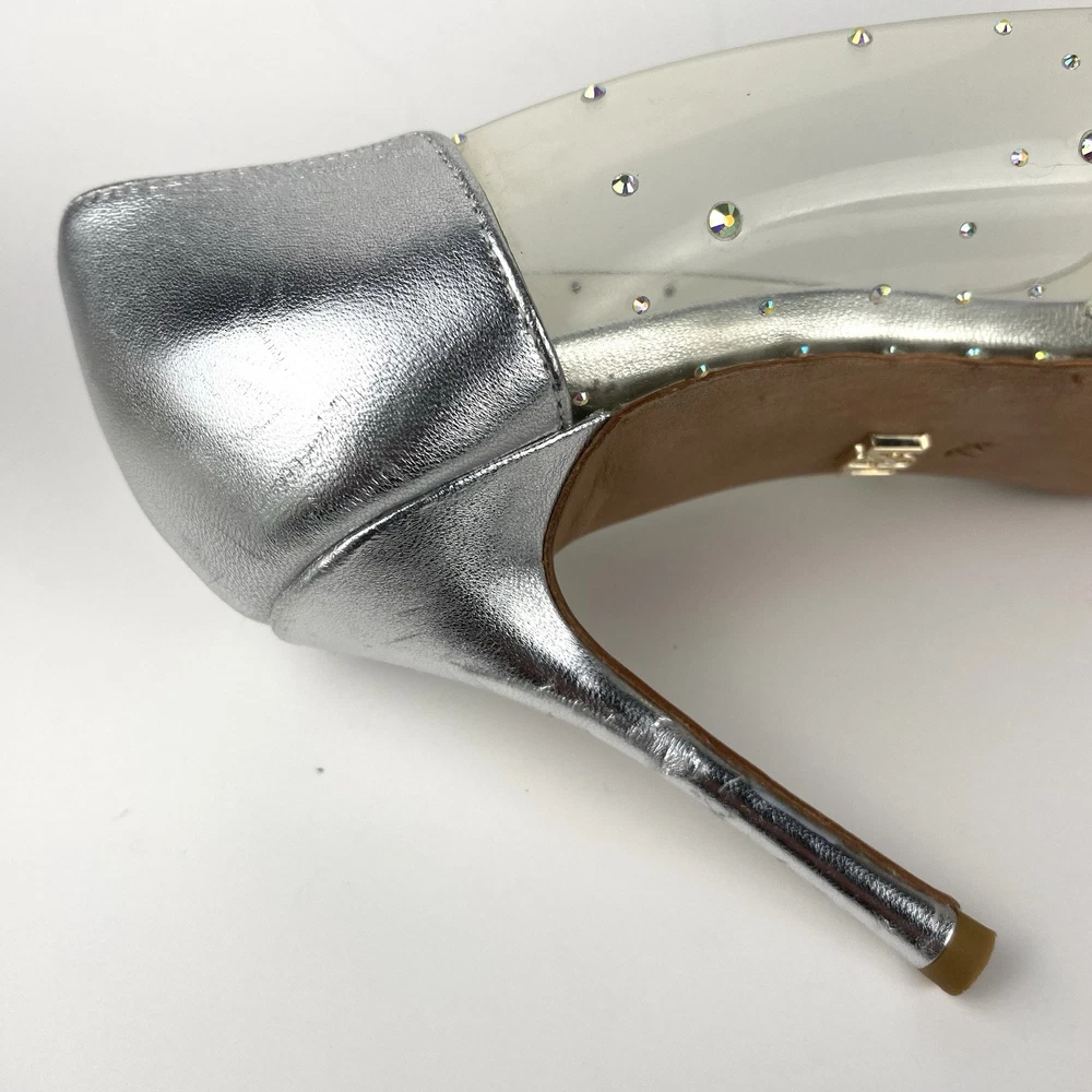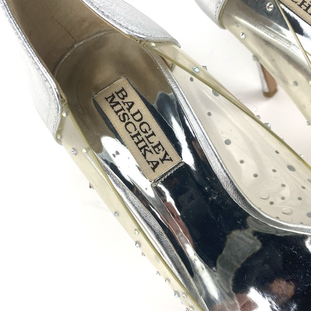 Hollywood glamour.!! Women's size 7 1/2 heels designed by Badgley Mischka, an American fashion label founded in 1988 by Mark Badgley and James Mischka. The brand is known for designs influenced by 1940s Hollywood glamour, with simple and streamlined aesthetics. These heels showcase a pointed-toe silhouette, transparent vamps, and embellishments of rhinestones, evoking a glamorous and elegant style suitable for evening wear or special occasions. Preowned so wear on both back heels and bottoms as shown in pictures.