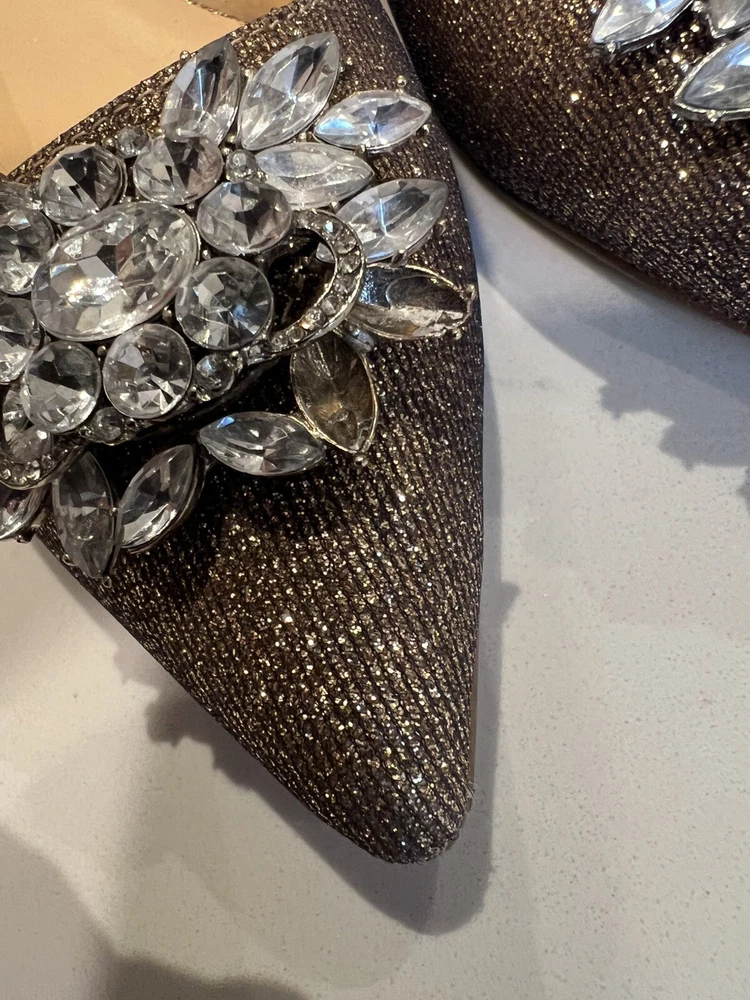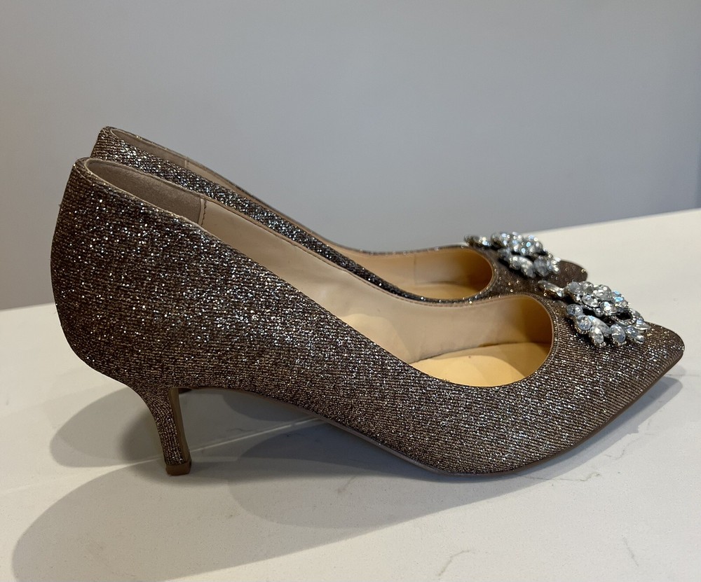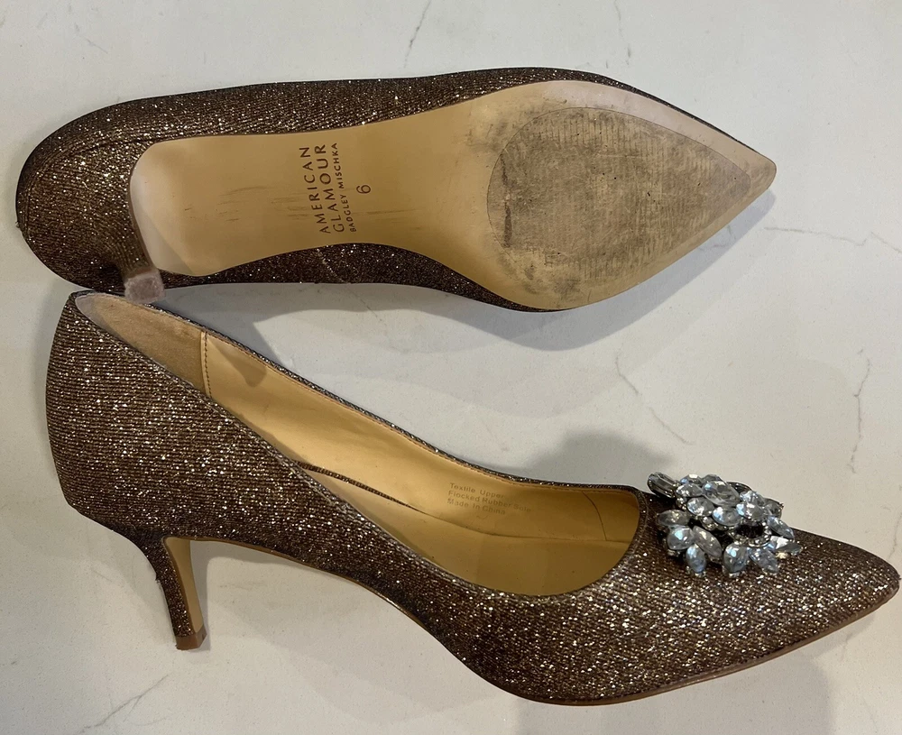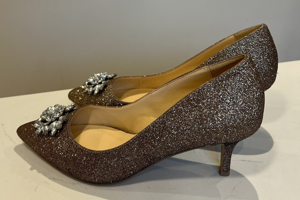 Color: Bronze Toe Shape: Pointed Toe Features: Rhinestone Embellished, Sparkly Pattern: Solid Occasion: Party/Cocktail, Wedding Customized: No Upper Material: Synthetic Model: Embellished Pump Heel Style: Stiletto Vintage: No Department: Women Accents: Rhinestone Theme: Preppy Type: Heel Shoe Width: M Closure: Slip On Lining Material: Leather US Shoe Size: 6 Brand: Badgley Mischka Heel Height: High (3-3.9 in) Style: Pump