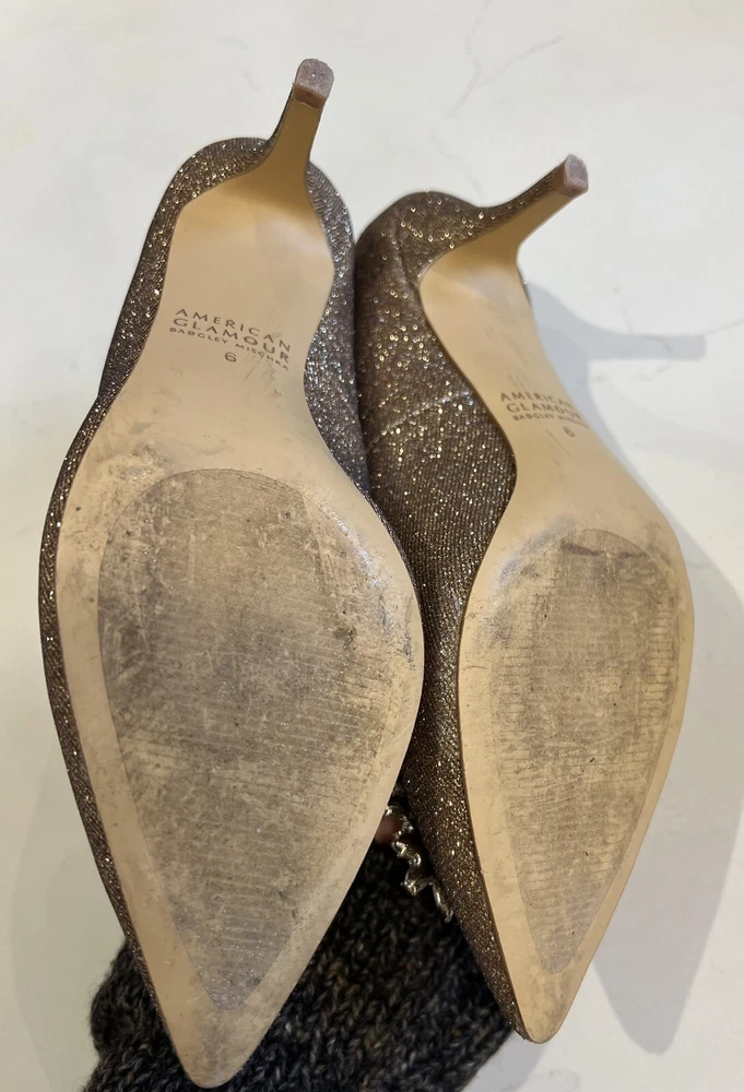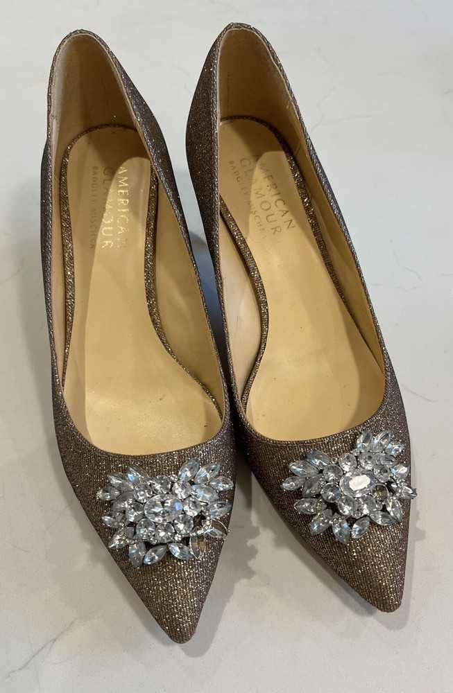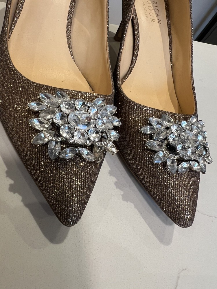 Stunning Badgley Mischka evening heels! The rhinestone embellished pumps have a sparkly bronze color that will catch the eye of anyone in the room. The pointed toe and stiletto heel style add an elegant touch, while the slip-on closure makes them easy to wear. Worn once, several beads are missing, barely noticeable. These preppy pumps are perfect for any special occasion, whether it's a wedding or a cocktail party. They are available in US shoe size 6 and EU shoe size 36 with a medium shoe width. The upper material is synthetic, while the lining material is leather. The heels have a height of 3”, making them the perfect height for a night out.