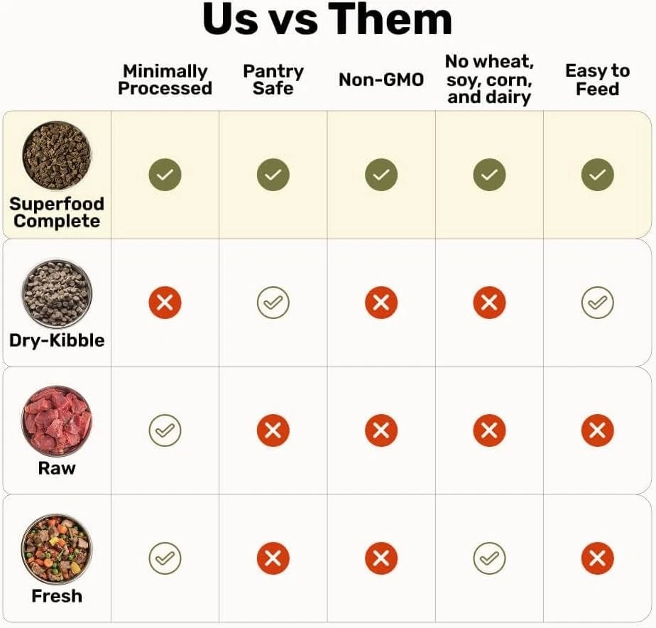 Give your dog complete and balanced nutrition with this Superfood Complete recipe, carefully prepared using low-temperature air-drying to help retain essential nutrients and flavor. Made with a high percentage of real chicken, organs, and salmon, it delivers a protein-rich meal designed to support overall health and vitality. Blended with nutrient-dense vegetables, seeds, and superfoods, this formula supports digestion, skin health, and immune function without the use of fillers like corn, wheat, soy, or by-products. Made with responsibly sourced, cage-free chicken, it provides a clean and wholesome feeding option. Easy to serve with no refrigeration or preparation required, simply measure and pour for a convenient daily meal. Available in multi-pack options, it offers great value while ensuring your dog always has access to premium nutrition.