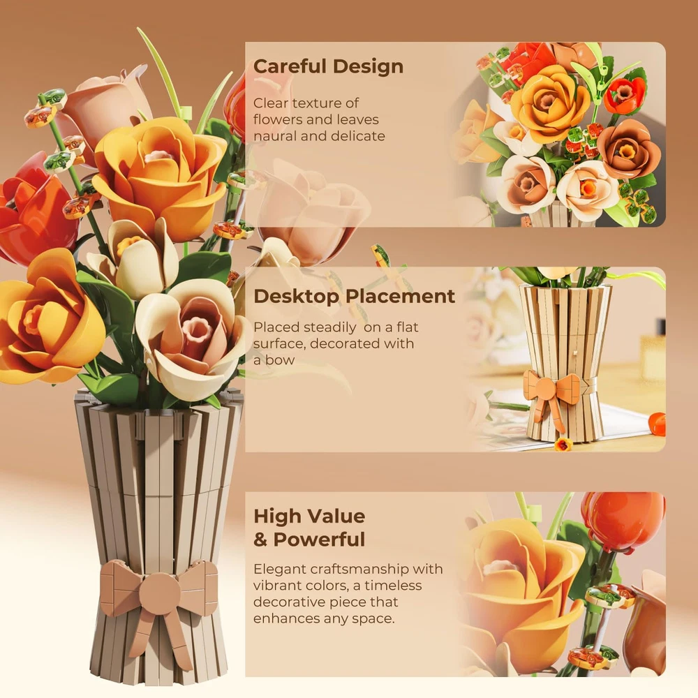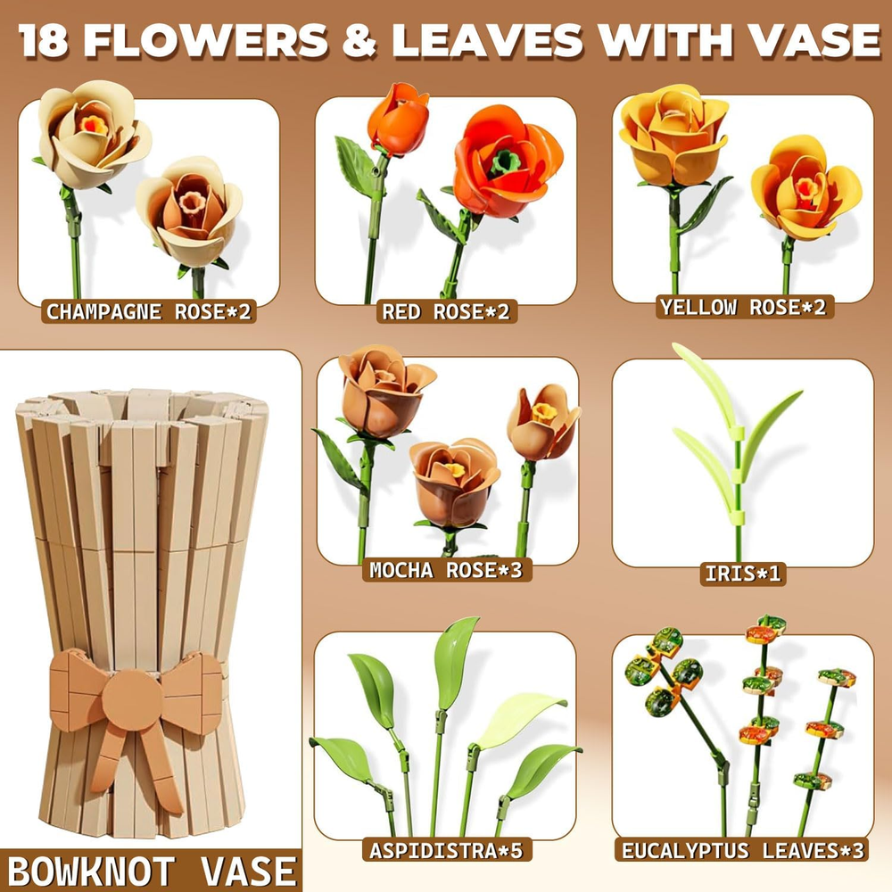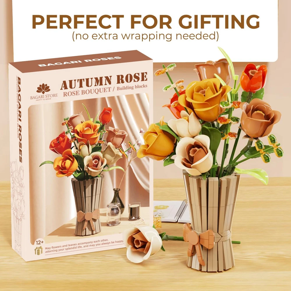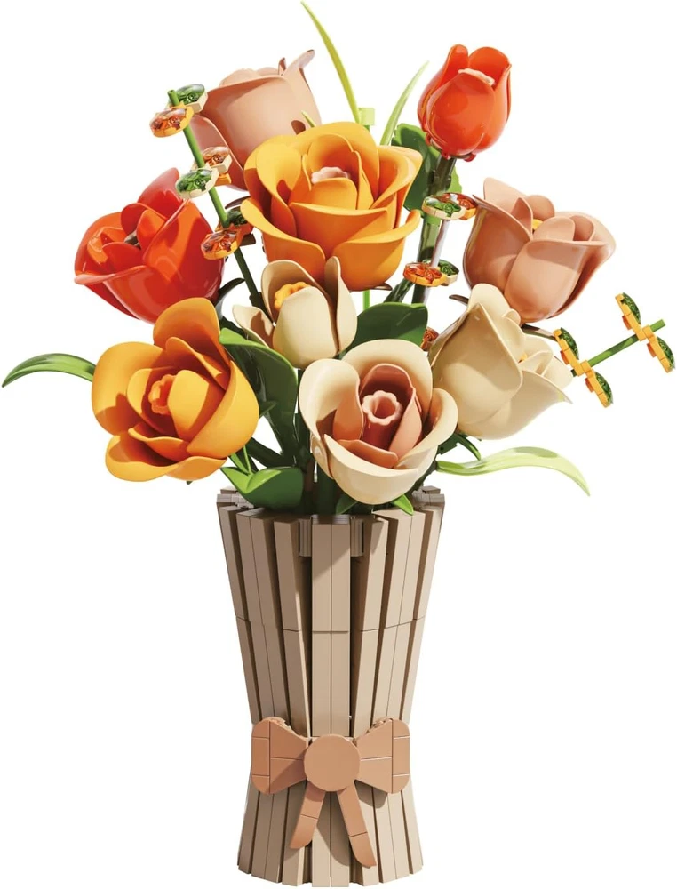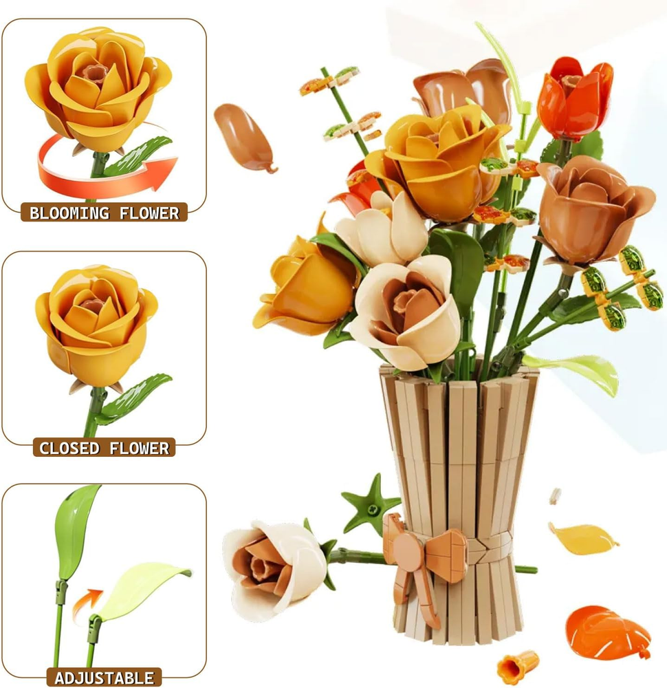 Bagari Roses Bouquet Building Blocks Set with Vase - Artificial Flowers for Creative Play