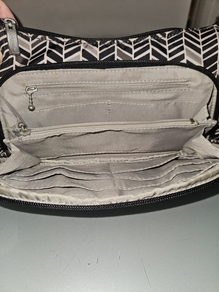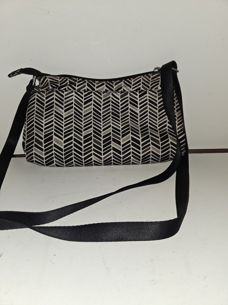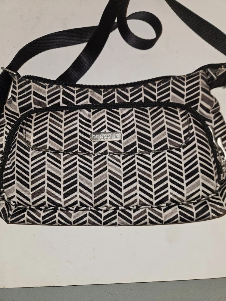 Baggallini Small Crossbody w Front Zip Wallet Pouch, Multiple Pockets~Black/Gray. Condition is Pre-owned. Shipped with USPS Ground Advantage.
