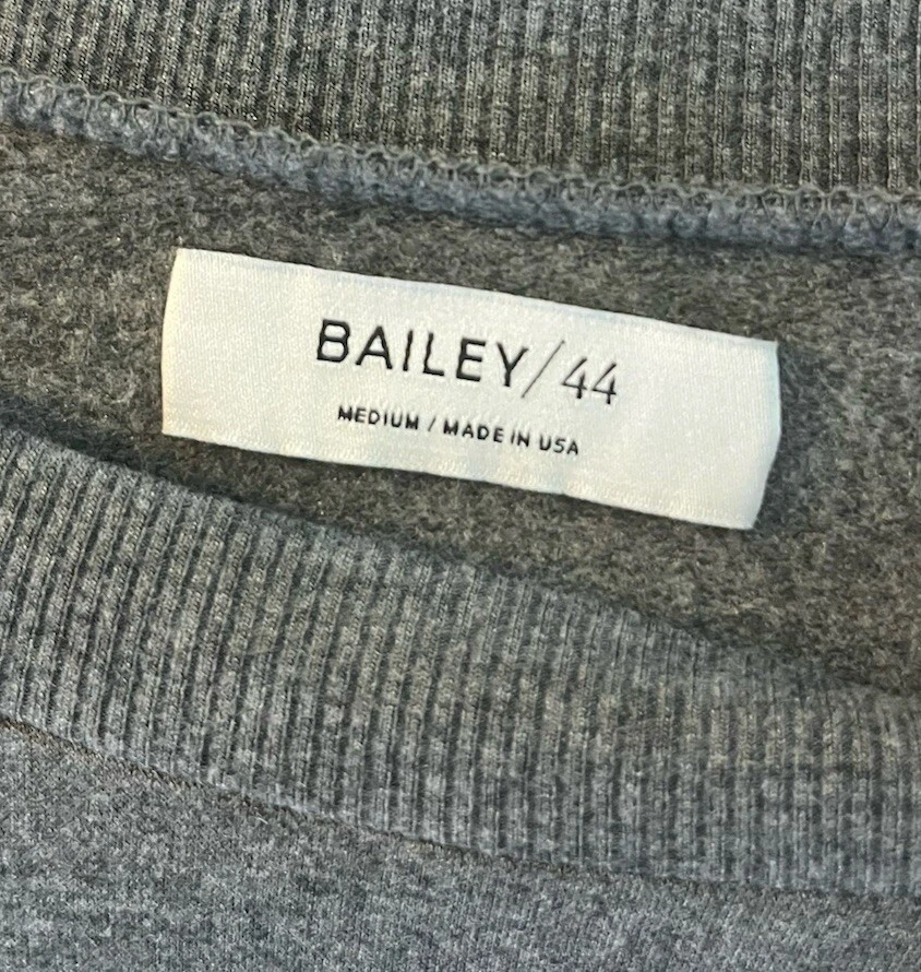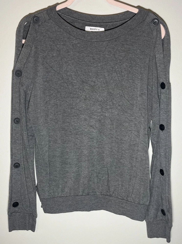 Preowned Bailey 44 top with buttons on sleeves in a size Medium. Great condition. Length 26 in PTP 19 in This Bailey 44 blouse is a perfect addition to your wardrobe. The lightweight and comfortable material is a modal blend with spandex, making it perfect for any season. The gray color and solid pattern make it versatile for any occasion, whether it's casual, workwear, or a party. The round neck and button accents add a touch of designer style, while the tunic shape and long sleeves provide comfort and practicality. This blouse is made in the United States and is available in size medium.