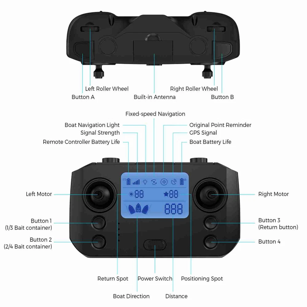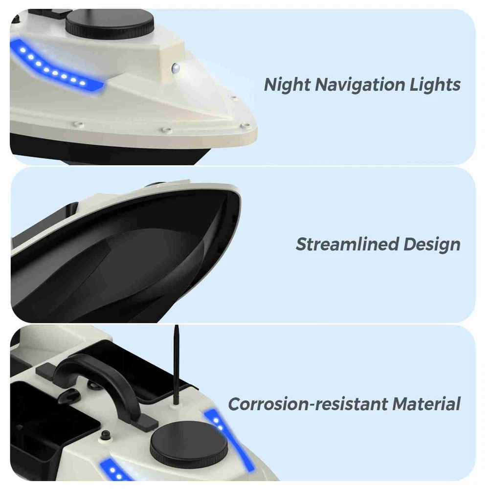 Feature: 1. GPS function allows you to set 99 baiting spots, making it easier to return to your favorite locations. 2. With remote control range up to 500 meters, you can maneuver the boat to your desired fishing spot without ever leaving the shore. 3. Correct navigation route automatically and keep sailing in a straight line even in the waves. 4. This fishing feeder boat can hold up to 2kg of bait, allowing you to cover a larger area and attract more fish. 5. 5200mAh / 12000mAh rechargeable battery for long working life. The boat automatically returns in low battery. 6. Front and rear lights provide increased visibility at night, very convenient for night fishing. 7. Fully enclosed design ensures that it can withstand harsh weather conditions and rough waters. 8. Comes with a storage bag for easy transportation. Specification: Colour: Yellow / White&Black (Optional) Battery Capacity: 5200mAh / 12000mAh (optional) Working Time: Approx. 2 hours (5200mAh); Approx. 4 hours (12000mAh) Remote Range: About 500m Material: ABS + Metal Maximum Load: 2kg / 4.4lb Size: 54 * 27 * 21cm / 21.2 * 10.6 * 8.3in Boat Weight: 1.75kg / 3.8lb Package List: 1 * Fishing Bait Boat 1 * Remote Control 1 * Antenna 1 * Battery for Boat 3 * Battery for Remote Control 1 * Battery Charger 1 * User Manual 1 * Carry Bag