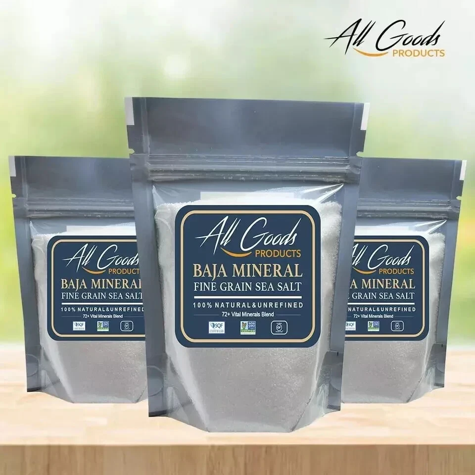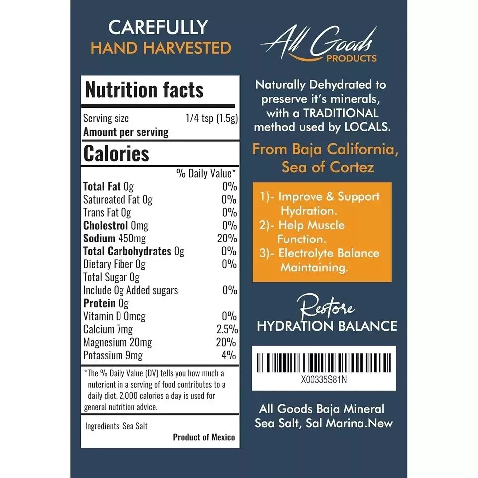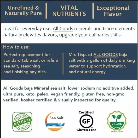 Baja Gold Mineral Sea Salt Natural Grain Crystals 8 oz. Bag About this item ✔️ VITAL MINERALS: All Goods baja mineral sea salt, sourced from fresh seawater, hand harvested, makes every meal a special occasion, features a comprehensive mineral & trace element profile for enhanced taste & improved vitality. ✔️ ALL GOODS BAJA SEA SALT: Created in a pristine estuary located on the Sea of Cortez in Baja California. It is produced by Baja natives using proven salt-making traditions inherited over many generations guaranteeing its superior quality ✔️ PREMIUM GRADE: Baja coarse salt, low sodium, loaded with minerals, unprocessed, kosher certified, NON-GMO verified, extra pure crystal minerals coarse grains, gluten free, paleo, vegan & keto friendly. Living salt with a unique flavor. ✔️ CRYSTAL COARSE GRAINS: All Goods baja sea salt, is ideal for grinder refill. With a resalable pouch bag for a long lasting complex, earthy and natural flavor. 😍 ALL GOODS: It's a 💯 original & trust USA 🇱🇷 brand, approved for all required quality standards, recommended by nutrition experts & professional chefs. Not satisfied? money back guaranteed no questions ask.