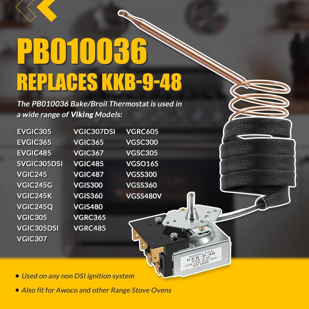Bake/Broil Thermostat PB010036 for Viking Ranges, Induction, Electric, Gas Ovens PB010036 Thermostat Bake/Broil Part, Replace for Viking Thermostat Fryer Bake Broil Part KKB-9-48, Fits for Awoco, Viking Range Stove Oven (Max Temp 606℉, 22A 120-250 VAC) Wide Compatibility: The PB010036 Bake/Broil Thermostat is used in a wide range of Viking Models — EVGIC365; EVGIC485; SVGIC305DSI; VGIC245; VGIC245G; EVGIC305; VGIC245K; VGIC245Q; VGIC305; VGIC305DSI; VGIC307; VGIC307DSI; VGIC365; VGIC367; VGIC485; VGIC487; VGIS300; VGIS360; VGIS480; VGRC365; VGRC485; VGRC605 (All VGR/VCM/VRT Units); VGSC300; VGSC305; VGSO165; VGSS300; VGSS360; VGSS480. Used on any non DSI ignition system. It is also fit for Awoco and other Range Stove Ovens, ensuring universal. Product Specification: Replacement Part Number: PB010036 / KKB-9-48; Dimensions: 2-7/8” x 1-7/8”; Current: 22A; Voltage: 120-250 VAC; Temperature Range: 100-450℉ (38-232℃); Max Temperature: 606℉ (320℃); 1/4" x 6-3/4" copper bulb with 48" capillary. Please notice that don't bend too much or cut the capillary off the probe bulb, liquid or oil is inside Precise Temperature Control for Baking and Broiling: This thermostat offers precise control of oven temperatures up to 606℉ (320℃), ensuring consistent heat for both baking and broiling operations. It allows you to cook with accuracy, achieving perfect results every time, whether you’re baking delicate pastries or broiling meats. Durable Stainless Steel Construction: Built with high-quality stainless steel, the PB010036 Thermostat Replacement is highly durable and resistant to wear and tear. It is designed to withstand harsh kitchen environments, providing long-lasting performance and reducing the need for frequent replacements. Efficient Performance and Energy Saving: The KKB-9-48 PB010036 thermostat is engineered for efficient performance, helping your oven maintain the desired temperature with minimal energy consumption. This not only improves cooking efficiency but also reduces energy costs, making it an economical option for your kitchen. Easy Installation for Quick Replacement: The KKB-9-48 PB010036 thermostat is designed for simple and quick installation. With its universal fit, it allows users to easily replace the old thermostat without needing too much professional help, saving time and effort. Replace for Viking Thermostat Fryer Bake Broil Part KKB-9-48 fit for Awoco, Viking Range Stove Oven - Max Temp 606℉ , 22A 120-250 VAC PB010036 Thermostat Bake/Broil Part Replace for Viking Thermostat Fryer Bake Broil Part KKB-9-48 The oven thermostat maintains the correct oven temperatures in the bake and broil operations. In bake operation , thermostat contacts close completing the bake circuit through the bake ignitor and bake gas valve to neutral. In broil operation , thermostat contacts close completing the broil circuit through the broil ignitor and broil gas valve to neutral. The thermostat contacts can be checked for continuity by using a continuity tester or an ohmmeter set to the low ohms range. Thermostat Replacement Procedure STEP 01 Shut off power to the unit. STEP 02 Remove all top burner and grill knobs. STEP 03 Remove lower bezel screw from the second burner control from each end of the control panel. (Remove lower bezel screw from grill control on grill models.) STEP 04 Remove two decorative screws at both ends of the control panel to remove the control panel. STEP 05 Remove the two (2) clips securing the thermostat bulb to the inner back wall. STEP 06 Remove the left side grates, burner bowls and grate supports. STEP 07 Carefully pull the capillary tube out of the oven cavity. STEP 08 Remove the thermostat by removing the two (2) screws that mount the thermostat to the control panel. STEP 09 Disconnect the thermostat wiring one lead at a time and connect to the appropriate terminal on the replacement thermostat. STEP 10 Install by reversing the removal steps. Payment Delivery details Terms of sales Returns Contact us Payment 1. All major credit cards are accepted through our secure payment processor Payoneer. 2. Please make sure your Shipping address is correct before you pay, cause it cannot be changed once the order shipped out. Delivery details 1. We only ship to confirmed ebay addresses. Your ebay address MUST MATCH your Shipping address. 2. Please read the shipment and payment detail carefully before you bid. Terms of sales ★If there are any problems with our products, Please feel free to contact us. We will always here to solve them for you. We should try our best to make a happy easy transaction. ★If you are satisfied with our products and our service, please tell your friend and leave us positive feedback. If you are not satisfied with our products or service, please DO tell us. Returns 100% Satisfaction Guarantee: Your satisfaction is our priority. We strive to give our customers excellent service.All our products support 60-Day money-back guarantee, 12-Month warranty for quality-related issues. Simply return it for your warranty. Contact us Any Questions,Just feel free to contact us on eBay.We will reply you in 1-2 business day.