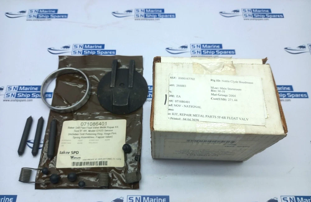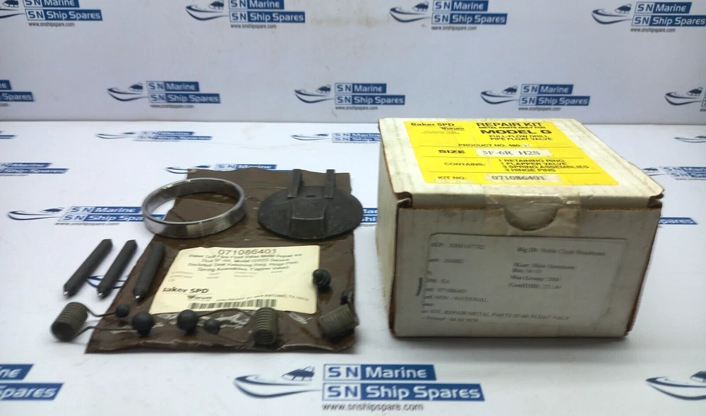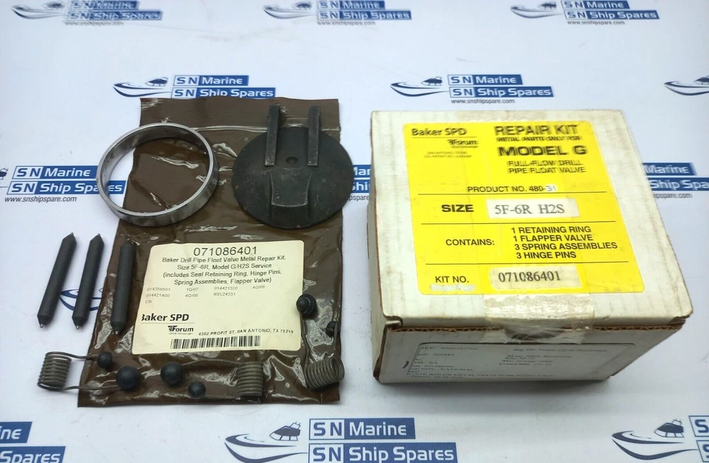 Baker SPD 071086401 Repair Kit Metal Parts Only For Model G Size: 5F-6R H2S Baler SPD 071086401 Repair Kit Metal Parts Only For Model G Full-Flow Drill Pipe Float Valve Size: 5F-6R H2S Contain: 1 Retaining Ring 1 Flapper Valve 3 Spring Assemblies 3 Hinge Pins Feedback We want our customers to be completely satisfied with their purchase. If anything about your transaction is not your satisfaction. Please contact us BEFORE leaving Feedback. It gives both the parties the chance to get positive trading experience on eBay · PayPal is the only form of payment we accept. · Winner of Bid is expected to pay within 7 days or I will relist the item. Sometimes exceptions can be made but please contact Us · Items are shipped by DHL Express, FedEx Etc. depending on weight and size of item. · We ship daily, Monday through Friday. If you pay for your item before 7:00am Pacific Time, it will ship in two working day · International Buyers - Please Note: · We offer international shipping on everything we're able to. If an item can be shipped internationally (outside the US and Canada) there will be a calculated cost included in the listing but you can also contact me. If you do not see international shipping offered on the listing then the item is too large to ship to your country. Items may not be shipped to the countries which eBay global shipping portal does not allow to ship. In such case extra shipping charges may apply for using private shipping service other than eBay global shipping. · IMPORTANT! - PLEASE READ!!! Pictures are also a big part of any description. Certain things that may not be said are shown and vice versa so be sure to not only read everything but look at my pictures and click on any image for a larger image. · Please read the description carefully. It will tell you the condition of the item, whether or not it has been tested and any additional notes. · We will list what is included in the package. If it is not listed in the description, or shown in the pictures, please do not assume it will be included in with the auction. · Please review our return policy & terms before you purchase. · SN Ship Spare is one of India's marine equipment trading houses since last 9 years. We are serving shipping industry by supplying Marine Engines, Marine Machinery, Marine Spare Parts, Ship stores and Marine Navigational equipments to our global clients. · We are dedicated to provide quality products in sharp timings to our customers with very competitive rates. · We serve shipping companies, ship management companies, ship repairers, trading houses, marine training institutions in India as well as abroad. · If you are interested in reducing your costs, on procurement of spares, then do spend two minutes reading this and giving your requirements for your next orders.