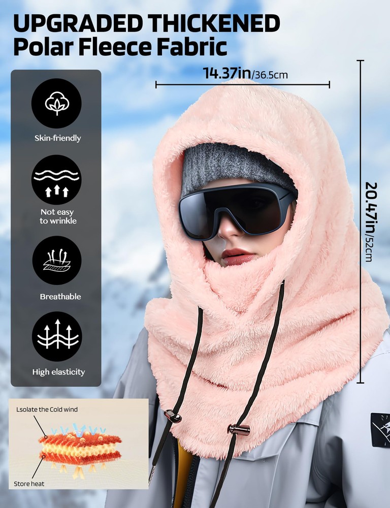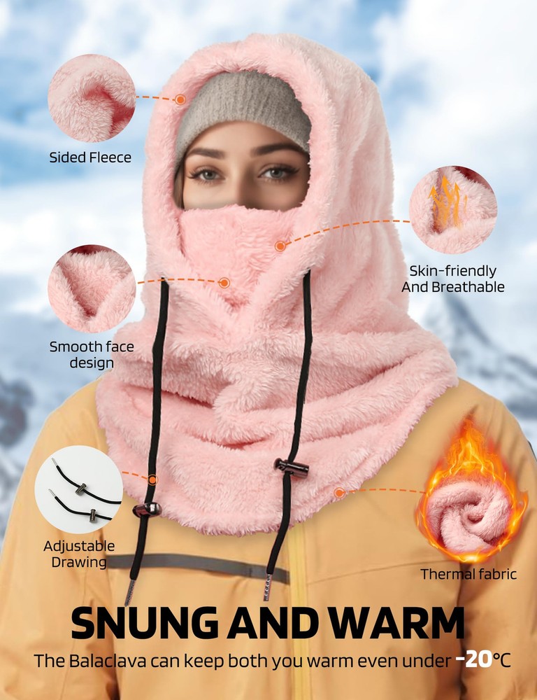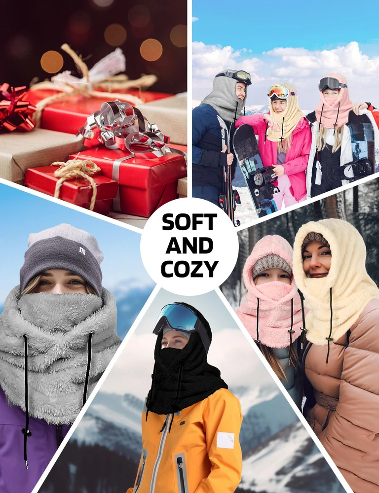 Soft Thick Fleece Lightweight and Cozy: Are you looking to keep your face warm while exploring the outdoors? This balaclava face mask is a good choice for you. This extremely lightweight Balaclava made of 100% fleece polyester fabric, cozy stretchable fleece, will keep you covered with comfortable, breathable material whenever you put it on, keeping you warm in cold weather conditions! Keep your nose, cheeks & most importantly neck toasty warm Warm and breathable Ski Mask Balaclava: The winter hat for women and men features adjustable black knit strings on both sides, allowing for a customized fit for your head and enhanced protection against wind and snow. The appropriate thickness and loose design of the Hood Scarf provide warmth without feeling constrained. The Neck Warmer comes with thicker fluff, effectively warming your neck and face. The slightly elastic design allows you to adjust the coverage on the face and neck Full Facial and Neck Protection: Ideal for various outdoor activities such as snowboarding, hiking, camping, skiing, motorcycling, running, cycling, snowmobiling, biking, trekking, mountain climbing and motorcycling. The multi-purpose face mask balaclava provides comprehensive facial and neck coverage throughout the year. Also handy to have during cold-weather outdoor activities where the wind might kick-up unexpectedly One Size Fits All: One size fits most. Suit for men and women. Adjustable design, so you don't have to worry about size. It can covers deep, down over your whole neck and some on your shoulders. The appropriate thickness and loose design of the Hood Scarf provide warmth without feeling constrained. Protect your face against cold wind and easily adjust the elastic cord on windy days. The Neck Warmer comes with thicker fluff, effectively warming your neck and face Versatile Usage Balaclava for Women: This fleece balaclava can be worn as a neck warmer, half mask or a full balaclava for the best cold weather protection. The material that covers the chin/mouth area can be pulled up to increase the facial coverage, or pulled down and tucked under the chin for eating, drinking, to allow air circulation, etc. Can be worn as full face mask or hat, open balaclava, neck gaiter or saharan Style & ninja hoodie Multiple ways to wear: Our winter face mask can be worn as an open or closed Balaclava hat, scarf, hat or mask, or you can lower your chin or use it as a neck strap to increase ventilation. It can be used alone or as an additional facial protection device under the helmet. The length of the neckline is extra long, so that you can stuff it into the jacket to prevent the wind from coming in