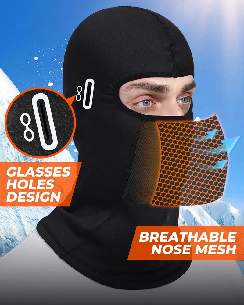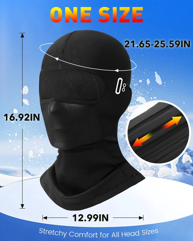 【THERMAL FLEECE FABRIC】: Are you still worried about frozen face or ears when outdoors in cold winter? Our balaclava ski mask will offer a full protection for your head, face and neck, keep you warm and comfortable to wear. It is made of high quality Fleece fabric which is soft, breathable, extra-stretchy. Windproof and suitable for about 20°F. 【UNIQUE GLASSES HOLE DESIGN】: Different from others, this full winter face mask is designed with glasses holes, which makes it suitable not only for those who need wear glasses, but also for those who wear other eye accessories or devices. The glasses holes allow wear glasses more convenient and stable. 【BREATHABLE NOSE MESH】: The mouth part and nose part also designed with breathable mesh. Aim to let you breathe freely even doing outdoor activities or wearing for long time. The fabric has excellent breathability and evaporates the cold air that forms on the head. 【MULTIFUNCTIONAL BALACLAVA】: The face cover shield for cold weather will meet your need when you are in skiing, snowboarding, outdoor working, motorcycle, cycling, running, jogging, sledding, hiking, ice fishing or other outdoor sports. The suitable thickness also provides great under helmet comfort. Provide the ultimate warmth protection in winter. 【UNIVERSAL SIZE】: Excellent elasticity and one size fits most no matter you are men, women or teens. Size is : 16.92 * 12.99 in(L*W). Head size is about 21.65-25.59 in. Hand wash is more recommended and in this way can extend its using time.