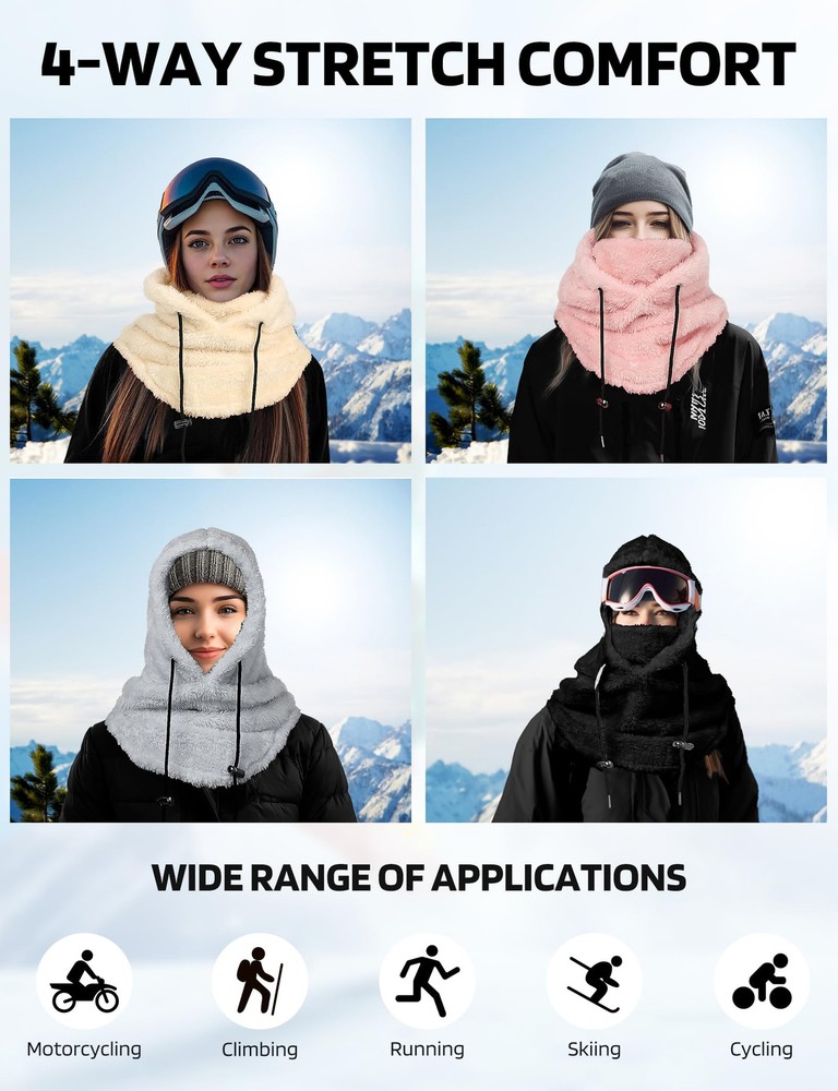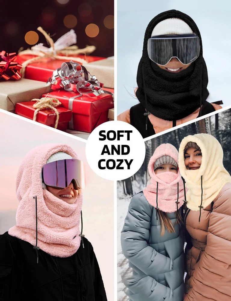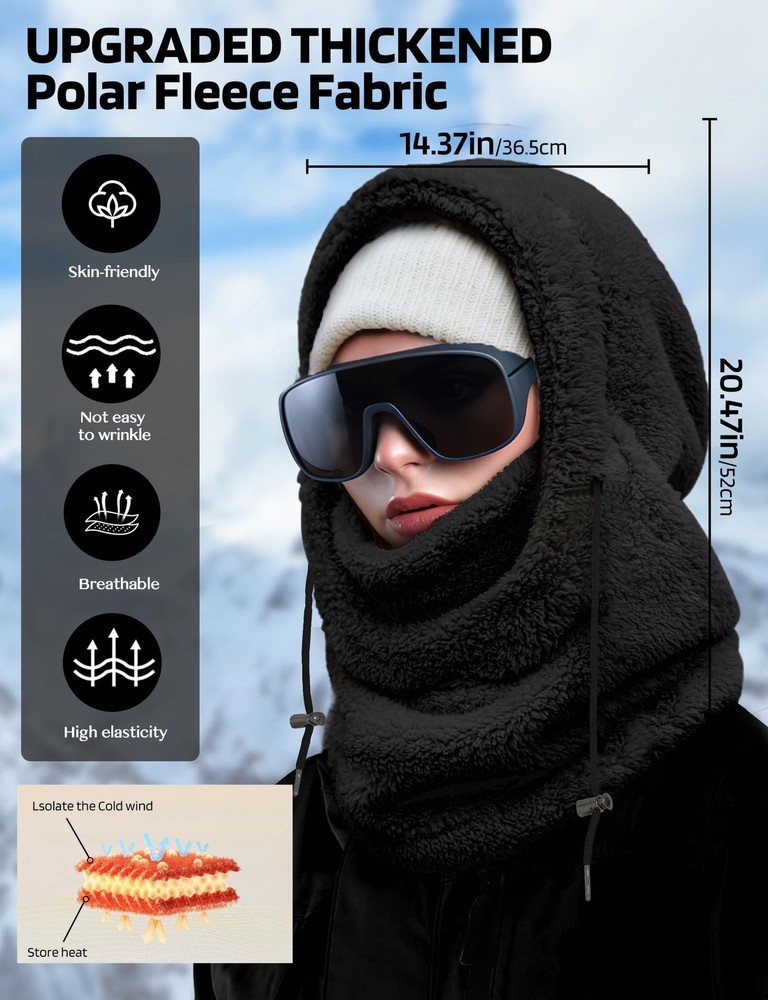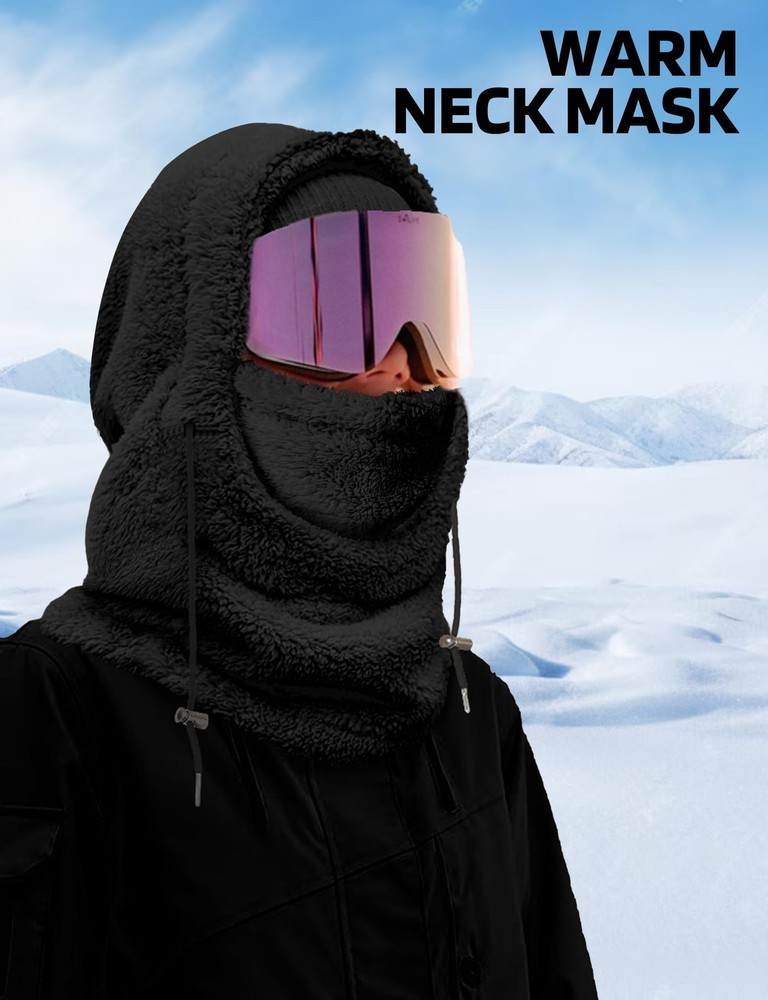 Soft Thick Fleece Lightweight and Cozy: Are you looking to keep your face warm while exploring the outdoors? This balaclava face mask is a good choice for you. This extremely lightweight Balaclava made of 100% fleece polyester fabric, cozy stretchable fleece, will keep you covered with comfortable, breathable material whenever you put it on, keeping you warm in cold weather conditions! Keep your nose, cheeks & most importantly neck toasty warm Warm and breathable Ski Mask Balaclava: The winter hat for women and men features adjustable black knit strings on both sides, allowing for a customized fit for your head and enhanced protection against wind and snow. The appropriate thickness and loose design of the Hood Scarf provide warmth without feeling constrained. The Neck Warmer comes with thicker fluff, effectively warming your neck and face. The slightly elastic design allows you to adjust the coverage on the face and neck Full Facial and Neck Protection: Ideal for various outdoor activities such as snowboarding, hiking, camping, skiing, motorcycling, running, cycling, snowmobiling, biking, trekking, mountain climbing and motorcycling. The multi-purpose face mask balaclava provides comprehensive facial and neck coverage throughout the year. Also handy to have during cold-weather outdoor activities where the wind might kick-up unexpectedly One Size Fits All: One size fits most. Suit for men and women. Adjustable design, so you don't have to worry about size. It can covers deep, down over your whole neck and some on your shoulders. The appropriate thickness and loose design of the Hood Scarf provide warmth without feeling constrained. Protect your face against cold wind and easily adjust the elastic cord on windy days. The Neck Warmer comes with thicker fluff, effectively warming your neck and face Versatile Usage Balaclava for Women: This fleece balaclava can be worn as a neck warmer, half mask or a full balaclava for the best cold weather protection. The material that covers the chin/mouth area can be pulled up to increase the facial coverage, or pulled down and tucked under the chin for eating, drinking, to allow air circulation, etc. Can be worn as full face mask or hat, open balaclava, neck gaiter or saharan Style & ninja hoodie Multiple ways to wear: Our winter face mask can be worn as an open or closed Balaclava hat, scarf, hat or mask, or you can lower your chin or use it as a neck strap to increase ventilation. It can be used alone or as an additional facial protection device under the helmet. The length of the neckline is extra long, so that you can stuff it into the jacket to prevent the wind from coming in