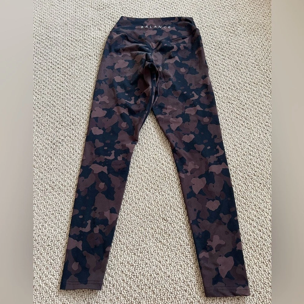 Balance Athletics leggings! Size small- the hang tag is cut out, but see approx measurements in pics Brown/black camp print In good pre owned condition- no tears or stains. Just some general wear, and 2 small snags, see close up in last pic Please reach out with questions!