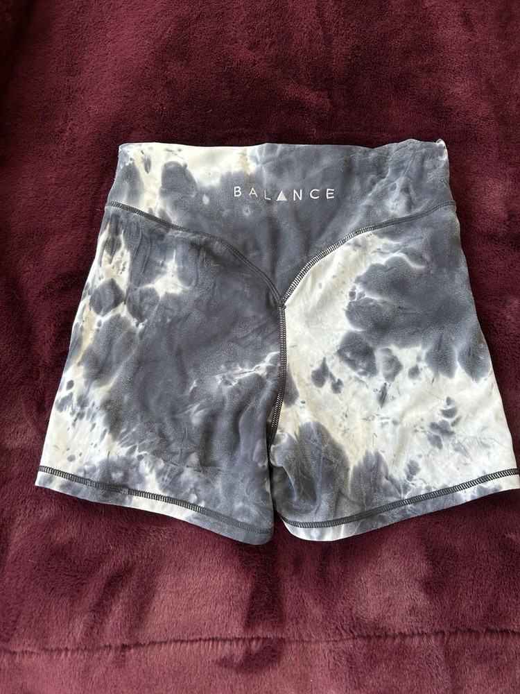 The product is a pair of New Balance athletic shorts in size M, featuring a black and white tie-dye design. Made of spandex material, these shorts are designed for various activities such as gym training, walking, cycling, cross-training, dance, CrossFit, yoga, and running. The athletic fit and regular size make them suitable for active women looking for comfortable and stylish activewear for their workouts.