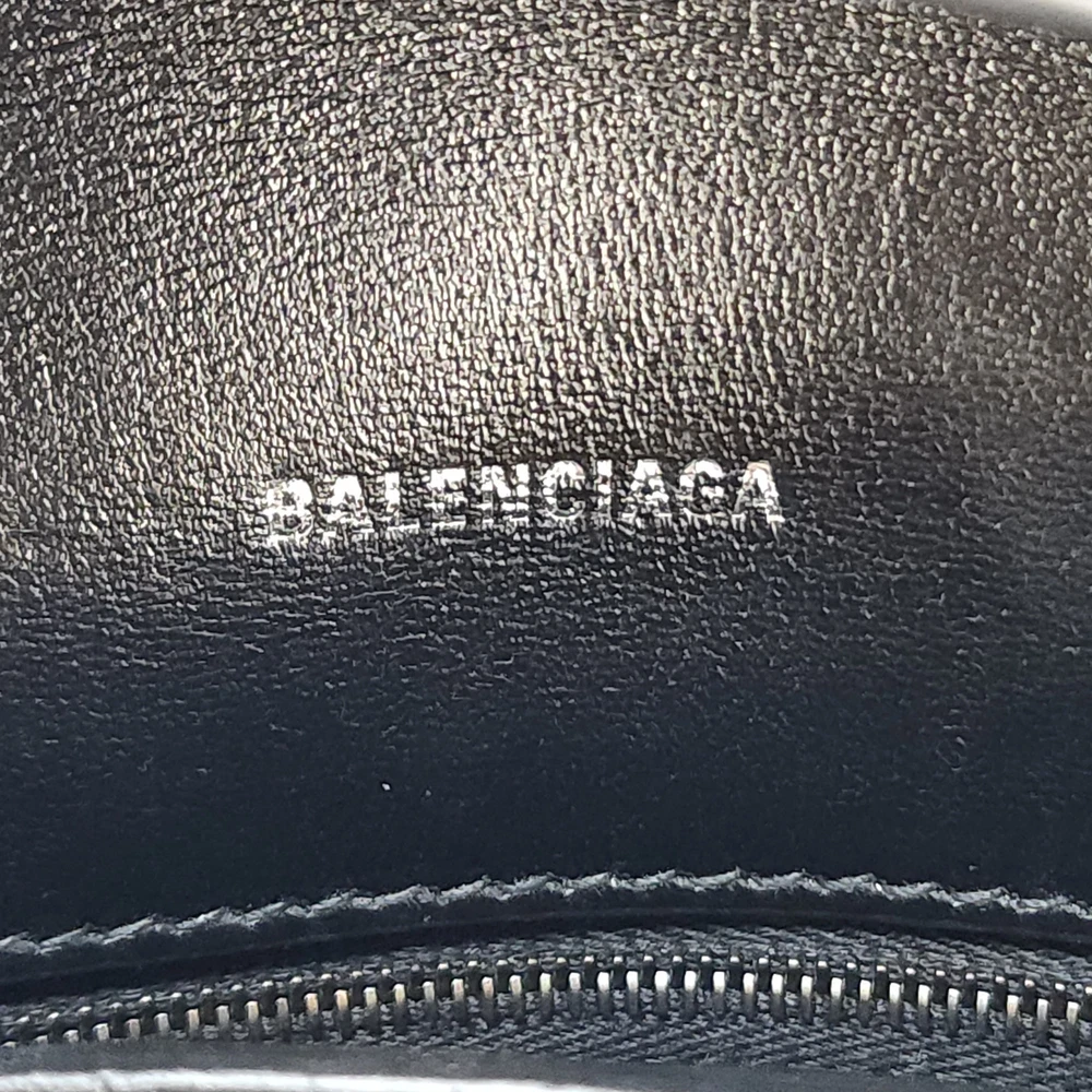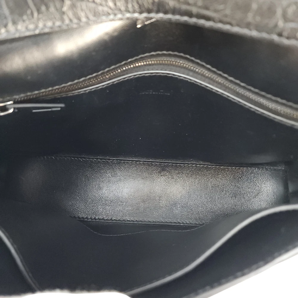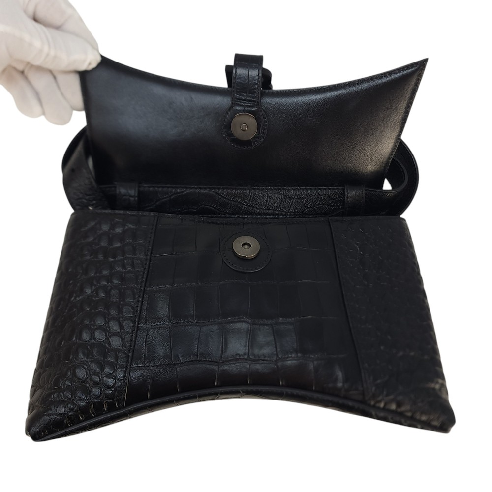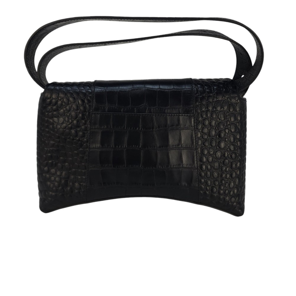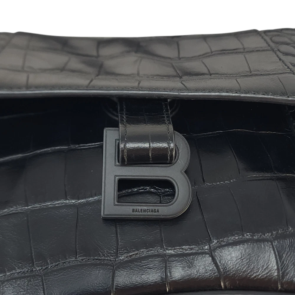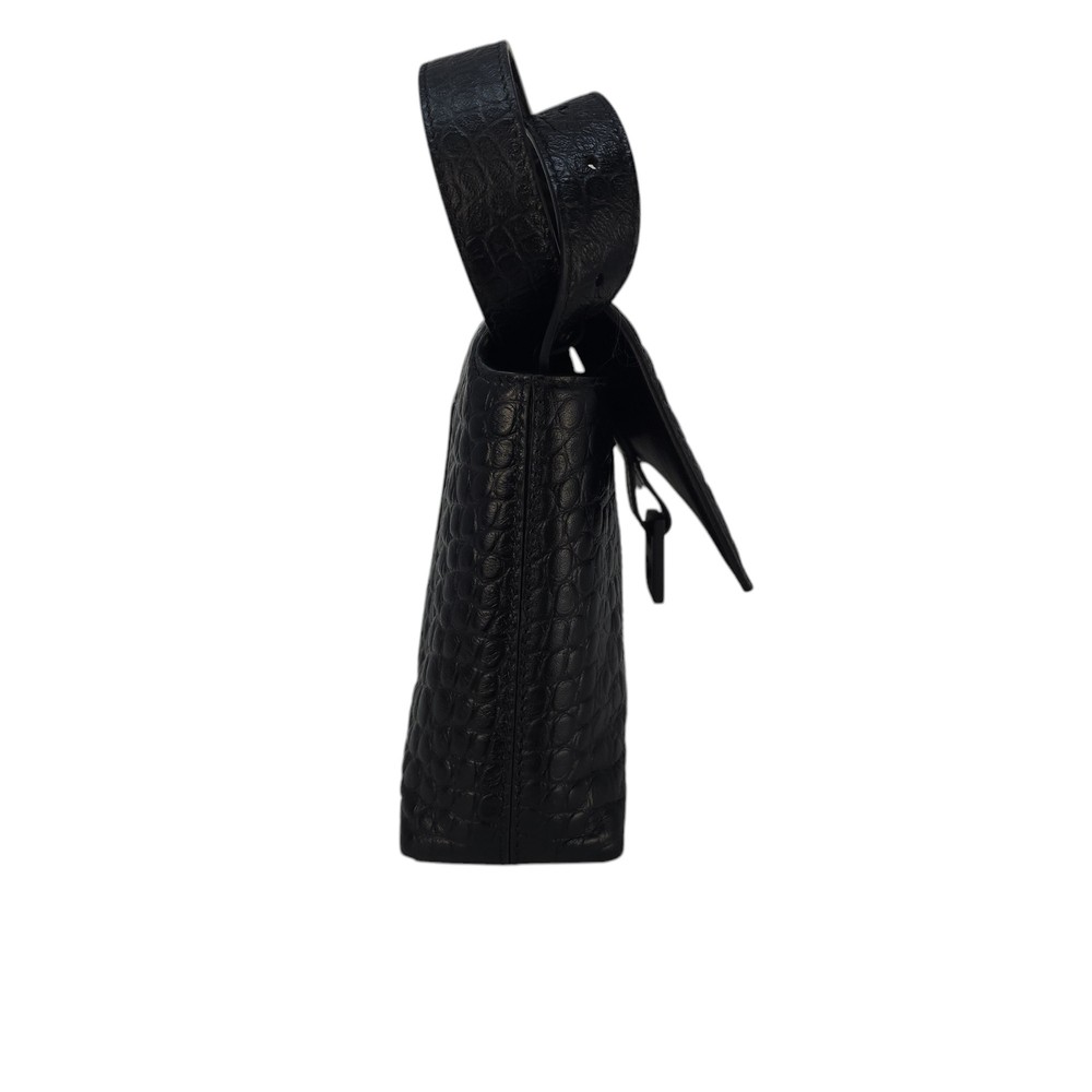 Step into modern luxury with this Balenciaga handbag in black crocodile-embossed leather. Featuring a sleek, structured silhouette and the iconic Balenciaga "B" logo detail, this statement piece exudes sophistication and style. Perfect for elevating any outfit, this versatile bag is a must-have for collectors and fashion enthusiasts seeking timeless elegance. Condition Ratings: Exterior: - The crocodile-embossed leather exterior is in pristine condition with a glossy finish and no visible scratches, scuffs, or discoloration. Interior: - The strap and handle show no signs of wear, cracking, or fraying. Handle/Strap: - The black leather interior is clean, with minimal signs of use. Hardware: - The matte black "B" hardware is flawless, with no scratches, chips, or tarnish. Overall rating: 9/10 Dimension: Height: 6.3 inches Width: 10 inches Depth: 3.3 inches