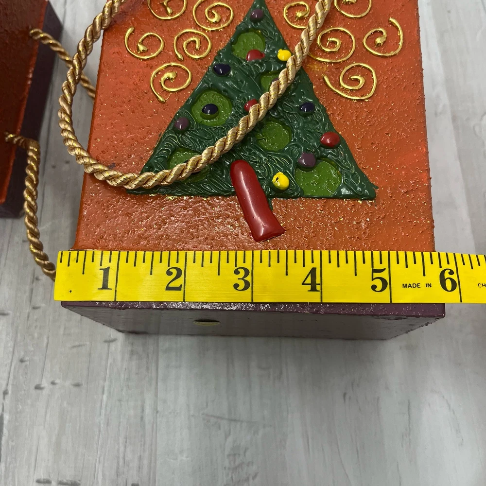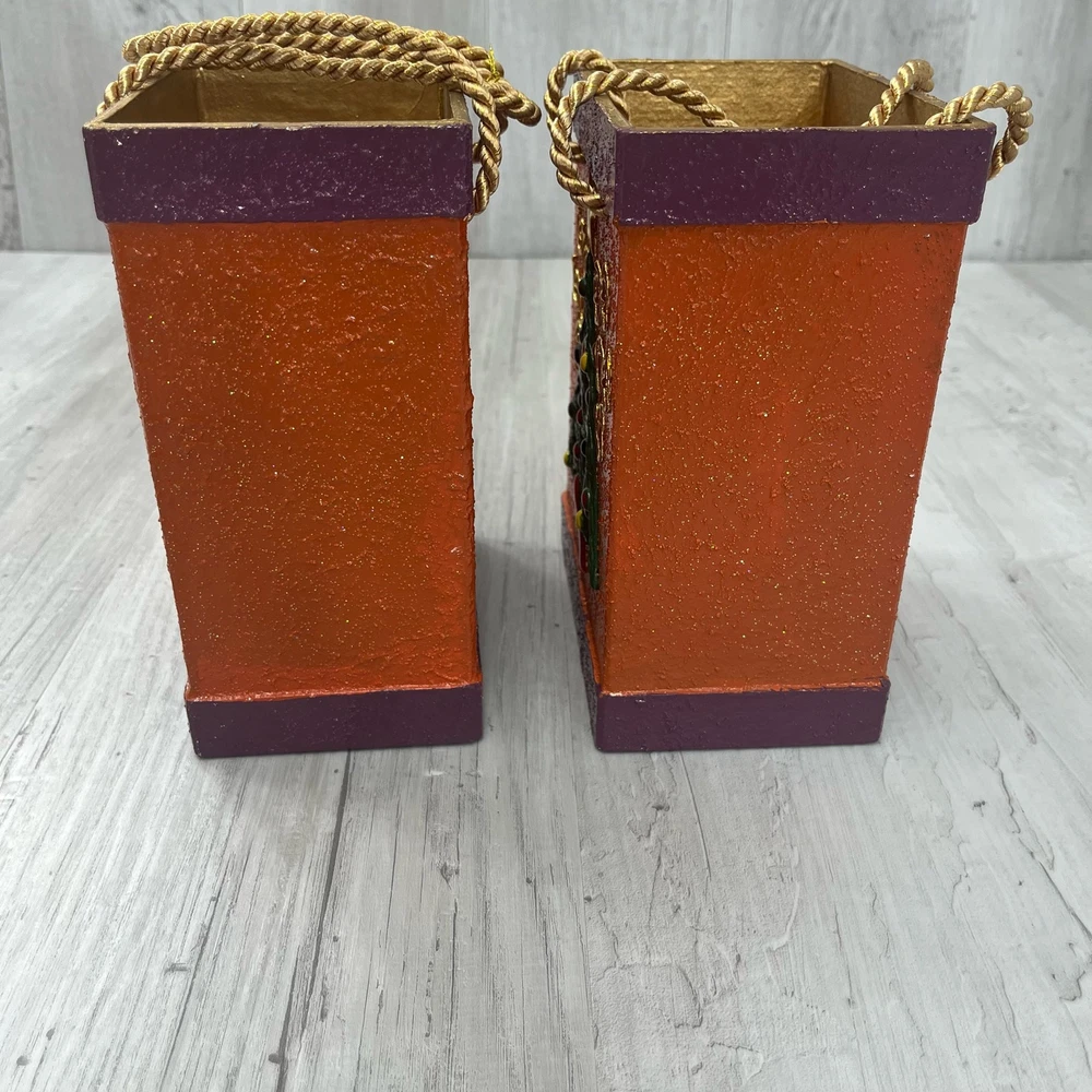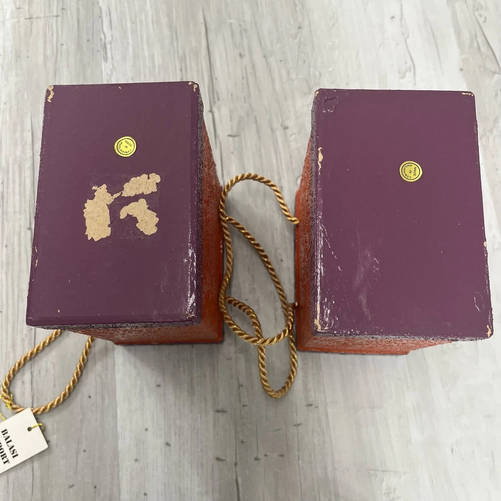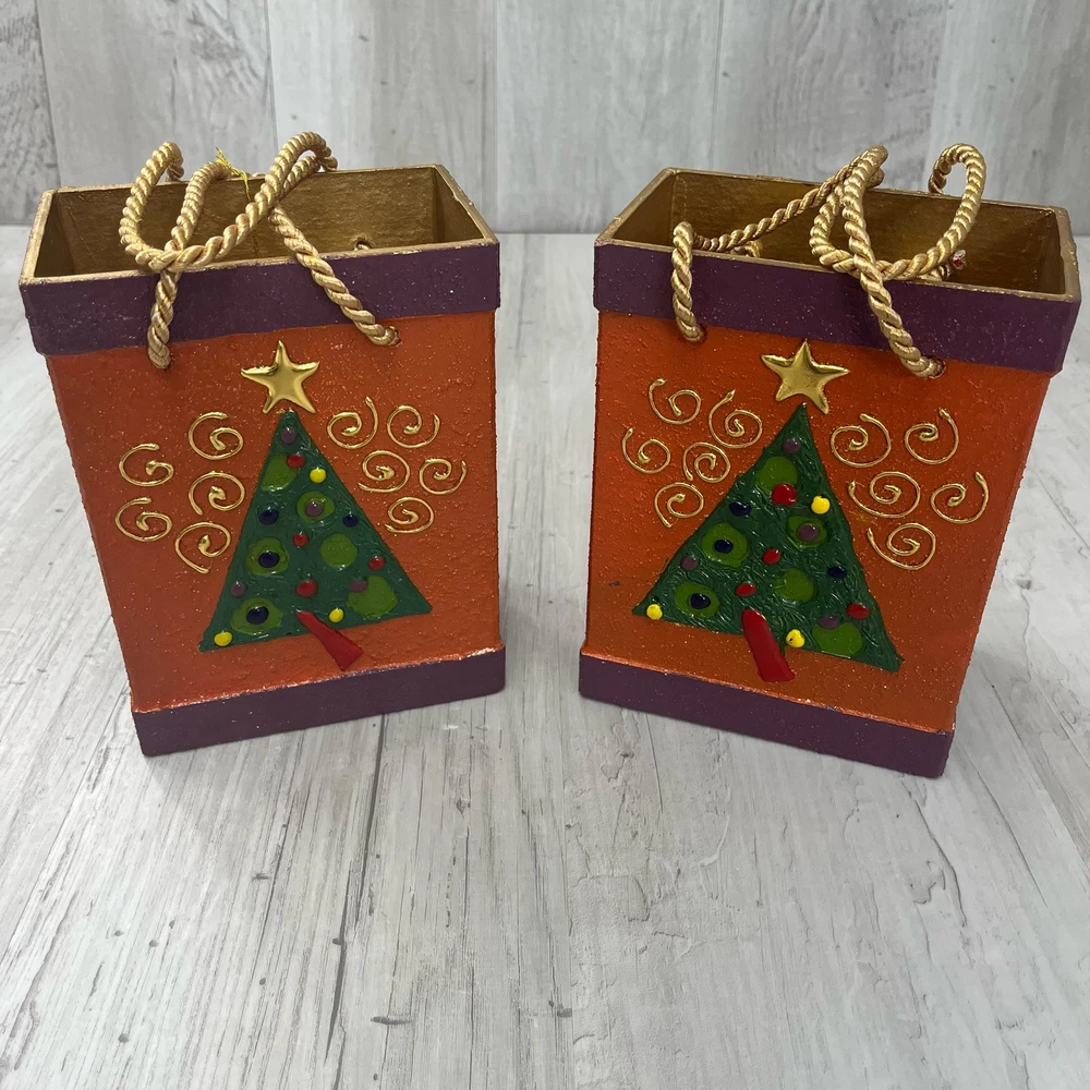 Balasi Export Handmade Pair Of Holiday Tree Textured Ceramic Bags Handmade in Southern Philippines Bottom of one has peeling paint from sticker 7.5" Tall 5.75" Wide Additional measurements available upon request All measurements are approximate All measurements are taken with item laying flat Double bust, waist, & hip for measurement all the way around Colors may differ based on others computer/phone/etc settings All pre owned items have been washed and steamed All pre owned items have been looked over for flaws and will be noted in listing