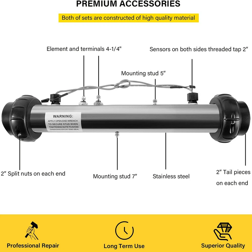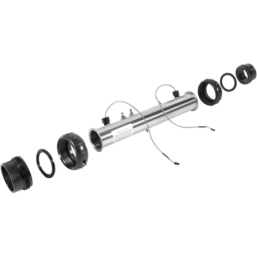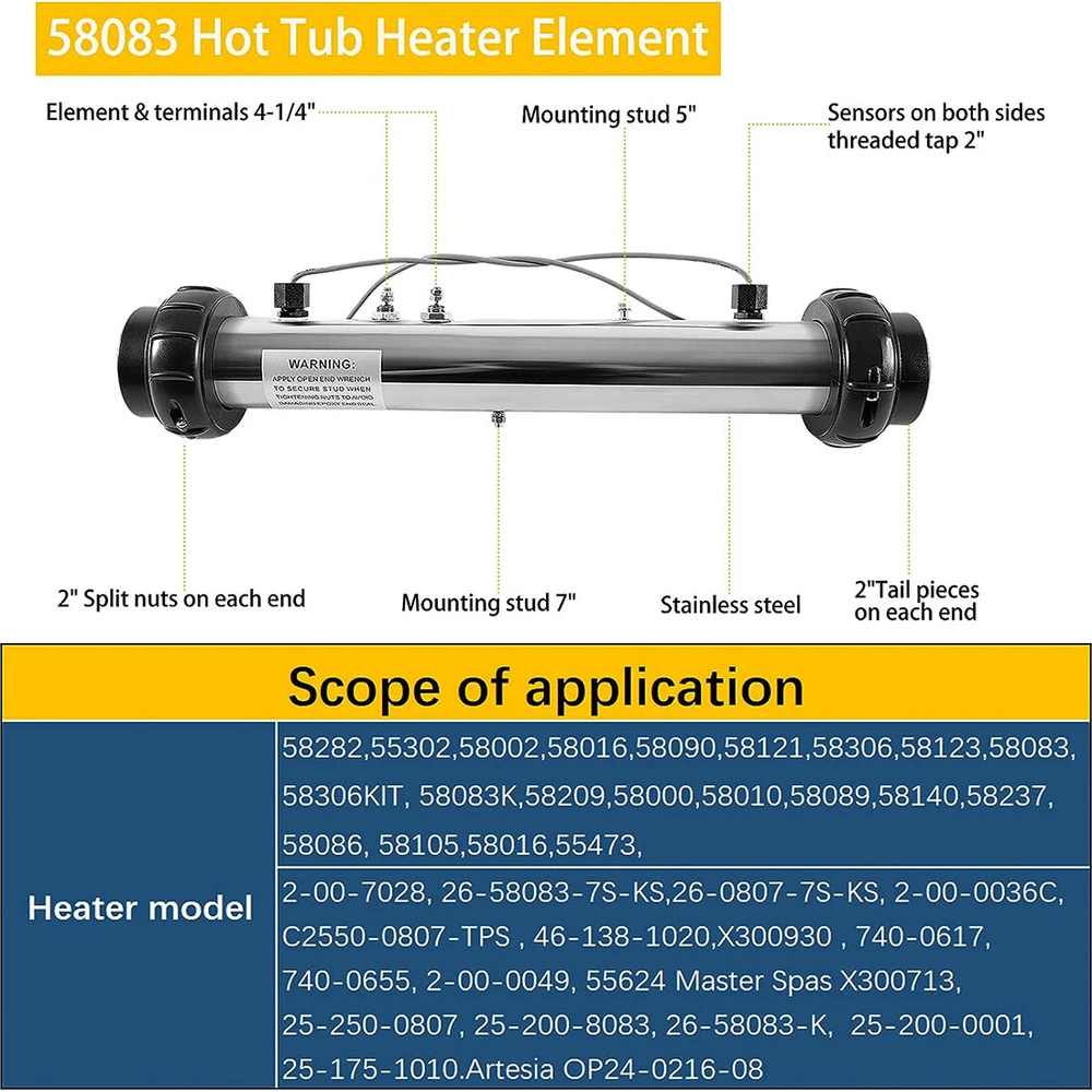 Balboa Water 58083 Heater Tube Assembly 5.5kW 230V with Sensors M7 VS With Studs Fitment: This heater is suitable for Balboa BP Series control systems, such as BP501G1, BP501G3, BP2000G1, BP7, as well as for Balboa VS Series and EL2001 Series control systems, such as VS501Z, VS510SZ, VS520SZ, and EL2001M3 Great Compatibility --- This heater can be a convenient substitution for a great deal of models, including: 26-58083-7S-KS, 26-0807-7S-KS, 2-00-0036C, C2550-0807-TPS, 46-138-1020, 740-0617, 740-0655, 2-00-0049, 25-250-0807, 25-200-8083 58121 (1. 5" Tailpiece), 58209, 58000, 58010 (825 Incoloy), 58123, 58089 (Incoloy), 58086, 58105, 58016, 55473, 58140, 58306 (Has BP Heater Cable), 55624 (Has Titanium Element), Master Spas X300713, 58016 (Marquis Spas) Features: 1) This heater can be a convenient substitution for a great deal of models, including 26-58083-7S-KS, 26-0807-7S-KS, 2-00-0036C, C2550-0807-TPS, 58121 (1. 5" Tailpiece), 58209, 58000, 58010 (825 Incoloy), 58123, 58089 (Incoloy), 58086, 58105, 46-138-1020, 58016, 55473, 58140, 740-0617, 740-0655, 2-00-0049, 58306 (Has BP Heater Cable), 55624 (Has Titanium Element), Master Spas X300713, 58016 (Marquis Spas), 25-250-0807, 25-200-8083 2) The 58083 M-7 Heater Assembly can be used as a replacement heater for spas or hot tubs, featuring its own sensors, front-mounted design for user convenience, and easy servicing 3) Equipped with a 316 stainless steel heater housing and a 5.5KW Incoloy Flo-Thru heater element, it also supports Balboa OEM M7 dual sensors 4) Manifold Length: 15", Manifold Diameter: 2", Kilowatt Rating: 5.5KW / 1.375 KW, Voltage Rating: 240V / 120V Package included: 1 heater, 1 pair of 2. 0" heater split nuts, 1 pair of 2. 0" heater tailpieces with o-ring gaskets