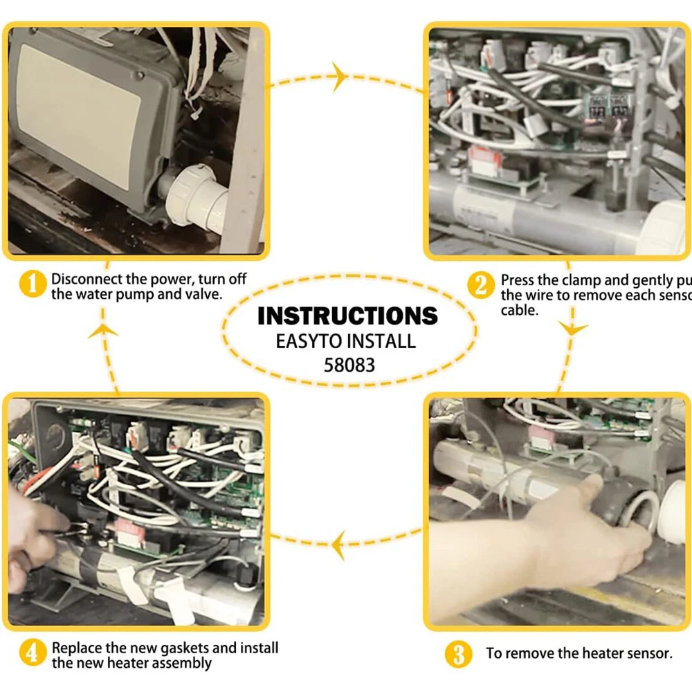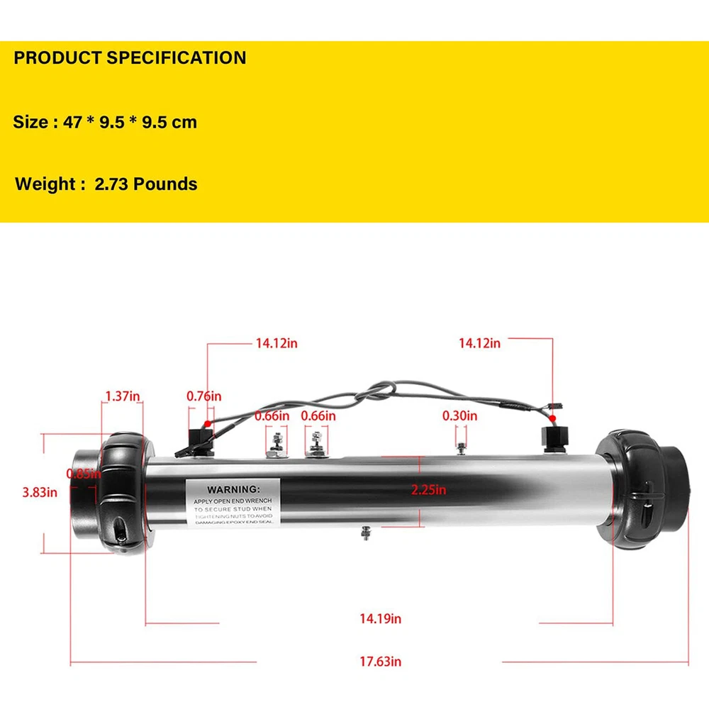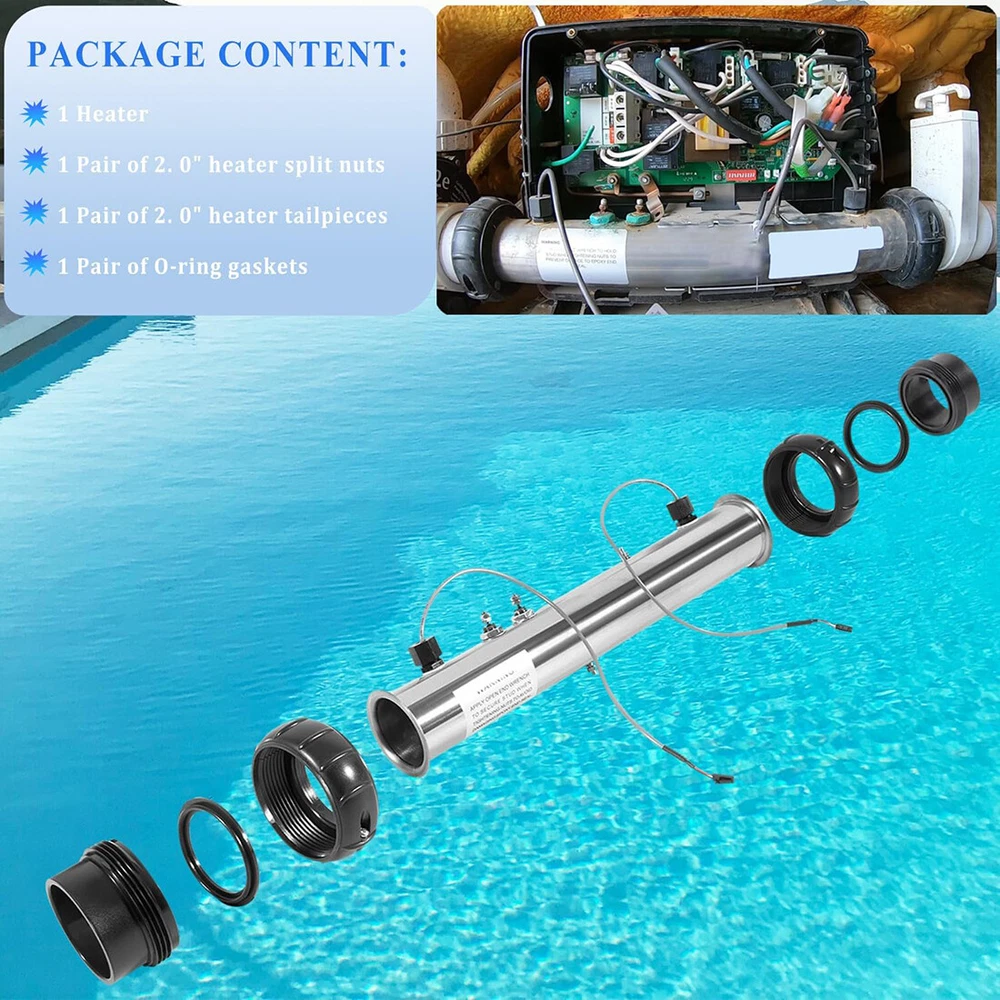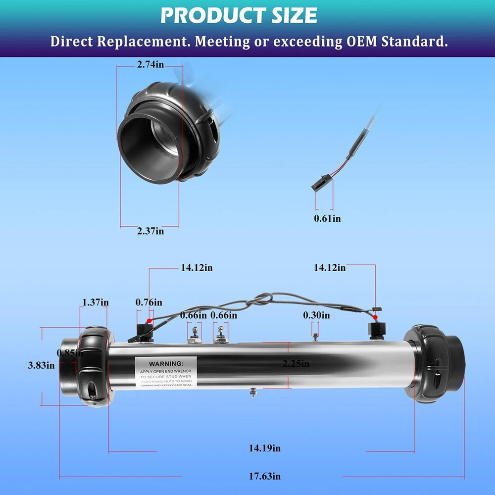 Balboa Water 58083 Heater Tube Assembly 5.5kW 230V with Sensors M7 VS With Studs Fitment: This heater is suitable for Balboa BP Series control systems, such as BP501G1, BP501G3, BP2000G1, BP7, as well as for Balboa VS Series and EL2001 Series control systems, such as VS501Z, VS510SZ, VS520SZ, and EL2001M3 Great Compatibility --- This heater can be a convenient substitution for a great deal of models, including: 26-58083-7S-KS, 26-0807-7S-KS, 2-00-0036C, C2550-0807-TPS, 46-138-1020, 740-0617, 740-0655, 2-00-0049, 25-250-0807, 25-200-8083 58121 (1. 5" Tailpiece), 58209, 58000, 58010 (825 Incoloy), 58123, 58089 (Incoloy), 58086, 58105, 58016, 55473, 58140, 58306 (Has BP Heater Cable), 55624 (Has Titanium Element), Master Spas X300713, 58016 (Marquis Spas) Features: 1) This heater can be a convenient substitution for a great deal of models, including 26-58083-7S-KS, 26-0807-7S-KS, 2-00-0036C, C2550-0807-TPS, 58121 (1. 5" Tailpiece), 58209, 58000, 58010 (825 Incoloy), 58123, 58089 (Incoloy), 58086, 58105, 46-138-1020, 58016, 55473, 58140, 740-0617, 740-0655, 2-00-0049, 58306 (Has BP Heater Cable), 55624 (Has Titanium Element), Master Spas X300713, 58016 (Marquis Spas), 25-250-0807, 25-200-8083 2) The 58083 M-7 Heater Assembly can be used as a replacement heater for spas or hot tubs, featuring its own sensors, front-mounted design for user convenience, and easy servicing 3) Equipped with a 316 stainless steel heater housing and a 5.5KW Incoloy Flo-Thru heater element, it also supports Balboa OEM M7 dual sensors 4) Manifold Length: 15", Manifold Diameter: 2", Kilowatt Rating: 5.5KW / 1.375 KW, Voltage Rating: 240V / 120V Package included: 1 heater, 1 pair of 2. 0" heater split nuts, 1 pair of 2. 0" heater tailpieces with o-ring gaskets