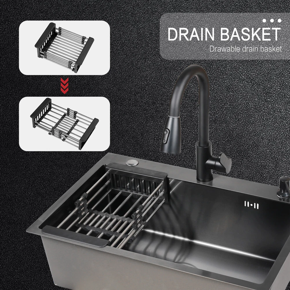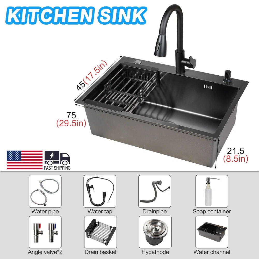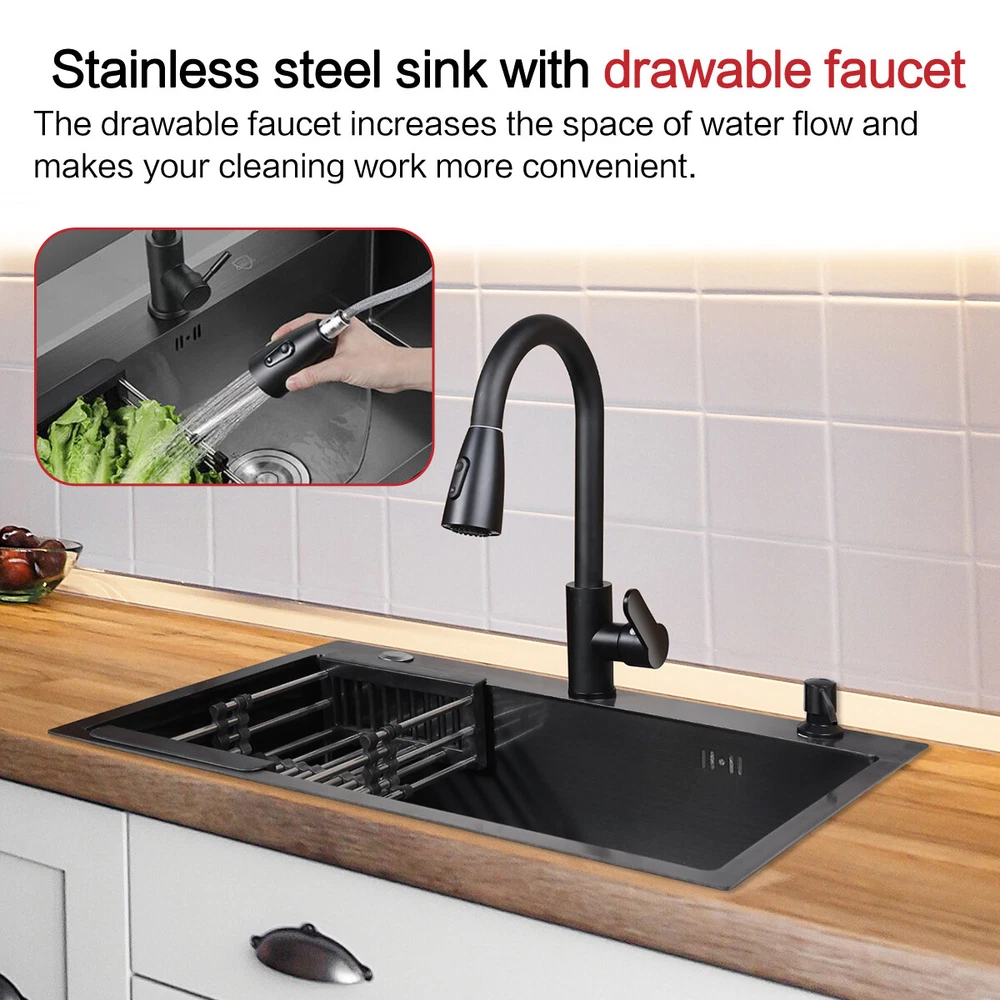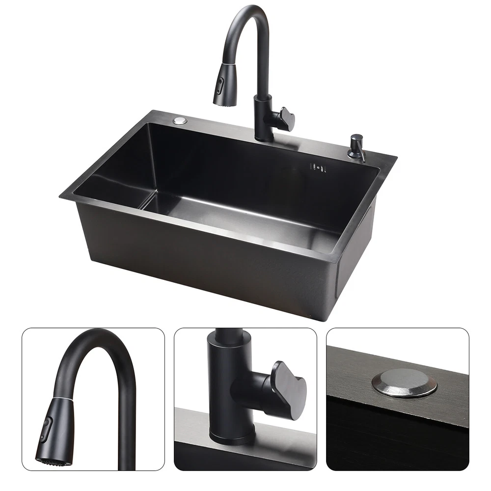 29.5" Black Kitchen Sink Deep Single Bowl 304 Stainles Steel w/ Pull-out Faucet Features Pull-out faucet, 360° cleaning without dead angle, more convenient. Strict selection of stainless steel, thick, durable, and not easily deformed. With 7 layers and 147 processes, it is resistant to dirt and oil stains. After long-term use, it will not scratch or fade, boil at high temperatures, fade, scratch, and leave no marks. Nano coating, which forms beads when falling into water without oil stains, makes cleaning more convenient. Deepen the sink, increase capacity, R10 near right angle, and increase utilization space. The sink has three holes, a kitchen faucet, a soap dispenser, and a water purifier, making it more convenient for you to install according to your habits. The bottom of the sink is coated with anti condensation coating, which prevents cold condensation and keeps the cabinet dry and clean for a long time. With a condensation coating, it effectively prevents cold condensation and keeps the cabinet dry and clean. Without condensation coating, it is easy to condense water droplets, causing mold on the inner walls of the cabinet. EVA sound-absorbing pad alleviates the impact of water flow on the bottom of the sink, reduces vibration, and achieves sound-absorbing effect. High level overflow hole to prevent water from flooding the golden mountains. Enlarge the pore size of the water heater and use multiple filtering cages to ensure fast and non clogging drainage. Scalable drainage basket, adjustable length, space reuse, and larger space. Anti odor drainage hose, anti odor and anti mosquito, resistant to high temperature and quick drainage. Specification Condition: Brand New Color: Black Material: 304 Stainless Steel Faucet Type: Pull-out Faucet Sink Type: Single Bowl Mounting: Drop-in/Top Mount/Undermount Room: Basement, Kitchen, Utility/Laundry Room Size: 29.5*17.5*8.5inch/75*45*22cm Package Includes 1 x 29.5inch Sink 1 x Pull-out Faucet 1 x Pull-out Drainer Basket 1 x Hydathode 1 x Drain Pipe 1 x Soap Dispenser 2 x Water Pipe 2 x Angle Valve Warranty 1.If your item has been damaged in transit or becomes faulty during the warranty period, please email us with pictures or video to show the problem. 2.Please check everything carefully after you receive the parcel, as any damages except DOA (Dead-On-Arrival) are not covered if it's the fault of the consumer. 3.Please submit all enquires via the “Ask a Question” tab, located at the bottom of this page. 4.If your question cannot be answered, please send us a message and we will reply within 12 hours during business days, and within 72 hours during weekends. 5.Replies will go to your registered eBay account. We are happy to resolve any issue, so please contact us before leaving feedback.
