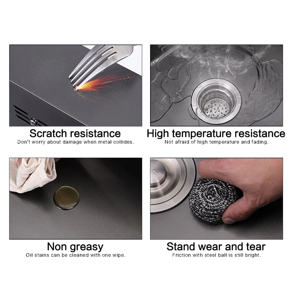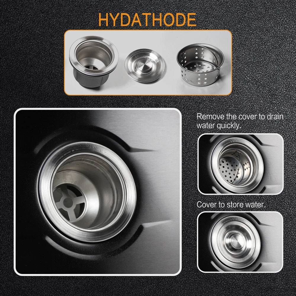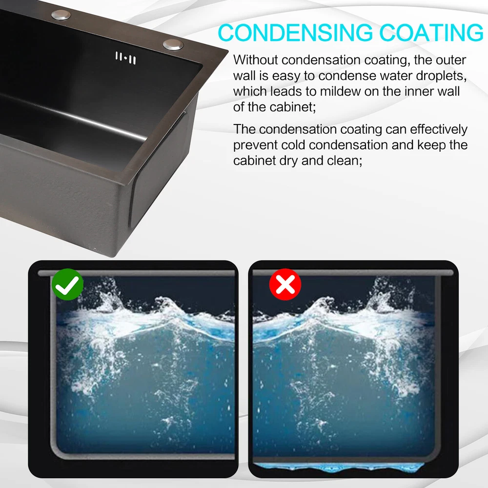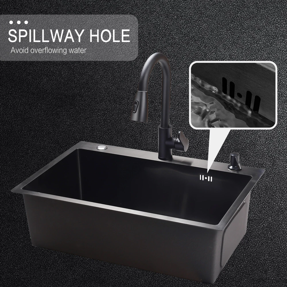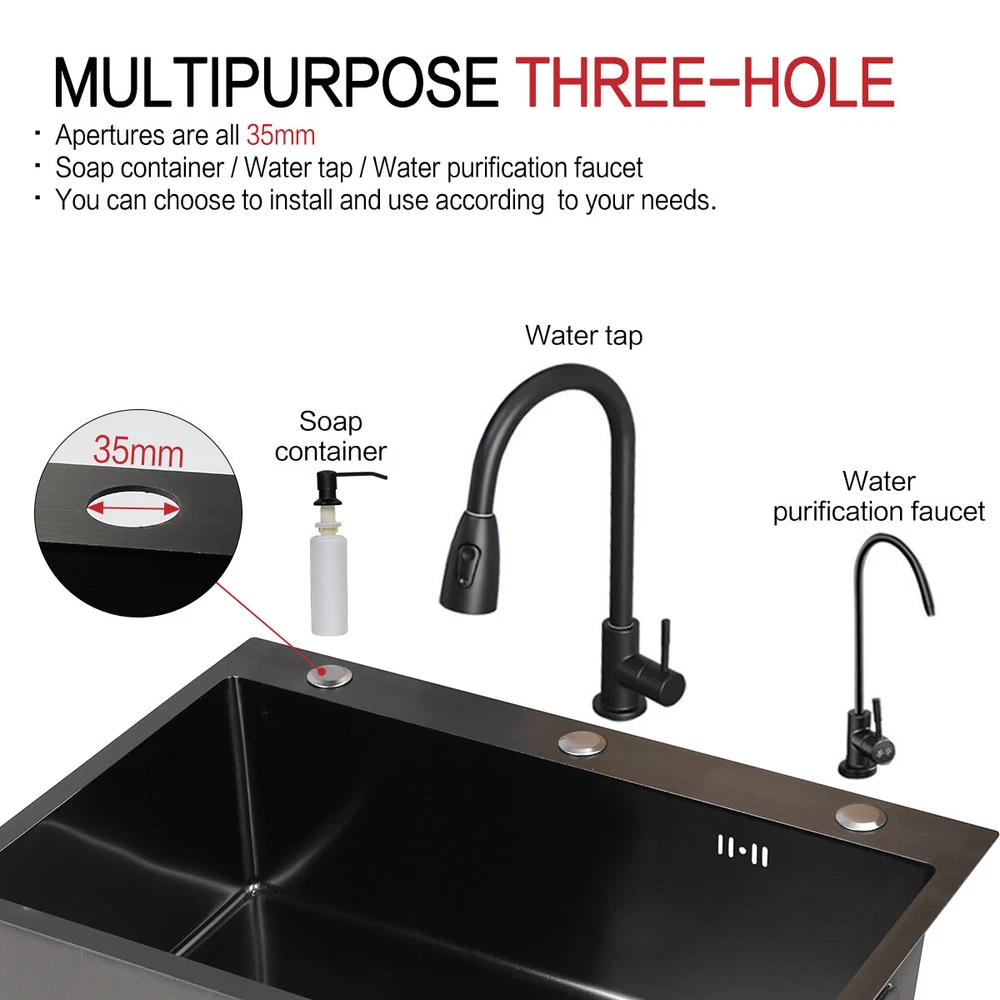 29.5" Black Kitchen Sink Deep Single Bowl 304 Stainles Steel w/ Pull-out Faucet Features Pull-out faucet, 360° cleaning without dead angle, more convenient. Strict selection of stainless steel, thick, durable, and not easily deformed. With 7 layers and 147 processes, it is resistant to dirt and oil stains. After long-term use, it will not scratch or fade, boil at high temperatures, fade, scratch, and leave no marks. Nano coating, which forms beads when falling into water without oil stains, makes cleaning more convenient. Deepen the sink, increase capacity, R10 near right angle, and increase utilization space. The sink has three holes, a kitchen faucet, a soap dispenser, and a water purifier, making it more convenient for you to install according to your habits. The bottom of the sink is coated with anti condensation coating, which prevents cold condensation and keeps the cabinet dry and clean for a long time. With a condensation coating, it effectively prevents cold condensation and keeps the cabinet dry and clean. Without condensation coating, it is easy to condense water droplets, causing mold on the inner walls of the cabinet. EVA sound-absorbing pad alleviates the impact of water flow on the bottom of the sink, reduces vibration, and achieves sound-absorbing effect. High level overflow hole to prevent water from flooding the golden mountains. Enlarge the pore size of the water heater and use multiple filtering cages to ensure fast and non clogging drainage. Scalable drainage basket, adjustable length, space reuse, and larger space. Anti odor drainage hose, anti odor and anti mosquito, resistant to high temperature and quick drainage. Specification Condition: Brand New Color: Black Material: 304 Stainless Steel Faucet Type: Pull-out Faucet Sink Type: Single Bowl Mounting: Drop-in/Top Mount/Undermount Room: Basement, Kitchen, Utility/Laundry Room Size: 29.5*17.5*8.5inch/75*45*22cm Package Includes 1 x 29.5inch Sink 1 x Pull-out Faucet 1 x Pull-out Drainer Basket 1 x Hydathode 1 x Drain Pipe 1 x Soap Dispenser 2 x Water Pipe 2 x Angle Valve Warranty 1.If your item has been damaged in transit or becomes faulty during the warranty period, please email us with pictures or video to show the problem. 2.Please check everything carefully after you receive the parcel, as any damages except DOA (Dead-On-Arrival) are not covered if it's the fault of the consumer. 3.Please submit all enquires via the “Ask a Question” tab, located at the bottom of this page. 4.If your question cannot be answered, please send us a message and we will reply within 12 hours during business days, and within 72 hours during weekends. 5.Replies will go to your registered eBay account. We are happy to resolve any issue, so please contact us before leaving feedback.