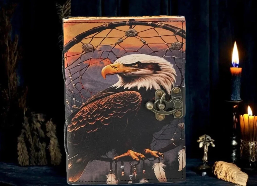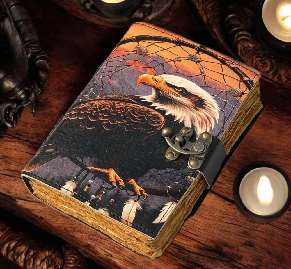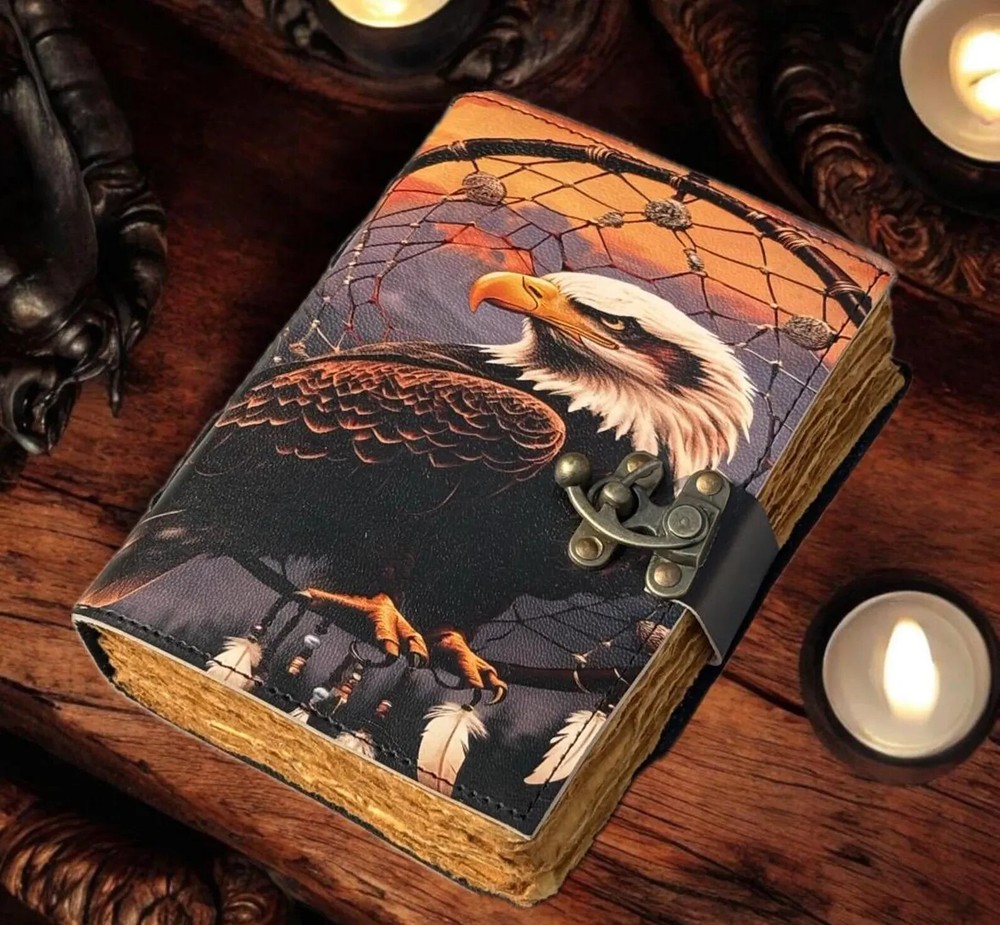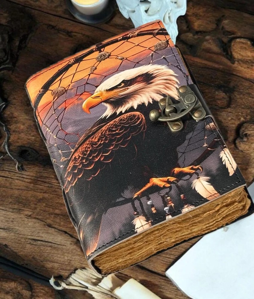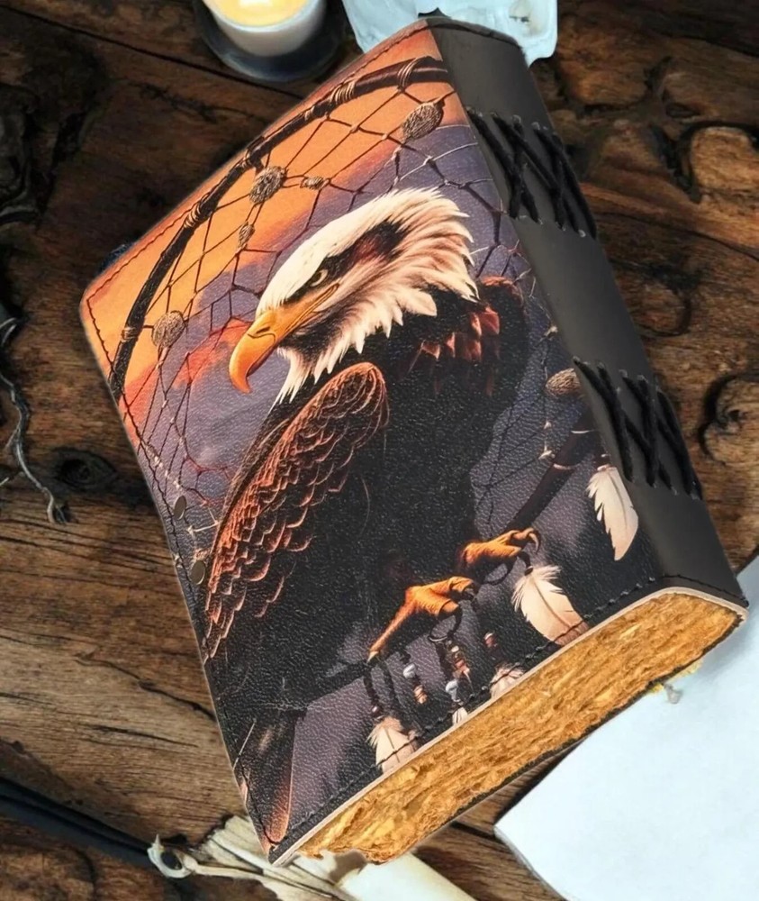 This handmade leather journal features a unique design with an American Eagle printed on the cover, making it a special luxury edition. The journal is personalized and comes with a luxurious leather cover, adding a touch of elegance to any workspace or office. It is a limited edition 1st edition piece, perfect for those seeking a distinctive and high-quality writing instrument. Made in India, this journal combines traditional craftsmanship with modern design, making it a standout piece for any collection. Bald eagle Leather Journal Rustic Notebook for Writing & Sketching Gift for her, Handcrafted Diary, Book of Shadows, Vintage book, Blank spell book Grimoire journal - Blank spell witch, book of shadows, Gifts For Men and Women • C-Lock • genuine leather • vintage deckle edge old paper • 100 Sheet (200 pages both side) 200 Sheet 400 pages both side ● Antique Paper - Vintage Journal is made of unique vintage paper which looks like it was pulled from history. You will love the old looking handmade cotton paper (200 pages) which is unique to our vintage journals. ● VINTAGE LOCK AND STURDY BINDING - The vintage lock will keep all your valuable writing locked inside.Sturdy hand stitched binding to make sure that no paper comes out loose from your vintage notebook. ● Sketchbook is great for keeping by the bedside to jot down dreams, or for use as a diary or journal. ● It is a truly unique and wonderful gift for a friend, the men, women, and wiccans in your life! or to treat yourself to as a special keepsake ● our journals are influenced by symbolism that is derived from the Wicca/Pagan community, creating a personalized space where your inner creative genius can flourish. ● The paper is made from sustainable cotton and jute canvas. The paper is acid-free and pH neutral therefore is a timeless piece of art. ● Use Any Kind Of Pen - Sketch, Doodle, Write on your journal notebook with a Calligraphy Pen Fountain Pen, Brush Pen, Ball Pen, Acrylic Colours, Watercolor and many more. Grimoire The Skull lover Leather Print journal Antique Notebook And Deckle Edge unlined paper. My clients usage: Gifts for him , valentines gift, anniversary or wedding or housewarming gifts, home decor, modern home decor and many more -- Junk Journal -- Dungeons and Dragons Journal - DND -- Mothers Day Gift -- Nature journaling -- Instagram photobook or scrapbook -- Teen journal or girls' diary -- Travel diary -- Weight Watchers Records -- New baby records or journal -- Letters to your loved ones -- Letters to give to your children when they grow up -- Daily Notepad or Bullet Journal -- Scheduling and appointment reminders -- Life moments tracker -- Vacation scrapbook -- Story writing -- Notebook to write in 400 pages Bald eagle Vintage leather Journal - Grimoire Blank Spell Book of Shadows Travel Writing Notebook Antique Deckle Edge Paper Lock Closure Egnore. Bald eagle eagle journal eagle leather journal eagle book eagle book of shadows eagle 400 pages eagle 200 pages Blank spell book Vintage Vintage leather journal Vintage journal Vintage old pages Grimoire journal Grimoire leather journal Grimoire Book of shadows Shadows journal Shadows of book Shadows leather journal Spell book Witch journal Witch craft Leather journal Junk journal Vintage nootbook Book of shadows Handcrafted Gift for women Journal for men Rustic journal Handmade Grimoire Spell book Halloween
