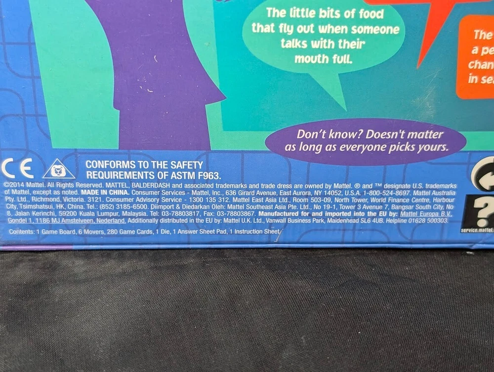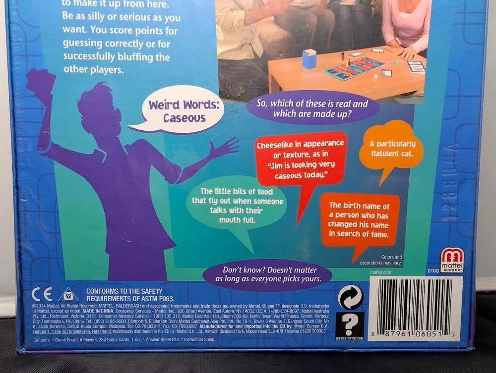 Country/Region of Manufacture:ChinaCustom Bundle:NoGame Title:BalderdashMin. Number of Players:2 playersType:Game BoardTheme:Artgtin13:0020315002506Brand:MattelAge Level:12-16 Years, 17 Years & UpMPN:CFX43Gender:Boys & GirlsCharacter Family:FriendsGame Type:Board GameYear:2014Modified Item:NoRecommended Age Range:12 and olderTitle:BalderdashUPC:0020315002506