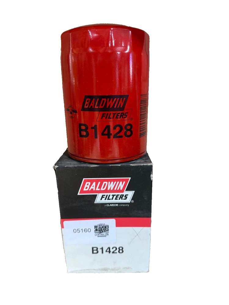 This is a Baldwin Oil Filter B1428, featuring a Spin-On mounting style with a thread diameter of 13/16"-16. It comes with a gasket and is made of metal with a painted finish. The filter has a diameter of 3 11/16 inches and a length of 5 11/32 inches. It is designed for easy installation on the front of a vehicle. The gasket material is rubber, and the filter is manufactured in the United States. No warranty is provided for this new old stock (NOS) item.