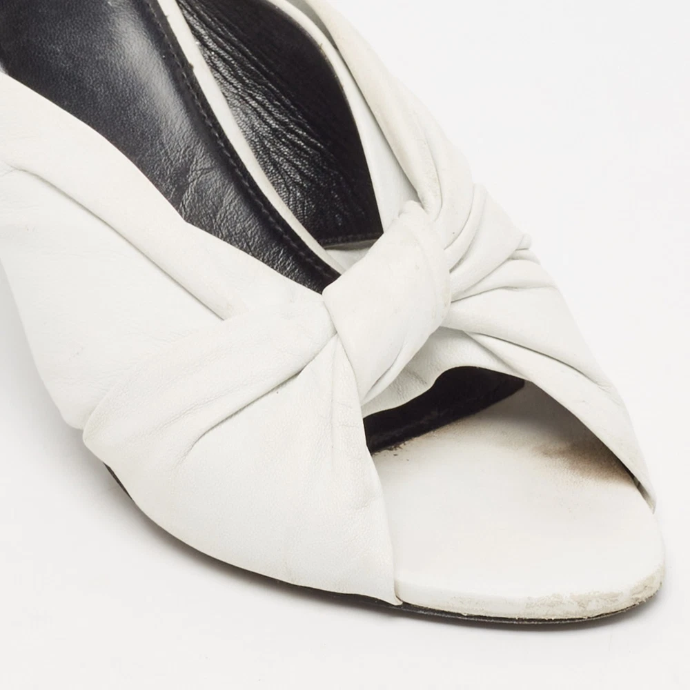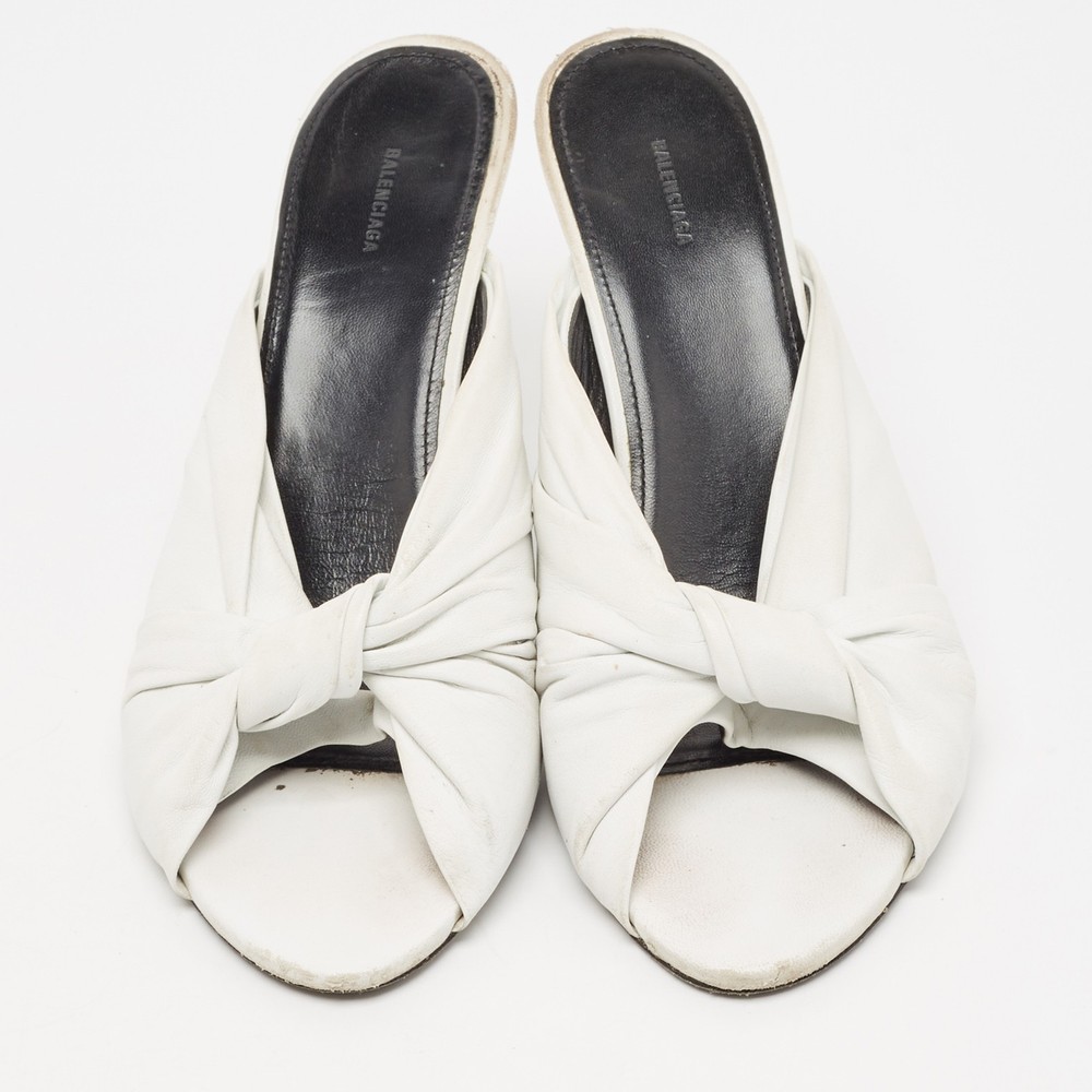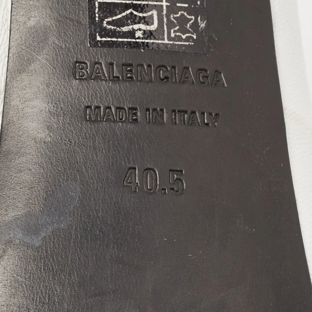 These white sandals will frame your feet in an elegant manner. Crafted from quality materials, they flaunt a classy display, comfortable insoles, and 9 cm heels.Certified by The Luxury Closet - This item has gone through a detailed authentication process overseen by our experts. We offer a lifetime guarantee of authenticity on all our items. Import duties, taxes and charges are not included in the item price. These charges are the buyers responsibility. Please check with your country’s customs office to determine what these additional cost will be prior to buying. Our eBay Store About Us Contact Us Add to Favorite Sellers Balenciaga White Leather Knot Open Toe Slide Sandals Size 40.5 $174.9 These white sandals will frame your feet in an elegant manner. Crafted from quality materials, they flaunt a classy display, comfortable insoles, and 9 cm heels. Product Details Brand Color White Dimensions Material Leather Size 40.5 Outsole Width 9 cm Outsole Length 26 cm Heel Height 9 cm Includes Original Dustbag Certified by The Luxury Closet This item has gone through a detailed authentication process overseen by our experts. We offer a lifetime guarantee of authenticity on all our items. How We Check The in-house team of experts at The Luxury Closet is highly trained to verify the authenticity and the condition of the luxury products. They ensure that only 100% authentic items are put on sale.The evaluation process is unique with its own mix of assessment criteria and differs according to the category. Each item is evaluated based on the following combination of hallmarks, hardware, stitching, symmetry, material, craftsmanship, stamping, codes, hologram stickers, and packaging. Our authenticators also check if the items have been modified or amended (e.g., aftermarket diamonds, replaced batteries, repaired bags, etc.) International Buyers Import duties, taxes and charges are not included in the item price. These charges are the buyers responsibility. Please check with your country’s customs office to determine what these additional cost will be prior to buying.
