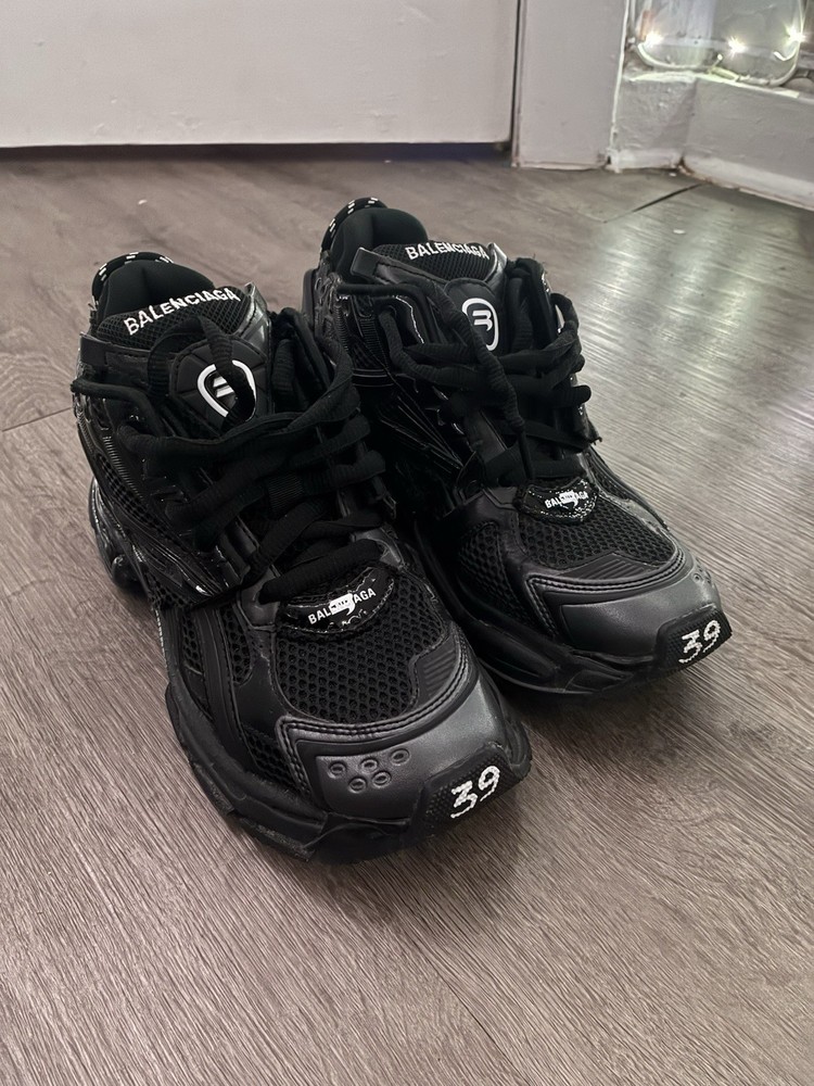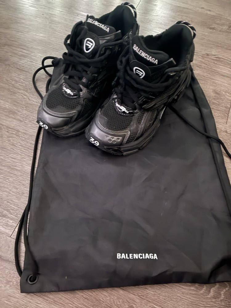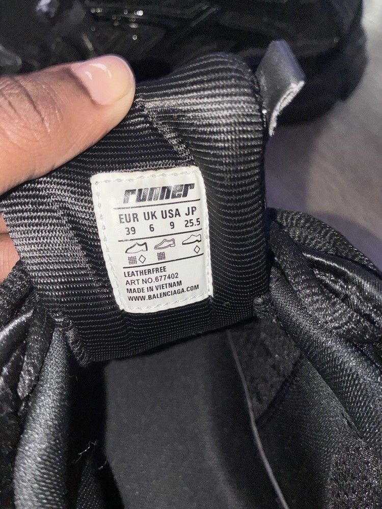 Model: Balenciaga Runner Style Code: 677402 Upper Material: Synthetic, Mesh Brand: Balenciaga Silhouette: Balenciaga Runner Black Style: Sneaker Outsole Material: Rubber US Shoe Size: 9 Type: Athletic Pattern: Solid Department: Men Occasion: Casual, Activewear Performance/Activity: Walking Color: Black Product Line: Balenciaga Runner Season: Fall, Winter, Spring, Summer UK Shoe Size: 6 Shoe Shaft Style: Low Top Closure: Lace Up EU Shoe Size: 39 Lining Material: Fabric