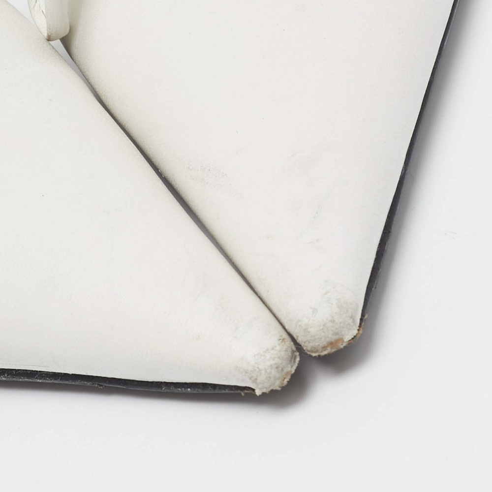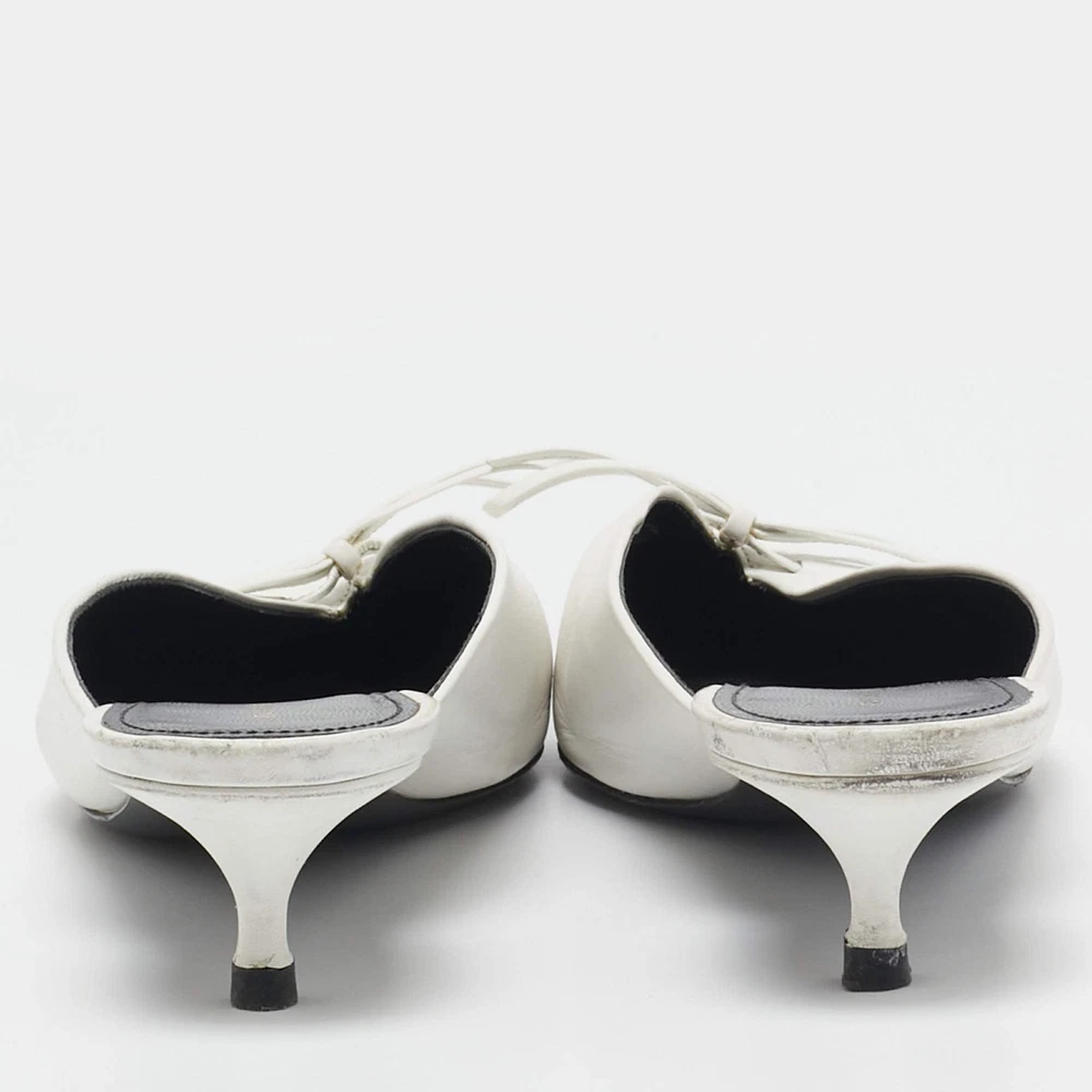 Our eBay Store About Us Contact Us Add to Favorite Sellers Balenciaga White Leather Knife Bow Mules Size 38.5 Balenciaga’s Knife Bow mules in crisp white leather are the epitome of modern minimalism with a sculptural edge. The sharply pointed toe and elegant bow detailing create a striking silhouette that’s perfect for elevating evening or daytime looks. Product Details Brand Balenciaga Color White Includes The Luxury Closet Packaging Outsole Length 27 cm Outsole Width 8 cm Size 38.5 Certified by The Luxury Closet This item has gone through a detailed authentication process overseen by our experts. We offer a lifetime guarantee of authenticity on all our items. How We Check The in-house team of experts at The Luxury Closet is highly trained to verify the authenticity and the condition of the luxury products. They ensure that only 100% authentic items are put on sale.The evaluation process is unique with its own mix of assessment criteria and differs according to the category. Each item is evaluated based on the following combination of hallmarks, hardware, stitching, symmetry, material, craftsmanship, stamping, codes, hologram stickers, and packaging. Our authenticators also check if the items have been modified or amended (e.g., aftermarket diamonds, replaced batteries, repaired bags, etc.) International Buyers Import duties, taxes and charges are not included in the item price. These charges are the buyers responsibility. Please check with your country’s customs office to determine what these additional cost will be prior to buying.