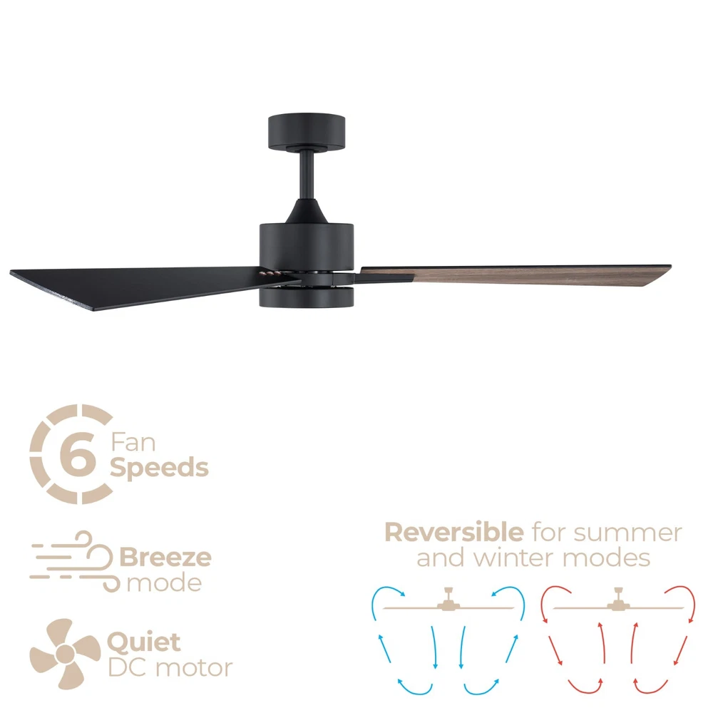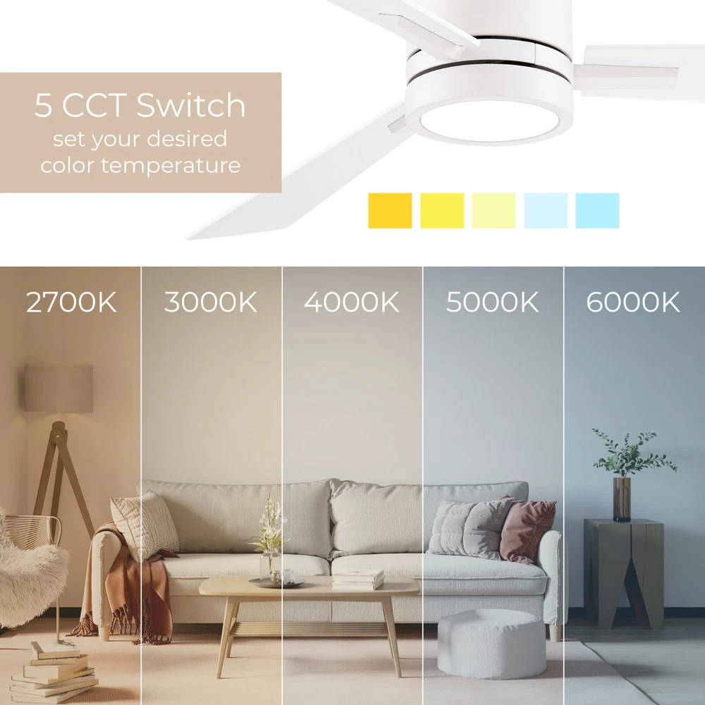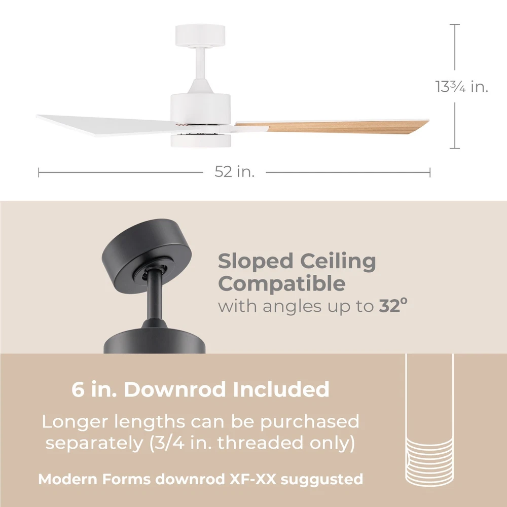 Bali Smart 3-Blade Ceiling Fan 2700K-6000K CCT Selectable LED Light Kit with Remote Control and Reversible Blades Works With iOS or Android App. SMART: APP-enabled controls, download the Smart Life app on your iOS or Android device to adjust fan speed, change light kit color temperature and brightness, set schedules, grouping, and toggle summer/winter mode. LOCAL CONTROLS: Installs onto an on/off wall switch to easily switch power on and off. Includes an intuitive white remote control with wall mounting cradle for seamless controls of all basic fan and light functions. EFFICIENT AND SILENT: Powered by ultra-efficient and completely silent 6-Speed Reversible DC motor, these fans are up to 70% more energy-efficient than traditional fans and undergo rigorous testing to ensure smooth, wobble-free performance. CUSTOMIZABLE LIGHTING: Features a replaceable LED luminaire with brightness control range 100% to 10% and multiple color temperature range (2700K-6000K and everything in-between). CERTIFICATIONS & INSTALLATION: ETL, cETL, UL, cUL, and CSA certified for covered indoor or outdoor use. Compatible with sloped ceilings up to 32 degrees. Includes a 6in downrod, additional downrods can be purchased separately for longer lengths. Suggest: Modern Forms Downrod XF-XX. STANDARDS: ETL & cETL UL #1598 Listed for Wet Locations. Five year manufacturer's warranty.