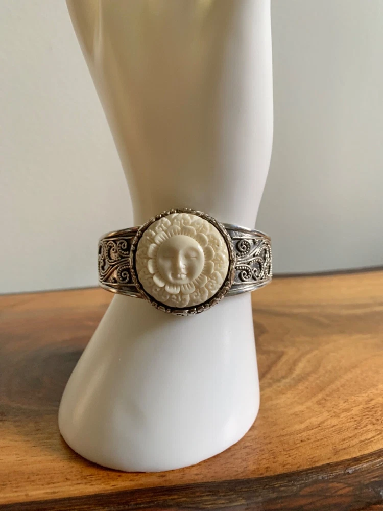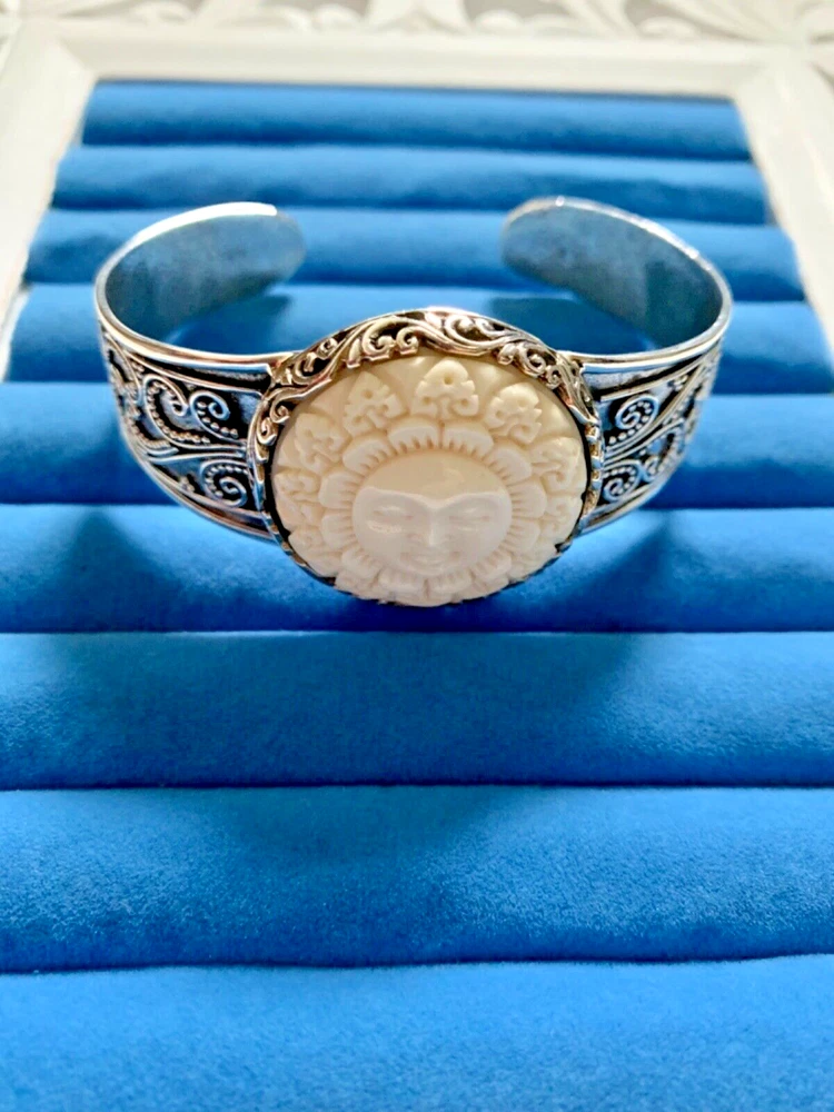 Add a touch of elegance to your wrist with this stunning Bali Goddess Carved Cuff Bracelet. The cream-colored stone is beautifully complemented by the sterling silver metal, making it a perfect accessory for any outfit. The cuff style adds a unique touch to the bracelet, making it stand out from other pieces. The 7.50-inch size ensures a comfortable fit for most wrists. This handcrafted piece is made with 925 metal purity, ensuring its high quality. The Bali Goddess Bracelet is a must-have for any jewelry collection. Was: $159.99 On Sale: $119.88