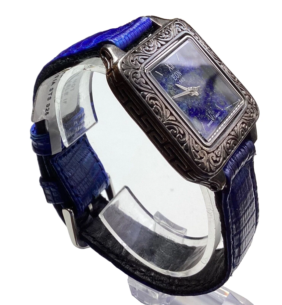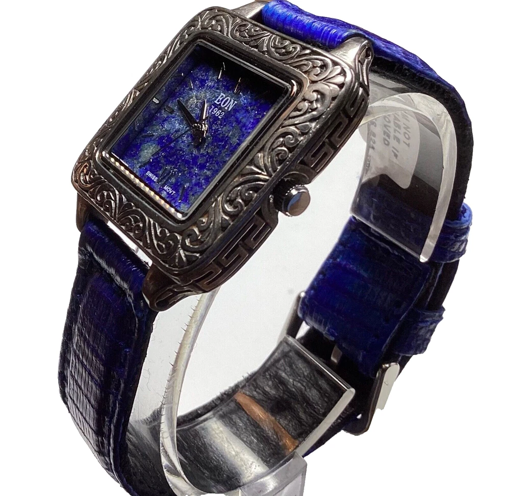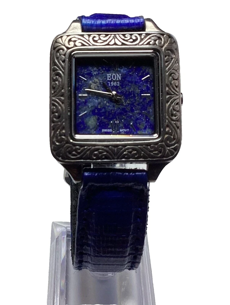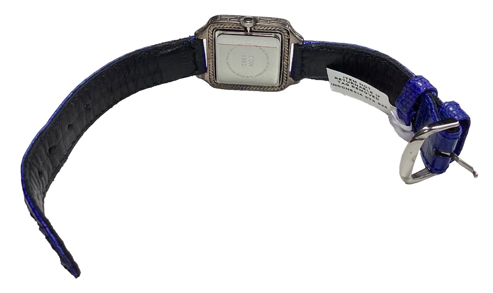 This stunning Bali Legacy Eon 1962 wristwatch is a perfect addition to any collection. Crafted with Swiss precision and attention to detail, this watch features a square shape with a fixed blue Lapis Lazuli bezel and Roman numeral indices. The watch is powered by a quartz movement and comes with features such as water-resistance up to 3 meters, a push/pull crown, and a two-piece leather strap with a buckle closure. The watch is made of sterling silver and has a silver case color with a snap caseback. It is suitable for women with wrist sizes between 7.26-7.5 inches and is perfect for any occasion, whether it's a formal dress or a casual day out. This watch is a true classic with a stylish twist, and it is sure to turn heads wherever you go. 1162