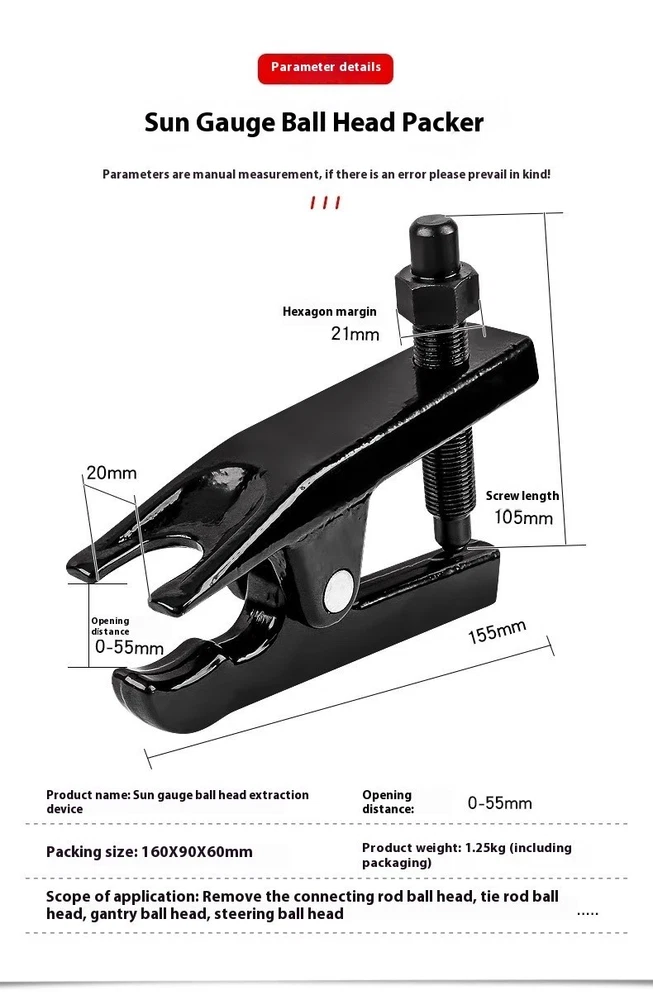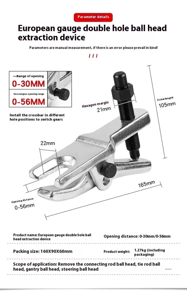 Feature: For separating the ball joint from the spindle support arm front wheel drive vehicles. Universal, it works on most cars and light trucks. Heat treated drop forged, steel body and bolt for long rough usage. Spread ball joints easily from the spindle support arm. No need for excessive hammering, easy to use. Powerful lever action breaks loose even the most stubborn joints. Specifications: Product Name: Ball Joint Separator Usage:For Car Ball Head Puller Removal Tools Type: Separator Puller Extractor Tool Style: European-style /Japanese-style Model: Ball Head Puller Removal Tools Size:As shown in figure Package included: 1 * Ball Joint Separator