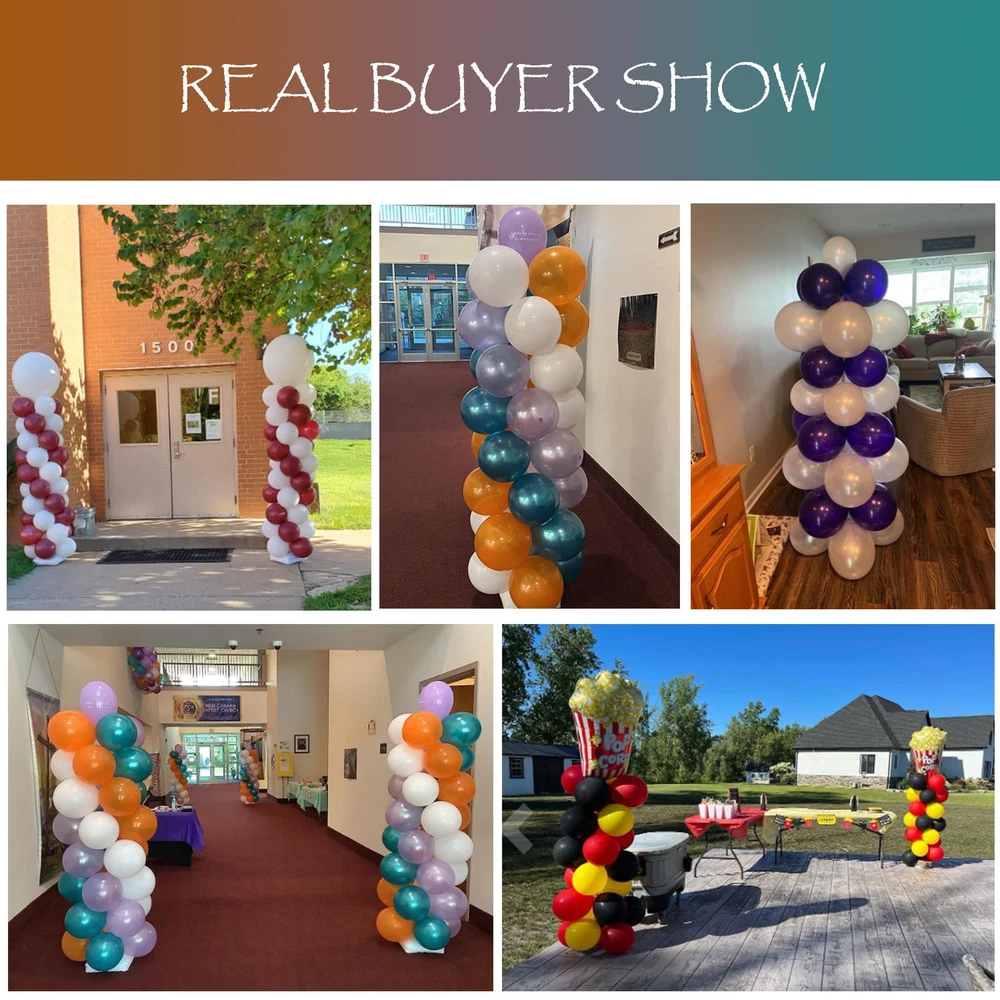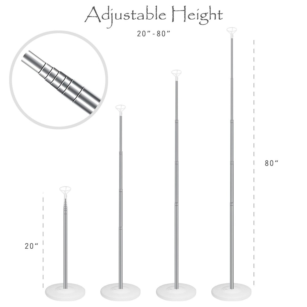 Balloon Column Kit Set of 2 CREATE STUNNING DECORATIONS: Make your parties unforgettable with this balloon stand kit that includes 4 telescopic metal stick,4 top balloon holder,60 Balloon rings,4 water/sand fillable bases. (Balloons not included) QUICK AND EASY ASSEMBLY: No more struggling with complicated balloon tower stands. With this kit, you can assemble balloon towers in just a few minutes. CUSTOMIZABLE HEIGHT: The telescopic design allows you to adjust the height of the balloon column stand from 20” to 80”, making it perfect for any occasion. DURABLE AND STABLE: Made with high-quality PVC and stainless metal, this balloon stand kit is sturdy and won't break easily. We've also improved the thickness of the telescopic metal stick to make it more durable and less likely to deform. VERSATILE DECORATION: Perfect for birthdays, weddings, graduations, baby showers, gender reveal parties, Christmas, and more. Make your events unique with this balloon stand kit.