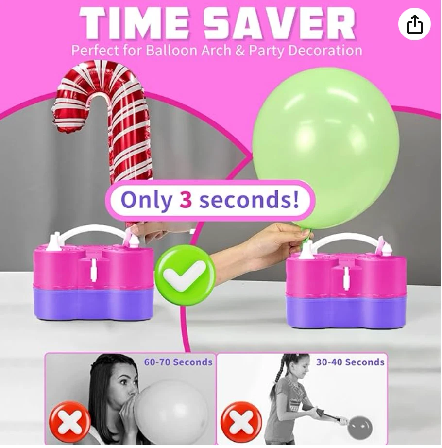 3-IN-1 Electric Air Pump - Streamline your party preparations and daily tasks with this powerful and versatile tool. The upgraded air pump is reliable, easy to use, and efficient, designed to meet all your needs. It functions as a balloon inflator, an inflation/deflation pump for inflatables, and a vacuum pump for storage bags. With its multifunctional design, it is an essential tool for home use, parties, and travel. Balloon Pump for All Balloons - Featuring two separate motors, this purple and pink electric balloon pump comes with two distinct inflation ports. One port efficiently inflates standard latex balloons, while the other is tailored for 260Q long balloons, foil balloons, double-stuffed, and smaller balloons. Offering both manual and automatic operation, the push-down mode ensures controlled inflation to prevent bursting, while the continuous mode is perfect for inflating multiple balloons quickly. Super Fast Inflation & Deflation - Experience powerful, high-speed inflation and deflation with ease. This electric machine pump inflates two balloons in just 3 seconds, deflates vacuum storage bags in 30 seconds, and inflates large pool floaties in just 5 minutes. Equipped with anti-slip pads for stability, ensuring a smooth and fast balloon setup for any event. Ideal for making balloon arch garland. Great for Christmas, Halloween, wedding, birthday baby shower and other celebrations. 5 Nozzles for Multi-Purpose Use - Equipped with five versatile nozzles, this balloon inflator pump is perfect for a wide range of inflatables. Ideal for inflating inflatable boats, rafts, air mattresses, pool floaties, yoga balls, vacuum storage bags, and more! The lightweight and compact design, combined with an easy-grip handle, a balloon cutter, ensures convenient on-the-go use, making it ideal for travel or on-site event setups. Kind Tips - Ensure that the ventilation holes are unobstructed during use and avoid operating in a closed or high temperature environment. If the pump overheats, stop using it immediately and allow it to cool completely before resuming use. For safe operation, avoid using the balloon blower near water or flammable materials. Please be aware that this pump ONLY fills balloons with AIR - NOT HELIUM or HYDROGEN. The balloons will NOT float. CHOKING HAZARD – Children under 8 yrs. can choke or suffocate on uninflated or broken balloons. Adult supervision required. Keep uninflated balloons from children. Discard broken balloons at once