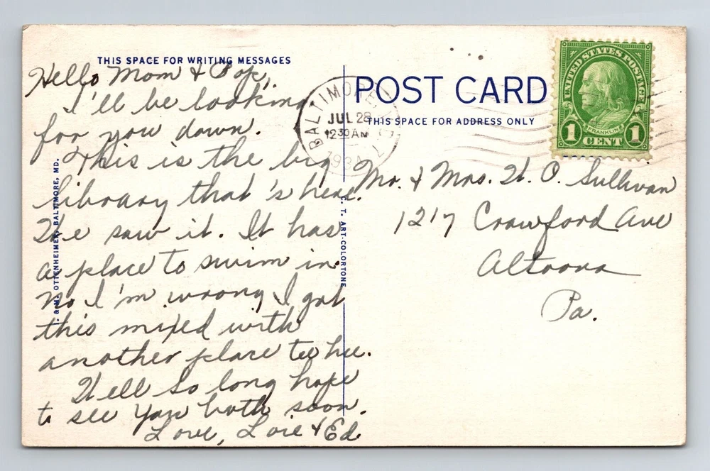 Baltimore MD-Maryland, Enoch Pratt Free Library, Vintage Postcard