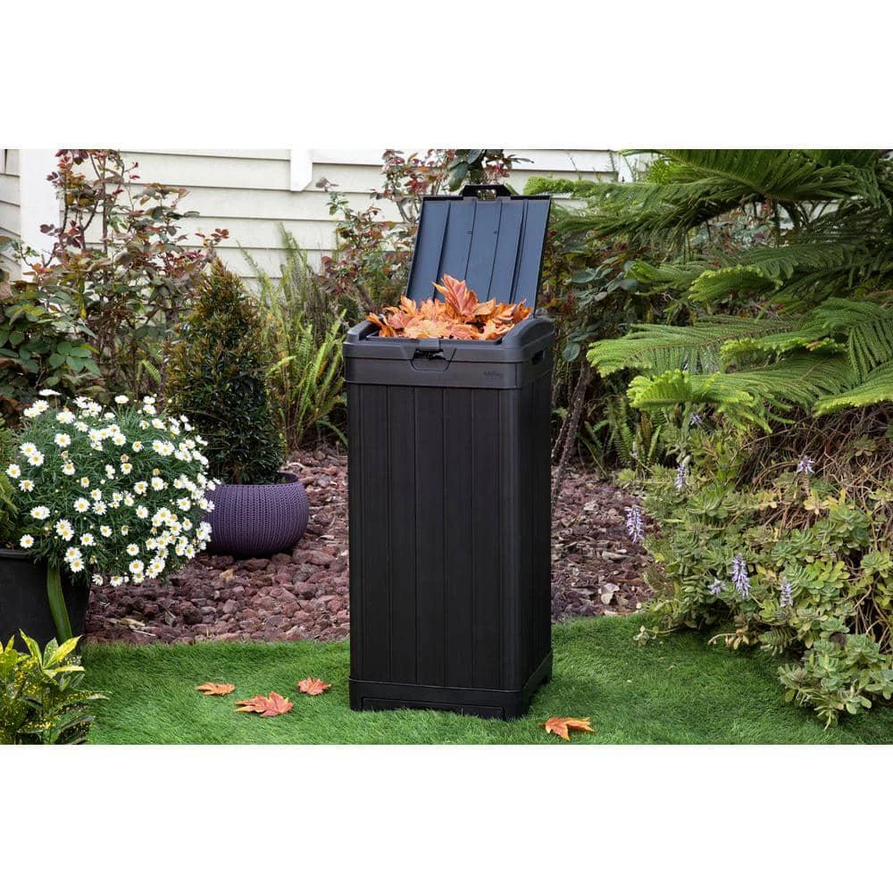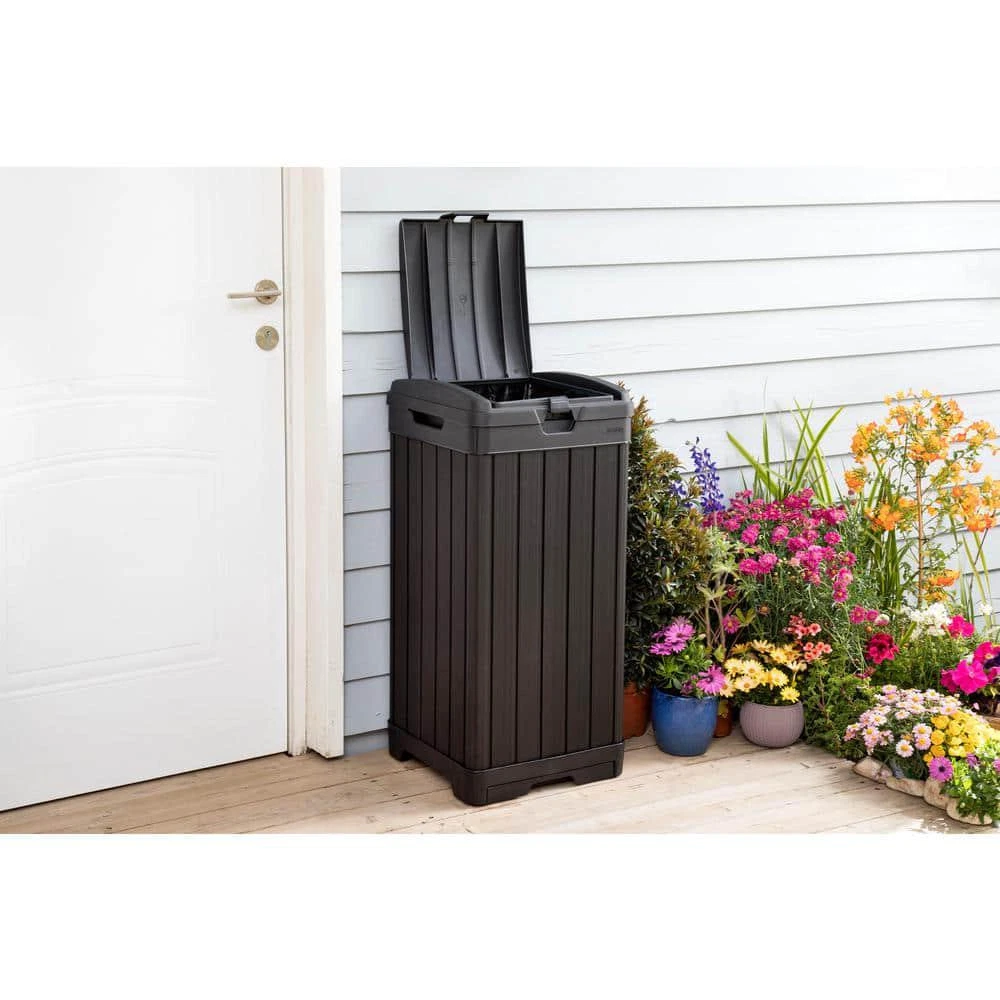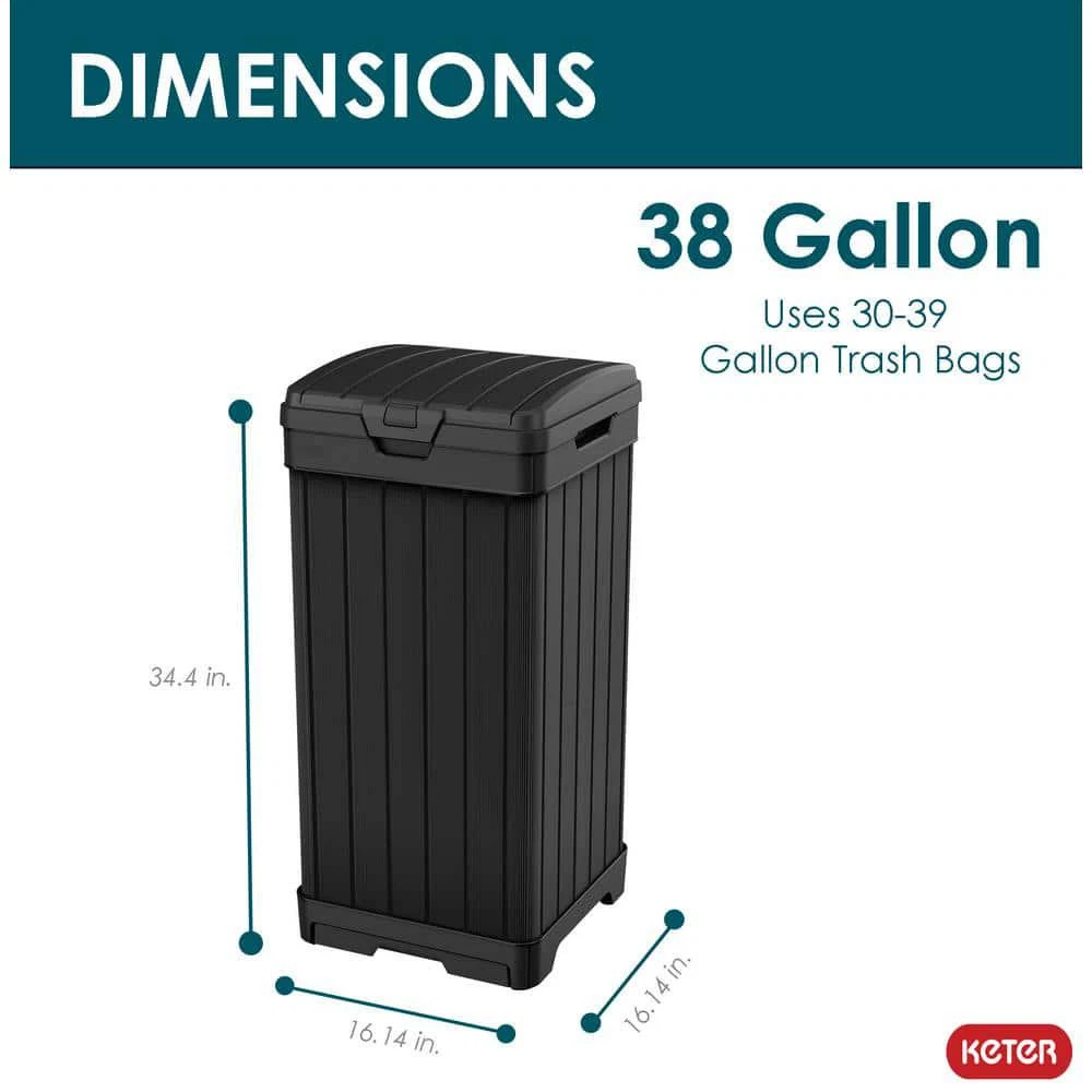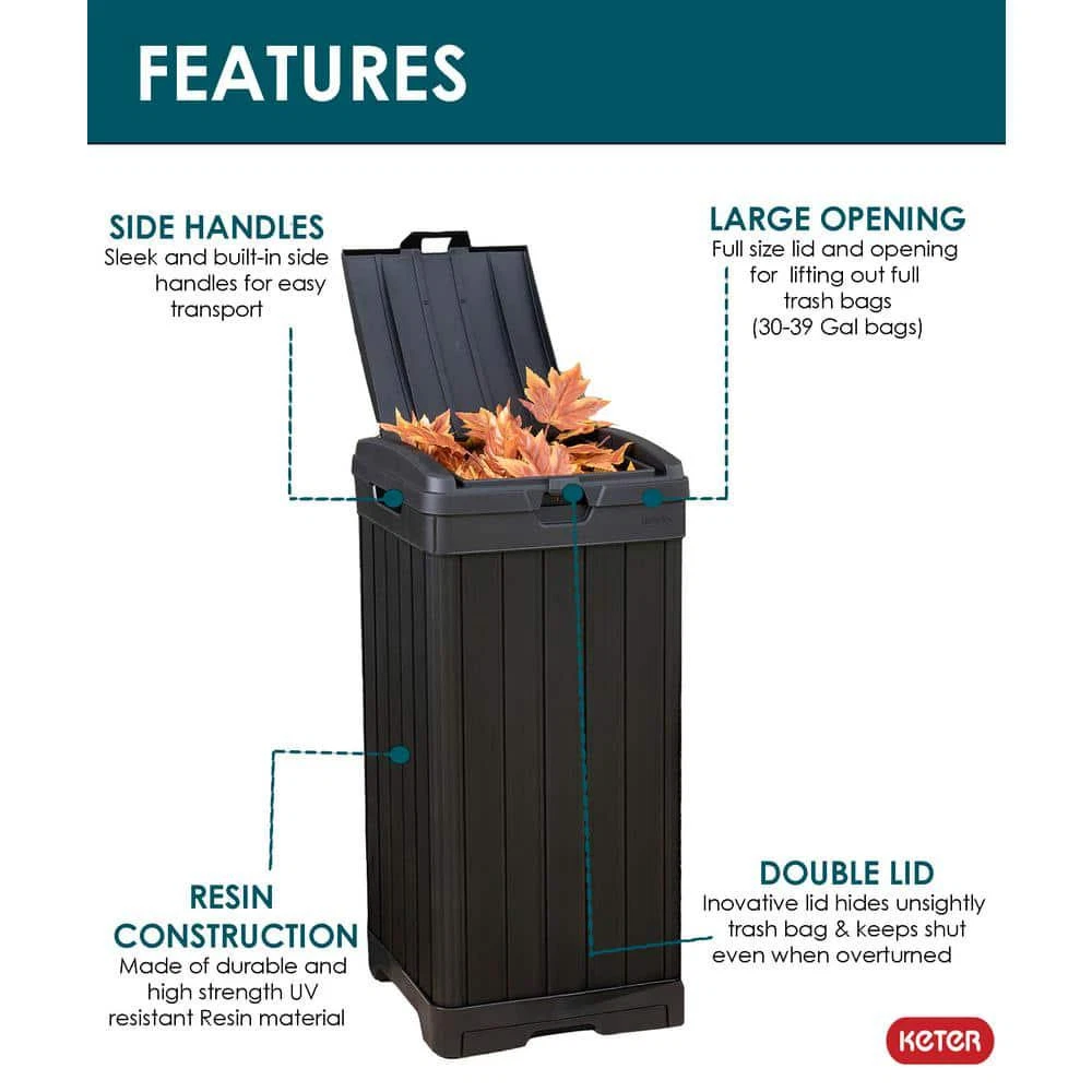 Baltimore Outdoor Waste Bin Measures 34.4 in. H x 16.14 in. W x 16.14 in. D Features a double lid to efficiently conceal trash bags Low-maintenance waste bin resists rotting, rust, or decay Your outdoor waste bin doesn't have to be a hassle or an eyesore, the Keter Baltimore Outdoor Waste Bin is a reliable and elegant alternative to the usual bins. This outdoor trash can is made of a highly durable, weather-resistant resin. Double-walled construction and a double lid ensure that you'll never have a mess all on your sidewalk or driveway if the bin is tipped over. The wood look with black finish allows the waste bin to blend right in with the rest of your house. Use 30 Gal. to 39 Gal. trash bags (not included). Bucket/Tub Material: Plastic Capacity: 39 GA-Gallon Color: Black Color Family: Black Indoor/Outdoor: Outdoor Lid/Top Mechanism: Hinged Location: Kitchen Material: Resin Pack Size: 1 Returnable: 90-Day Shape: Square Trash and Recycling Features: Handle(s),Reusable Trash and Recycling Product Type: Trash Can Certifications and Listings: No Certifications or Listings Product Depth (in.): 16.14 in Product Height (in.): 34.4 in Product Width (in.): 16.14 in