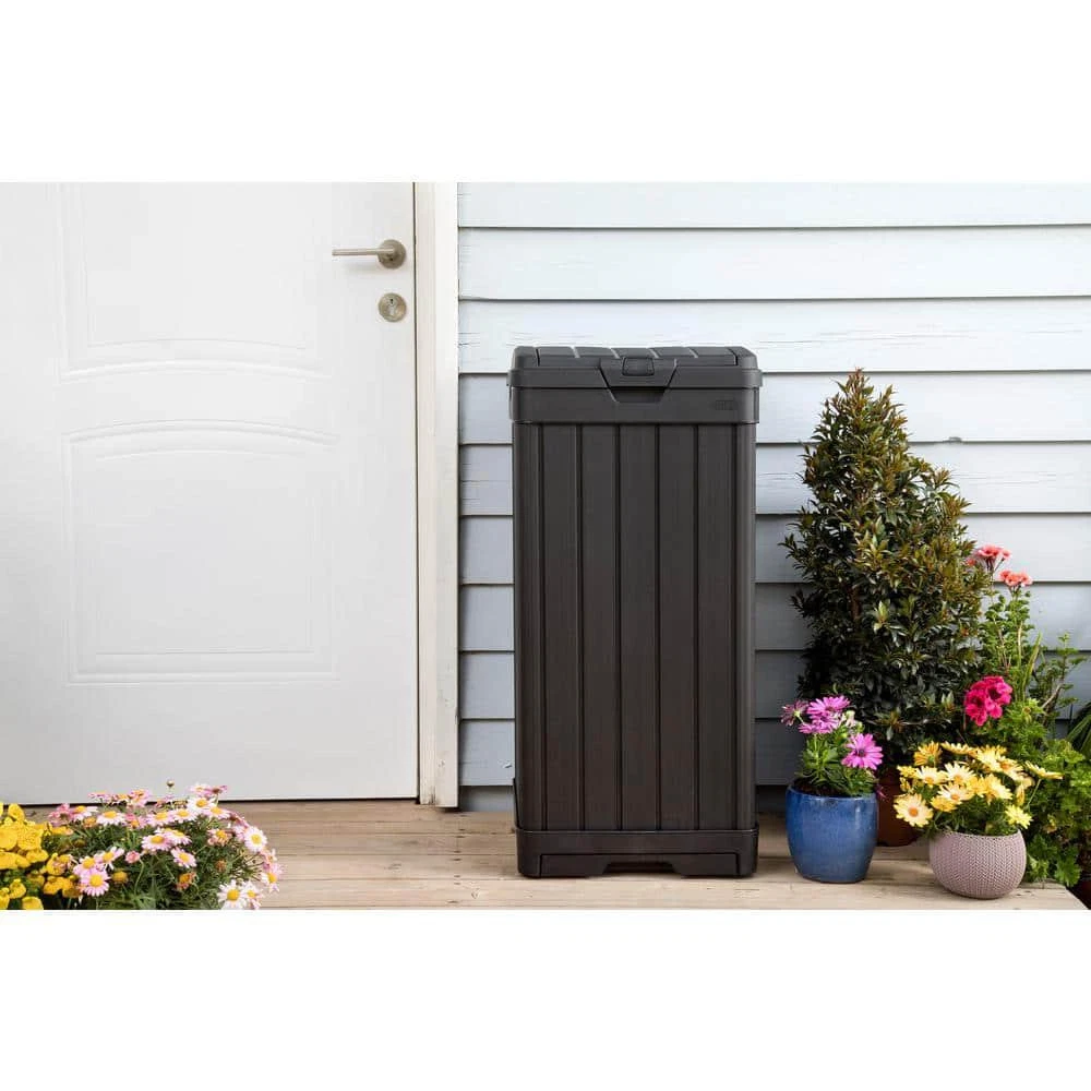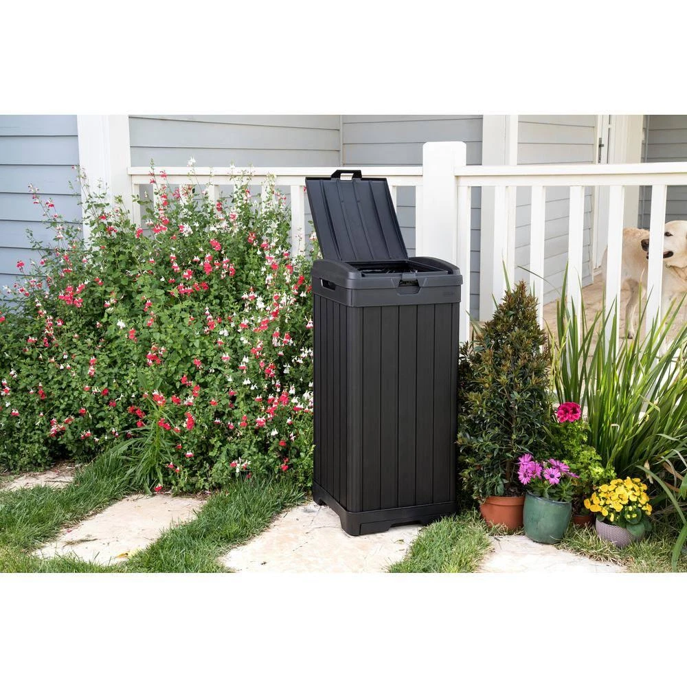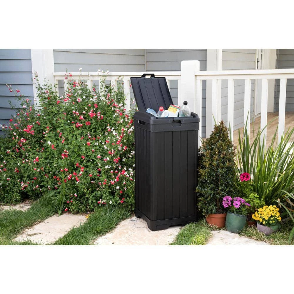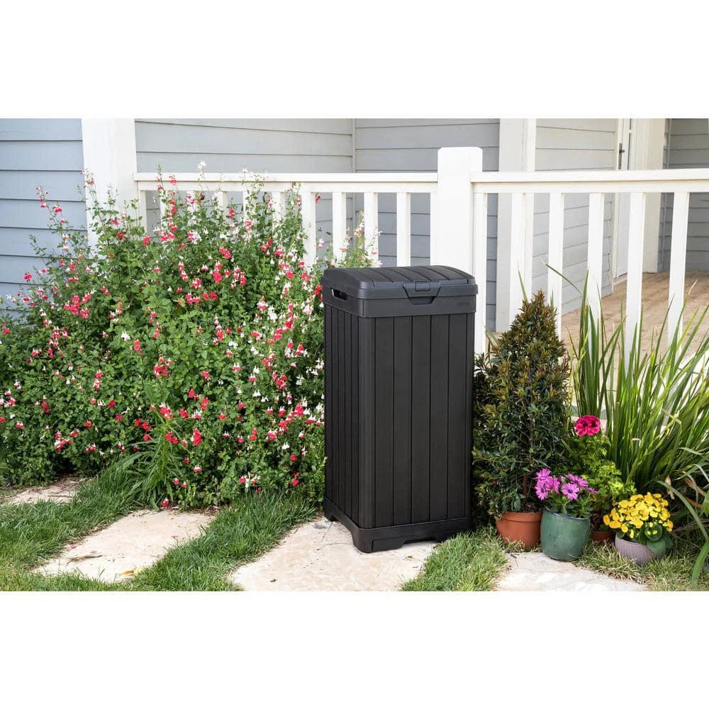 Baltimore Outdoor Waste Bin Measures 34.4 in. H x 16.14 in. W x 16.14 in. D Features a double lid to efficiently conceal trash bags Low-maintenance waste bin resists rotting, rust, or decay Your outdoor waste bin doesn't have to be a hassle or an eyesore, the Keter Baltimore Outdoor Waste Bin is a reliable and elegant alternative to the usual bins. This outdoor trash can is made of a highly durable, weather-resistant resin. Double-walled construction and a double lid ensure that you'll never have a mess all on your sidewalk or driveway if the bin is tipped over. The wood look with black finish allows the waste bin to blend right in with the rest of your house. Use 30 Gal. to 39 Gal. trash bags (not included). Bucket/Tub Material: Plastic Capacity: 39 GA-Gallon Color: Black Color Family: Black Indoor/Outdoor: Outdoor Lid/Top Mechanism: Hinged Location: Kitchen Material: Resin Pack Size: 1 Returnable: 90-Day Shape: Square Trash and Recycling Features: Handle(s),Reusable Trash and Recycling Product Type: Trash Can Certifications and Listings: No Certifications or Listings Product Depth (in.): 16.14 in Product Height (in.): 34.4 in Product Width (in.): 16.14 in