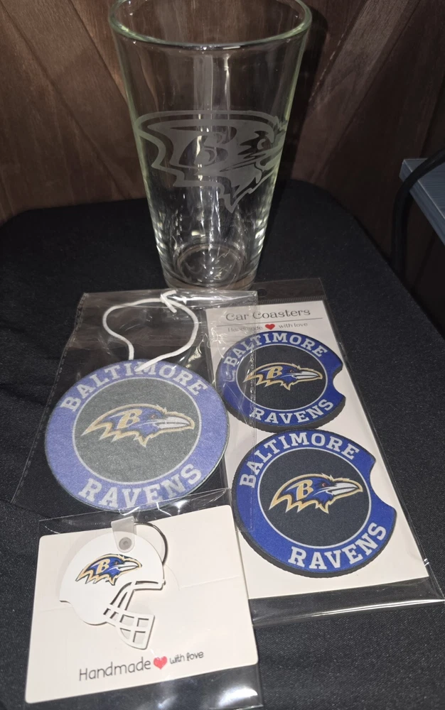 Style: NFL Brand: Handmade Type: Mug Character Family: Baltimore Ravens Set Includes: Beer Mug, key chain, Car coasters, air Freshener Glassware Type: Mug Set Color: Purple