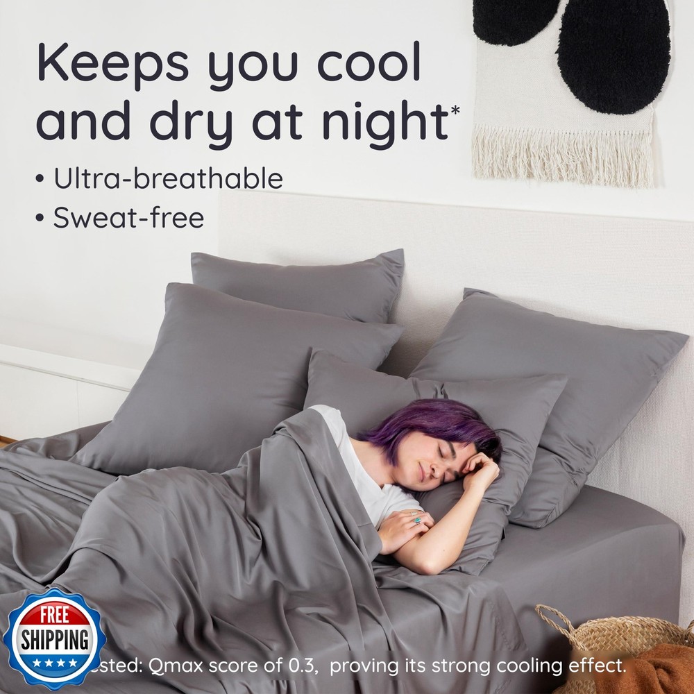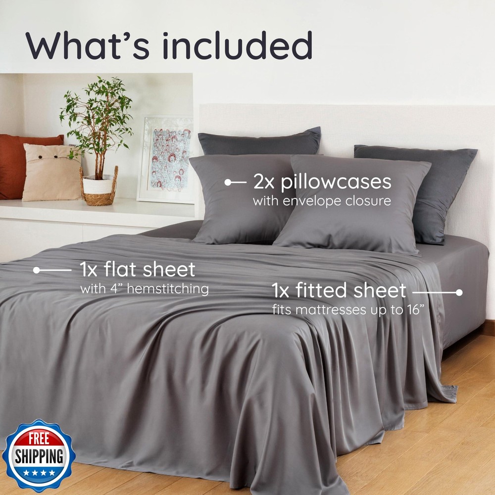 Bambaw King Sheets Set 4pcs, 100% Viscose Derived from Bamboo Sheets, King Size Cooling Sheets Set, Hotel Luxury Bed Sheets Set, Deep Pockets Fits Up to 16'' Mattresses, King Sheets Soft (Dark Gray) Features Imported 100% Viscose Derived from Bamboo: These 100% viscose derived from bamboo sheets king size deliver the purest, most natural luxury. Free from blends with other fabrics or synthetic materials, they are FSC and OEKO-TEX Standard 100 certified, ensuring they are sustainably sourced and as gentle on the environment as they are on your skin. Cooling Comfort: This king size cooling sheets set is designed with thermoregulating fabric that keeps your temperature perfectly balanced. Its breathable properties ensure you stay cool, dry and comfortable. Lightweight and airy, this cooling deep pocket king sheet set is ideal for hot sleepers and those prone to night sweats, delivering year-round comfort. Feel the Difference: Experience a soft sheet set that’s smoother than silk and softer than cotton. The fibers are designed to create a clean and cozy sleep environment for ultimate relaxation. Your Perfect Bedding Set: This 100% viscose derived from bamboo king sheets set includes 1 king fitted sheet (78" x 80"), 1 king flat sheet (108" x 102") and 2 king pillowcases (20" x 36"). The pillowcases feature a sleek 8" envelope closure flap for a polished look and a secure fit, while the flat sheet is finished with an elegant 4" hem. Stay in Place: This fitted sheet accommodates mattresses up to 16" thick, featuring a full elastic band around the edge for a snug and secure fit. Four latex-free corner straps, labeled with placement directions, make setup simple and ensure your sheet stays perfectly in place all night long. Effortless Care & Enduring Quality: Designed for easy maintenance, this sheet set is machine washable at low temperatures on a gentle cycle and tumble dryable on low. The fabric becomes softer with every wash, while resisting pilling and fading for lasting durability. With a 100% customer satisfaction commitment, our dedicated team is here to ensure your complete happiness. Shipping Free & Fast Shipping: We offer free shipping to most of the USA with a normal delivery time of 3-7 days. However, due to the current situation, additional delivery time (up to 3 weeks) may be required for some items. Alternative Carriers: We may use alternative carriers (e.g., USPS, FedEx, UPS) to ensure your package arrives safely and on time. Due to the use of multiple carriers, we are unable to provide a tracking number automatically. Handling Time: Orders are processed and shipped within 1-2 business days of receiving cleared payment. Shipping Restrictions: Shipping to Alaska, Hawaii, Puerto Rico, Guam, and other US territories may incur shipping charges or delivery restrictions. Please contact us before ordering, or your order can be refunded/cancelled. State Restrictions: Certain items may not be shipped to California due to state regulations. Contact for Tracking Updates: If you require tracking updates or have any concerns about the delivery of your order, please feel free to contact us, and we will be happy to assist you. Return Policy 30-Day Hassle-Free Returns: If you are not completely satisfied with your purchase, you can return the item for free within 30 days of receiving it for a full refund or exchange. Easy Return Process: Contact us, and we will provide you with a prepaid return shipping label and detailed instructions. No Restocking Fee: There are no restocking fees for returns. However, the buyer is responsible for return shipping costs if the return is not due to a seller"s error. Refund Processing: Refunds will be processed within 1 business day of receiving the returned item in its original condition. Feedback Your feedback is extremely important to us. We strive to provide the best products and customer service possible. If you are satisfied with your purchase, please take a moment to leave us a positive review. If you have any concerns or issues with your order, please contact us before leaving negative feedback. We are committed to resolving any problems and ensuring your satisfaction. Contact Us If you have any questions or concerns, please feel free to reach out to our customer support team. You can contact us through the eBay messaging system. We are available Monday to Friday, 9:00 am to 5:00 pm EST, and we will do our best to respond to your inquiry within 24 hours. Thank you for supporting our small family business!