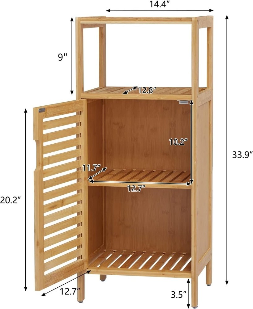 Product Description About this item Ideal for bathroom: The compact size of this bamboo bathroom cabinet makes it perfect for small spaces. Placed in the corner of your bathroom, the bathroom cabinet can well organize all kinds of bathroom supplies, such as towels, shower gel, toothcups, and other items to make your bathroom well organized. At the same time, this small cabinet for bathroom can also be placed in the bedroom, living room, and other places, suitable for a variety of scenes. Exquisite design: This small bathroom cabinet has a sophisticated design that blends well with a variety of decor styles. Both practical and aesthetically pleasing, it adds a sense of ambiance to the space while providing additional storage, especially for bathrooms with small spaces. Natural bamboo product: We have selected high-quality natural bamboo, carbonized and baked to make it stronger and more durable. The shelf is designed to last longer by using a specially crafted, eco-friendly paint. Easy daily cleaning: The processing of waterproof varnish makes your daily cleaning work simple and efficient. A dab with a rag will remove the stain. After daily use, please put the bamboo products in a ventilated and dry place to dry to extend their service life. Simple installation process: We have prepared matching installation tools for you so that you can easily and quickly complete the installation of this perfect product without the need to find out your toolbox. Its quality is far superior to similar products. If quality is your top priority, make sure you choose it! Simple installation process The installation package provides simple installation tools to help you complete the installation more quickly. Five hooks The five attached hooks can be used to hang small items such as towels, scarves, hats, keys and so on. You can freely fit them on either side, which adds extra storage space. Snug handle Hollow-out handle, reasonable use of product internal space, to create a more comfortable use experience. Removable non-slip pad Non-slip pad is removable, you can choose whether to install. bamboo bathroom cabinet No matter be kitchen, bathroom, sitting room, porch, entryway is applicable, improve the quality of life for your family quickly! Brand new quality bamboo cabinet! Classic and simple forest style, primitive log color, this is a beautiful and good quality bamboo storage cabinet. Two levels of open shelving, paired with two levels of separate storage with doors, allow you to place more items. The five attached hooks can be used to hang small items such as towels, scarves, hats, keys and so on. You can freely fit them on either side, which adds extra storage space. Specification: Dimension:12.8" x 14.4" x 33.9" Color: Nature Material: Bamboo Net Weight:15.7 lbs Weight Capacity of Each Layer:6.6lbs On Aug 7, 2025 at 01:36:39 PDT, seller added the following information: