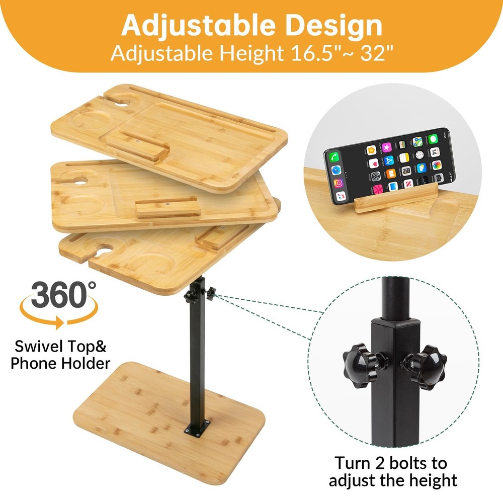 Bamboo Couch Table,Adjustable C Shaped Side Table with Phone Stand,360°Swivel TV Trays for Eating on Couch, Bedroom or Livingroom,Small Spaces,Oblong. Natural Bamboo:Couch table is made of natural bamboo and steel pipe, Bottom has four protective pads,Coated with waterproof paint, Does not corrode in water, Is easy to clean and maintain. Space-Saving:C Shaped Table can slide under a recliner,bed,sofa,chair or bathtub for small Spaces. TV tray table has five storage Spaces, Perfect for phones, tablets, snacks, wine cup, coffee and more. Height Adjustable:Adjustable Side table height is from 18 "to 33". The panel can be rotated 360 degrees.When you are on the sofa or in bed, According to your own preferences, Customize the Angle and height. 360° Swivel Panel with Phone Stand:TV trays for eating on couch,Phone stand allowing you to find the perfect viewing angle without moving, Sofa armrest table can be used as a laptop table. Easy to Install:Swivel tv tray is easy to install, Including installation instructions and installation kit (generally completed in 5 minutes). Perfect for housewarming, a new house, a birthday or Christmas present!