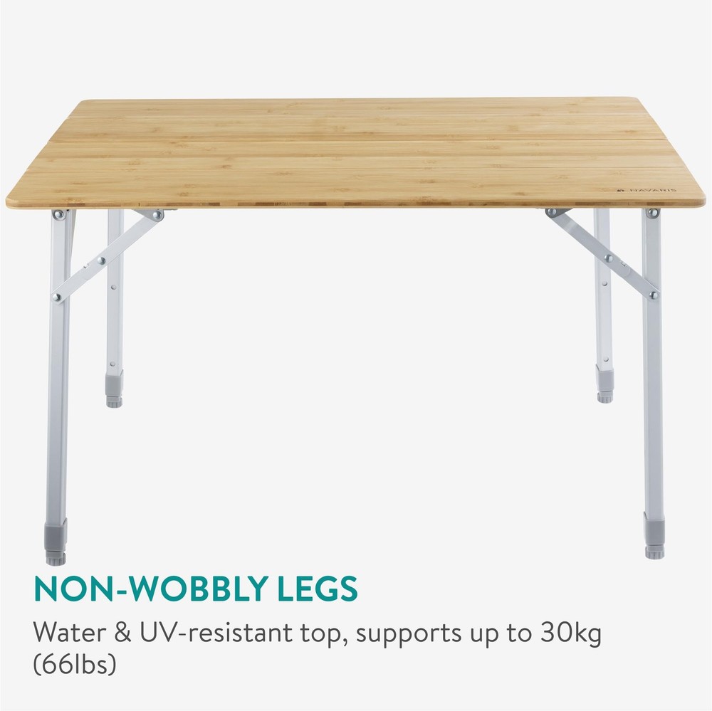 Looking for the right camping tables that fold up for easy transport? Our easy-fold-up adjustable height camping table is a durable and sturdy solution, with an included carry bag for extra convenience. This camping foldaway table has slanted adjustable aluminium telescopic legs so you can adjust to the height that works for you. It makes a great campervan table, fold up picnic table, and beach table — use it on all your outdoor adventures with confidence. Use a clean, soft and damp cloth for cleaning the table top. Remove dirt and sand from the table-legs after use. Otherwise, the height adjustability of the table-legs may be affected by dirt. Do not leave outside when it's raining. Highlights: - Outdoor-Friendly - Easy-Fold & Transport - Water-Resistant Top - Stable Design SPECIFICATIONS Measurements (full size): 31.5" x 25.6" x 23.6" (80 cm x 65 cm x 60 cm) Weight: 9.3 lb (4.2 kg) Maximum load: 66 lb (30 kg) Materials: Bamboo, aluminum Colors: Bamboo top, silver legs Product Info 1x Foldable bamboo camping table 1x Carry bag Perfect for Travel: Our portable camp table is the ideal camping and outdoor event accessory. It's easy to unfold and transport anywhere you need camping tables or a foldable picnic table. Adjustable Height: This bamboo table features smoothly height-adjustable telescopic legs so you can adjust the height to your needs. The table can be adjusted between 42 - 65 cm (16.5 - 25.6"). Strong and Stable: Our strong portable folding table can hold up to 30 kg (66 lb). The legs are designed with a slightly diagonal angle to ensure the table is stable and won't wobble. UV and Water-Resistant: This table is made to last in tough outdoor conditions. The top is water-resistant, so you can easily wipe away any water that splashes on it. It's also UV-resistant to ensure long days in the sun won't ruin its appearance. Foldable Convenience: This bamboo table is easy to fold down and pack away. With an included carrying case, it's incredibly easy to transport and bring wherever your adventures take you.