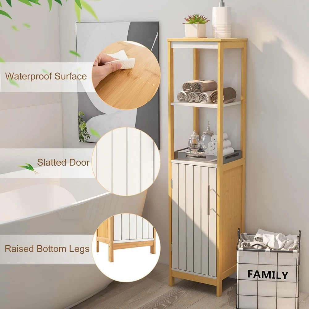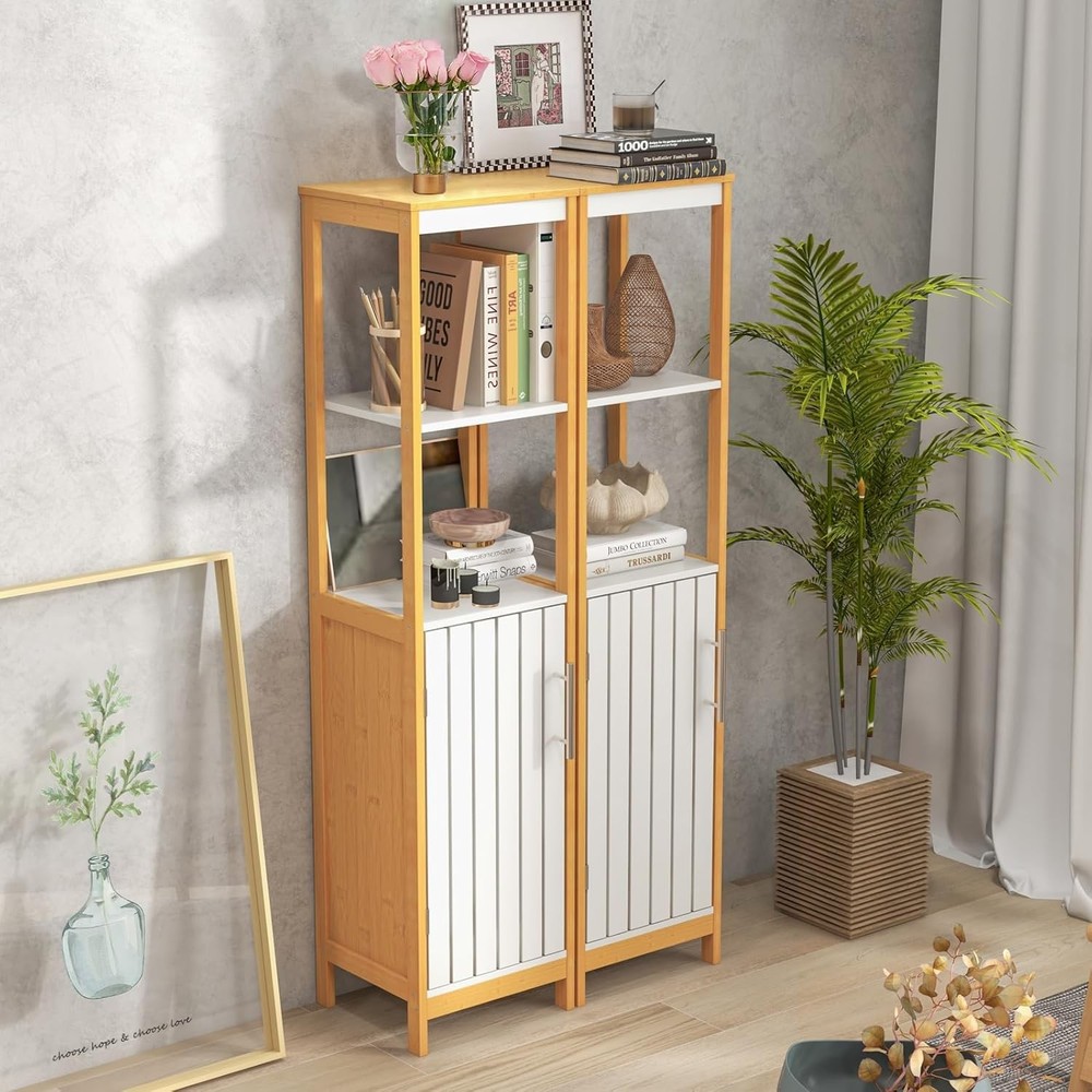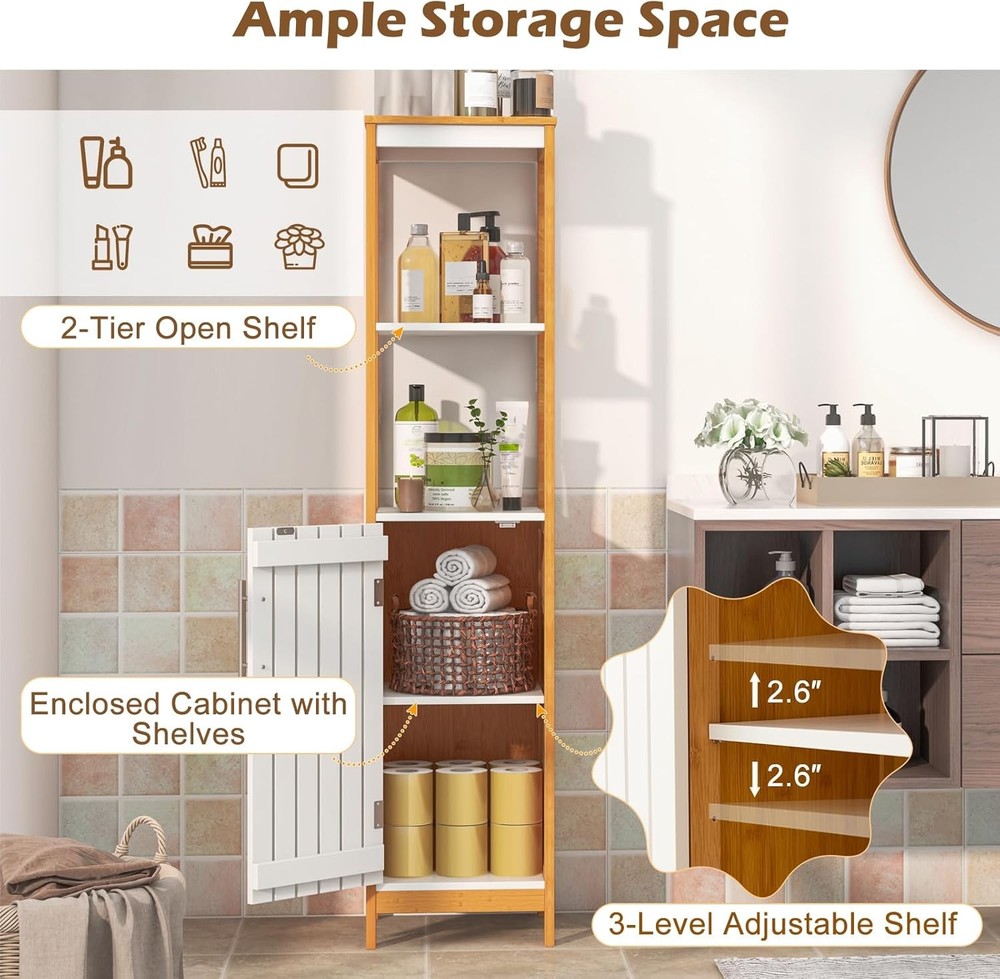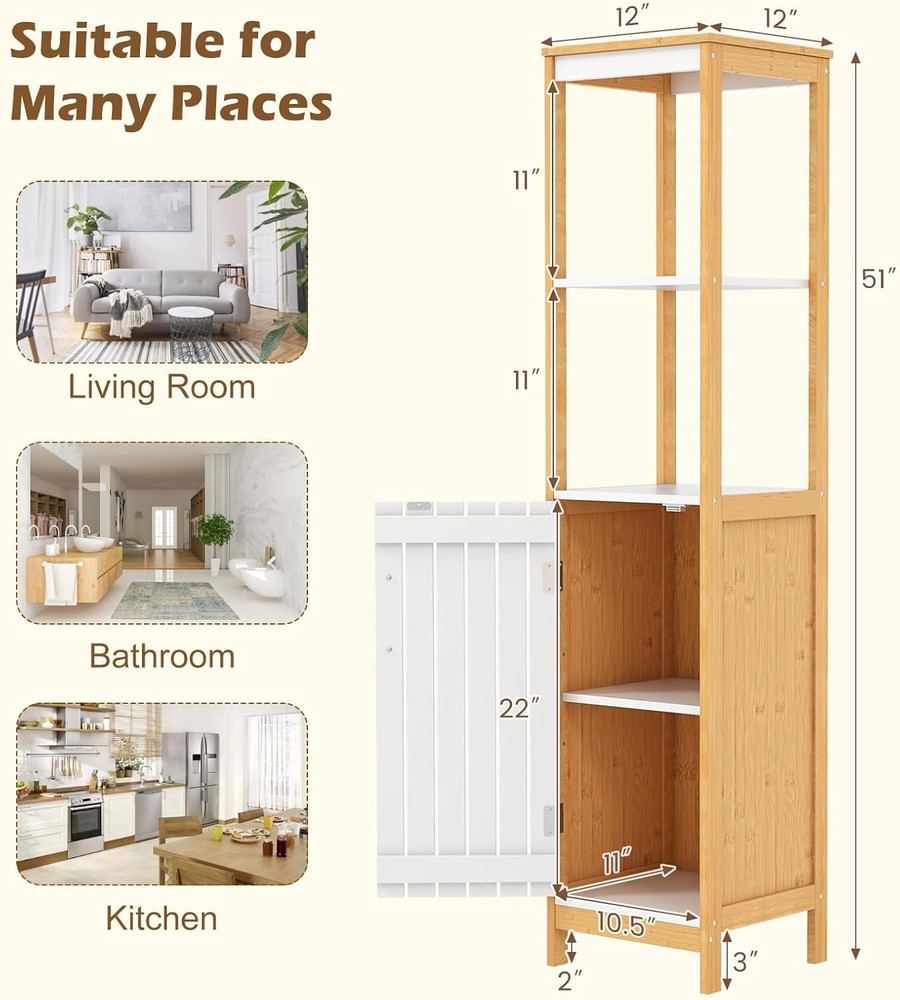Product Description Description: Keep your bathroom clean and clutter-free without sacrificing style using this eye-catching bathroom cabinet! With open shelf, a cabinet with 3-level adjustable shelf, this bathroom storage cabinet offers optimal storage to keep your room organized and tidy. You can also add some plants on the top, a fresh and welcoming bathroom is born. The linen tower is made of premium bamboo and MDF to ensure load-bearing and long-lasting service time. In addition, we provided anti-tip device for safety. With a compact and slim design, this narrow storage shelf can be placed in a small corner in the bathroom, kitchen, or living room. Whether it's toiletries, kitchenware, or other home essentials, our floor cabinet provides a functional and stylish storage solution where you need it. Feature: Natural bamboo for good wear resistance and toughness Tabletop, open shelf and enclosed cabinet with shelves to hold various items 3-level adjustable shelf offers you the flexibility to customize the storage Exquisite handle and magnetic catch for convenient opening and closing Able to serve as a bathroom floor cabinet, side organizer or entryway cupboard Suitable for many places like living room, bathroom, kitchen Smooth and waterproof surface is easy to clean with a cloth Slim and compact enough to fit into small spaces Easy to install with simple instructions and complete packages Specifications: Color: White + Natural Material: Bamboo, MDF Overall Dimension: 12" x 12" x 51" (L x W x H) Weight Capacity: 100 lbs Net Weight: 17.5 lbs Package includes: 1 x Bathroom Cabinet 1 x User Guide On Aug 14, 2025 at 18:32:34 PDT, seller added the following information: