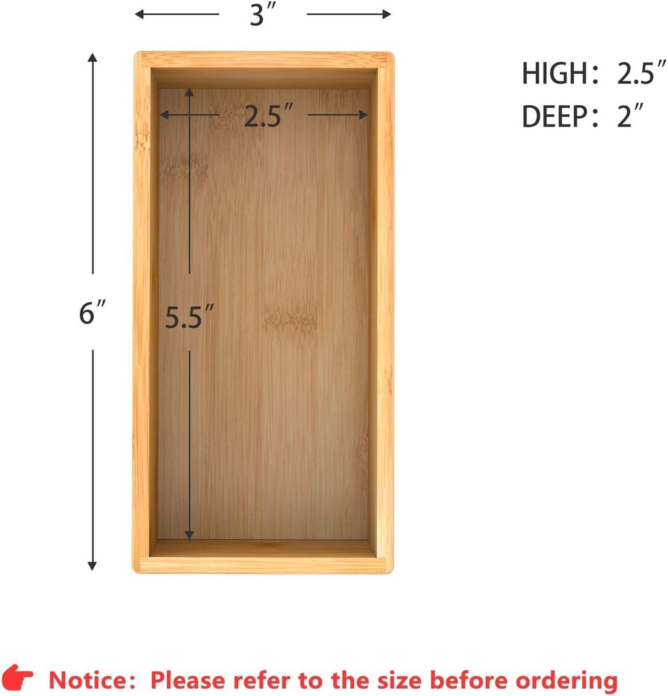 Bamboo Drawer Organizer Utensil Holder for Kitchen, 6*3*2.5 inch, Product Details Specific Uses For Product: Bathroom,Cosmetics,Jewelry,Kitchen,Pens Material: Bamboo Special Feature: Durable Color: Bamboo Brand: Bambloom Finish Type: Polished Product Dimensions: 3"D x 2.5"W x 6"H Shape: Rectangular Capacity: 2 Liters Customer Package Type: Standard Packaging Number of Items: 1 UPC: 691608566007 Manufacturer: Bambloom Item model number: CXG-XXX Is Discontinued By Manufacturer: No Item Weight: 5.9 ounces Country of Origin: China Mounting TypeNumber of Compartments: On,Tables1 [VARIETY OF SIZES]:This series of drawer organizer fits your life exactly the way you want it [DURABLE, ATTRACTIVE] :Fast-growing and sustainable, bamboo is hardy material that doubles as home decor on tables, nightstands, display shelves, and in the living room, bedroom, kitchen and bathroom [USE THEM YOUR WAY] :Tidy junk drawers around the house; store jewelry like necklaces and rings; organize cosmetics like nail polish and lipstick; store needles, threads, and bobbins; or keep pens, paperclips, and staples organized in an office drawer [HIGH QUALITY] :Storage Box constructed of high quality Moso bamboo [THINNED WALLED] :doesn't take up drawer space; fit multiple organizers in single drawer